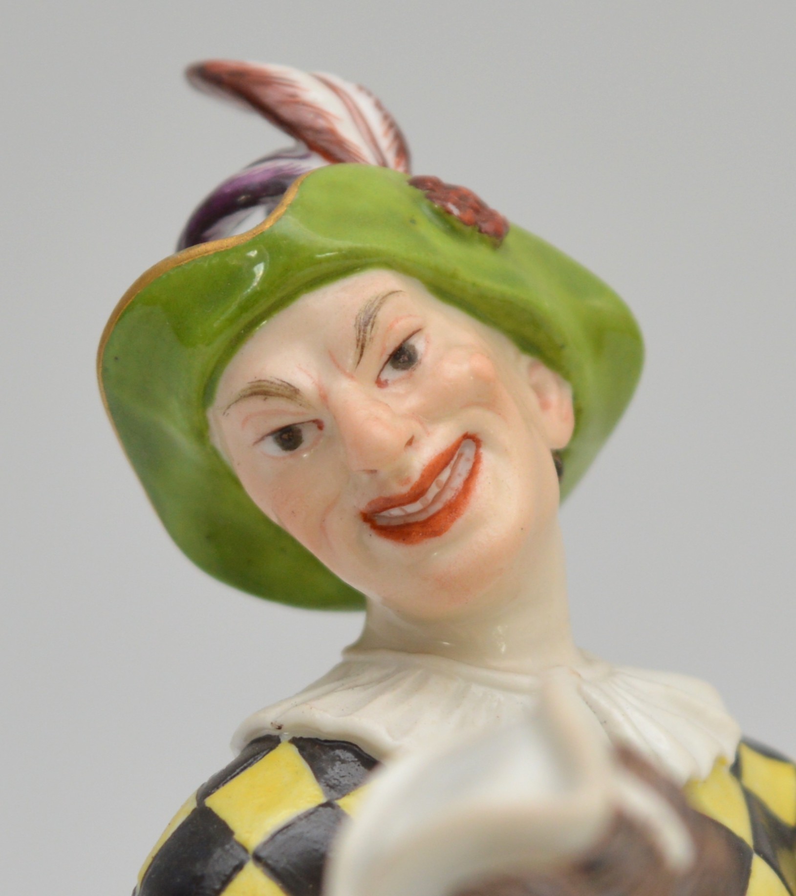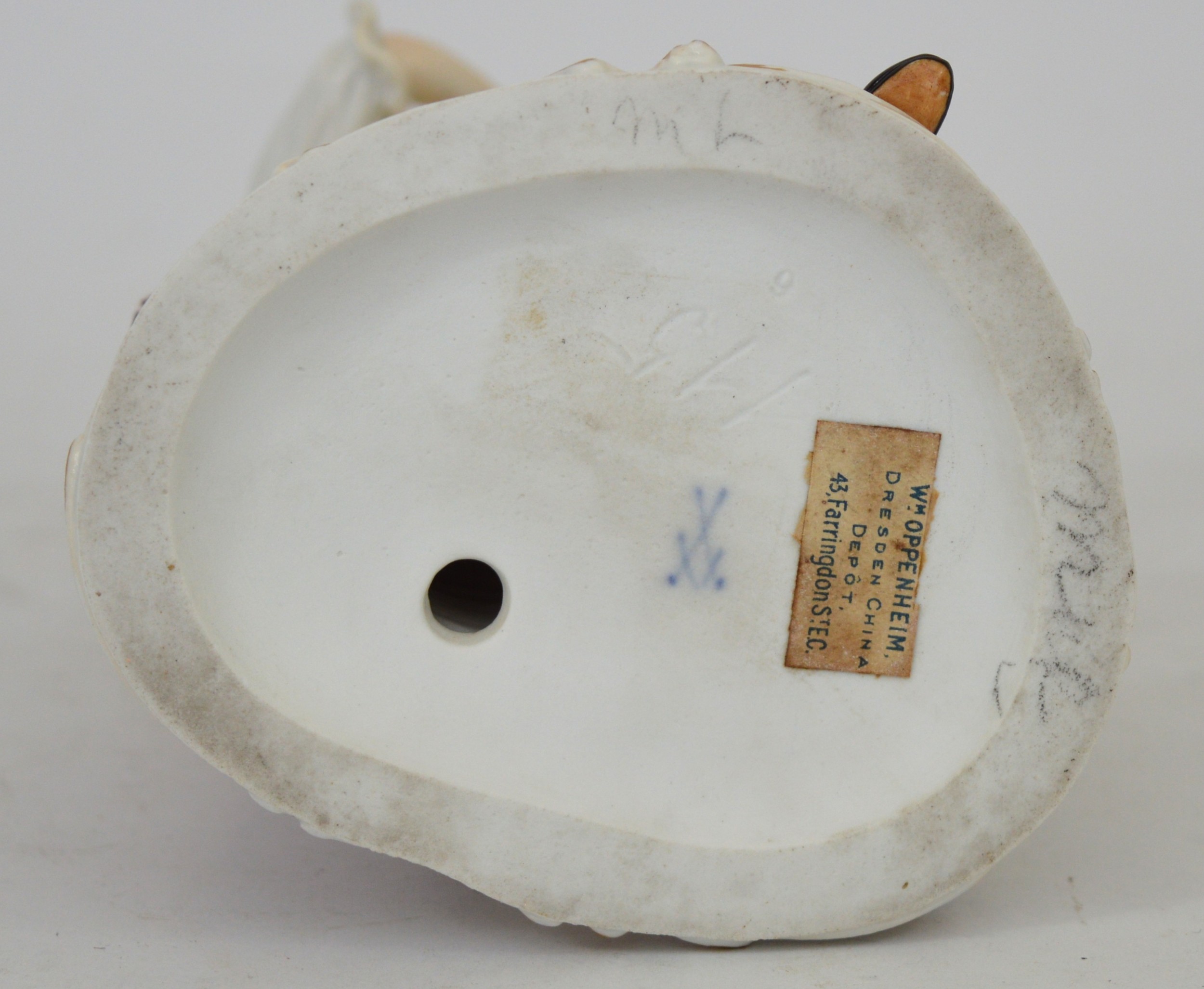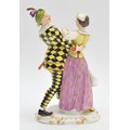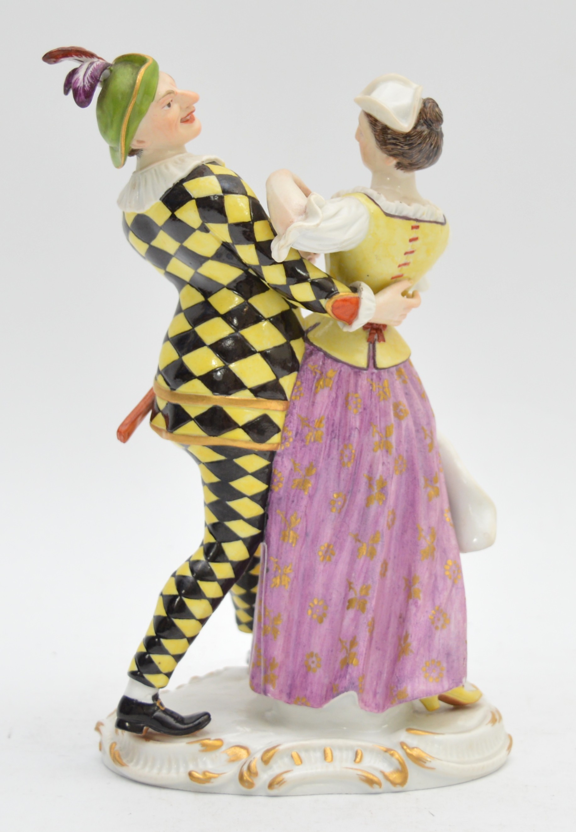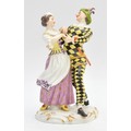 Meissen; c. 19th century, a porcelain figural group depicting a Harlequin and Columbine dancing together with an infant resting on her hip, stamped with crossed blades in underglaze blue, h. 20cm.