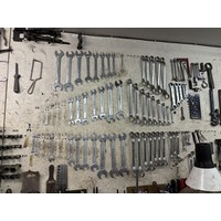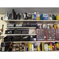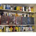 Assorted electrical and other fittings, in the various boxes, assorted fluids and spray cans, all on the wall to the right of the tools