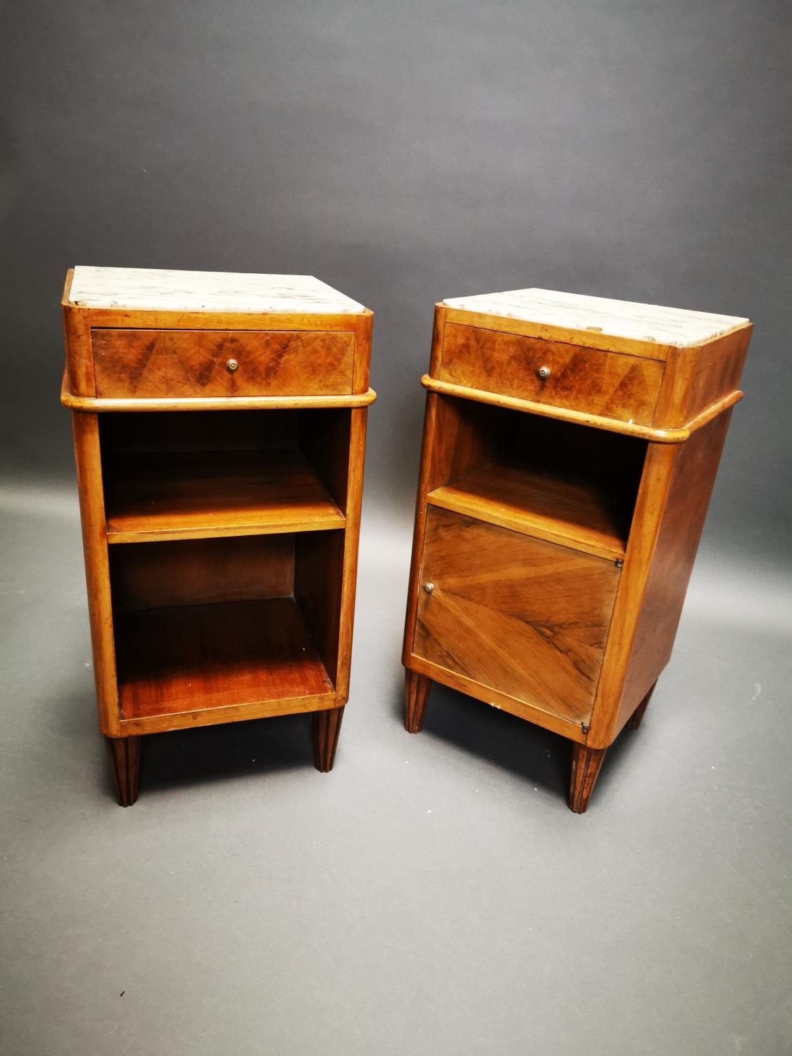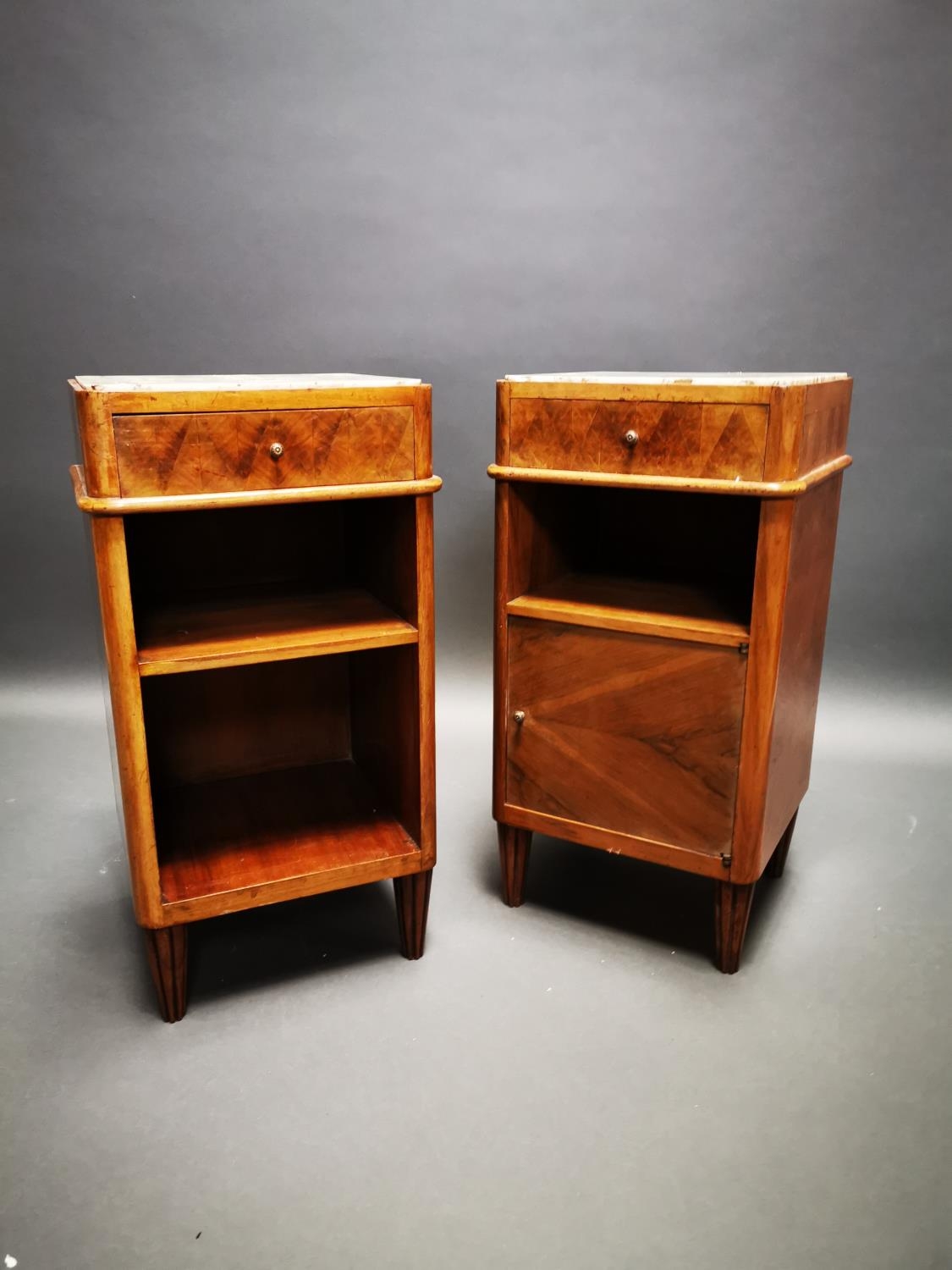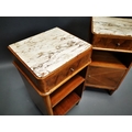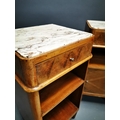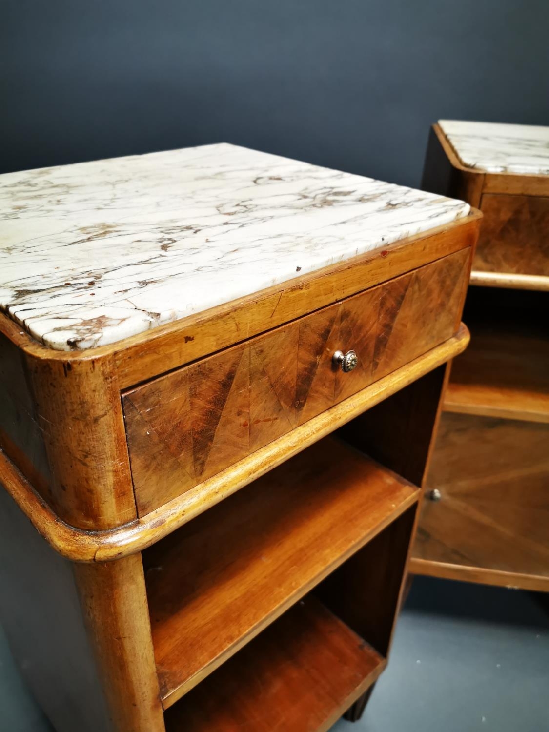 Pair of Art Deco walnut bedside lockers with inset marble tops {71 cm H x 37 cm W x 33 cm D}.