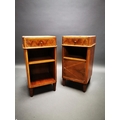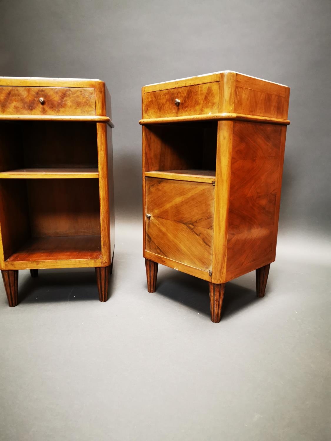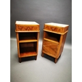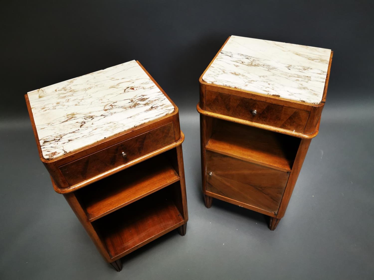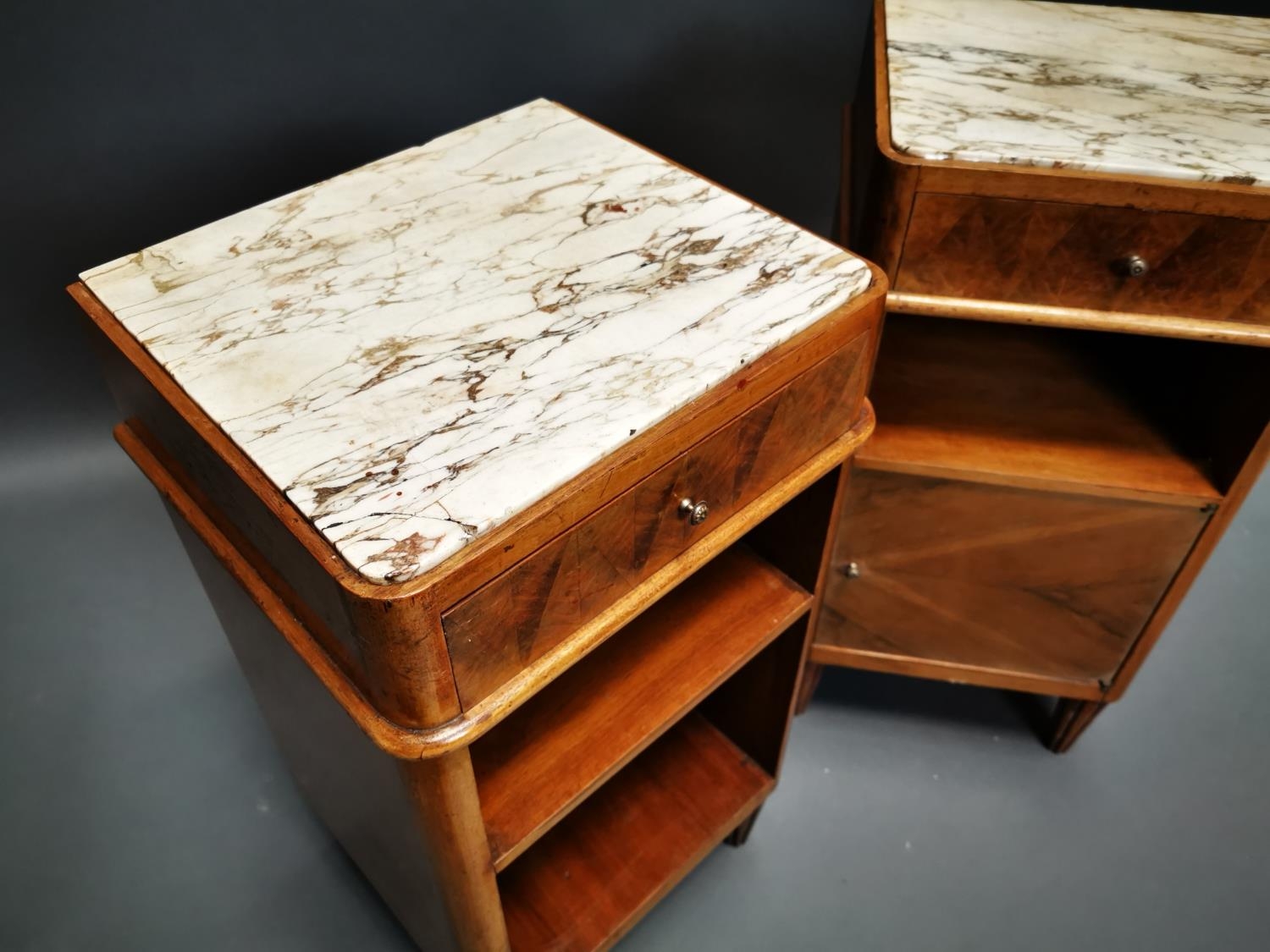 Pair of Art Deco walnut bedside lockers with inset marble tops {71 cm H x 37 cm W x 33 cm D}.
