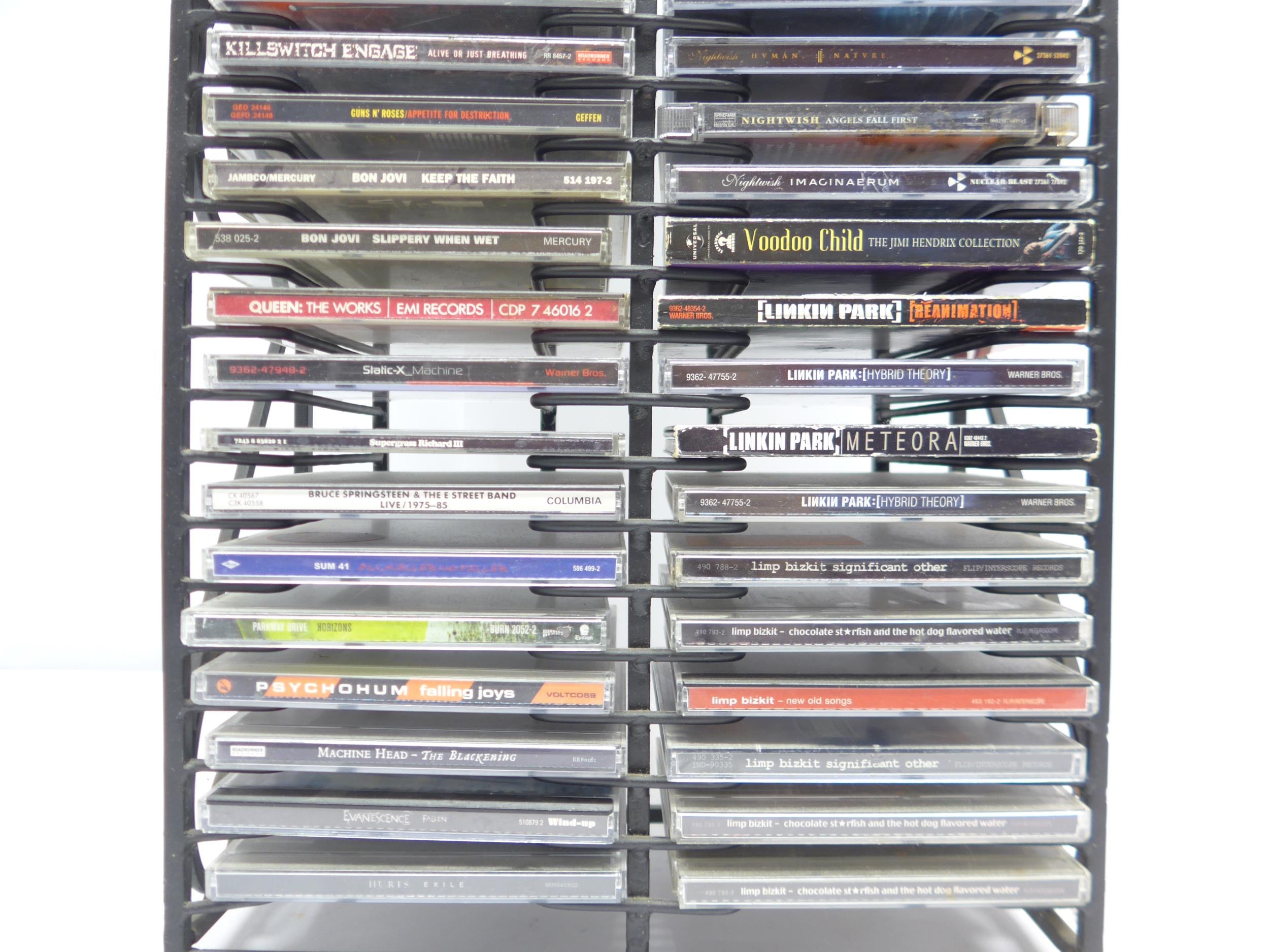 Heavy Metal / Hard Rock CD collection - Approximately sixty CDs, artists include Killswitch Engage, Arch Enemy, Dimmu Borgir, Nightwish, Bon Jovi, Static X, Limp Bizkit, Lacuna Coil, Machine Head, etc (approx. 60, contents unchecked). With a wrought metal CD rack