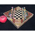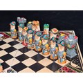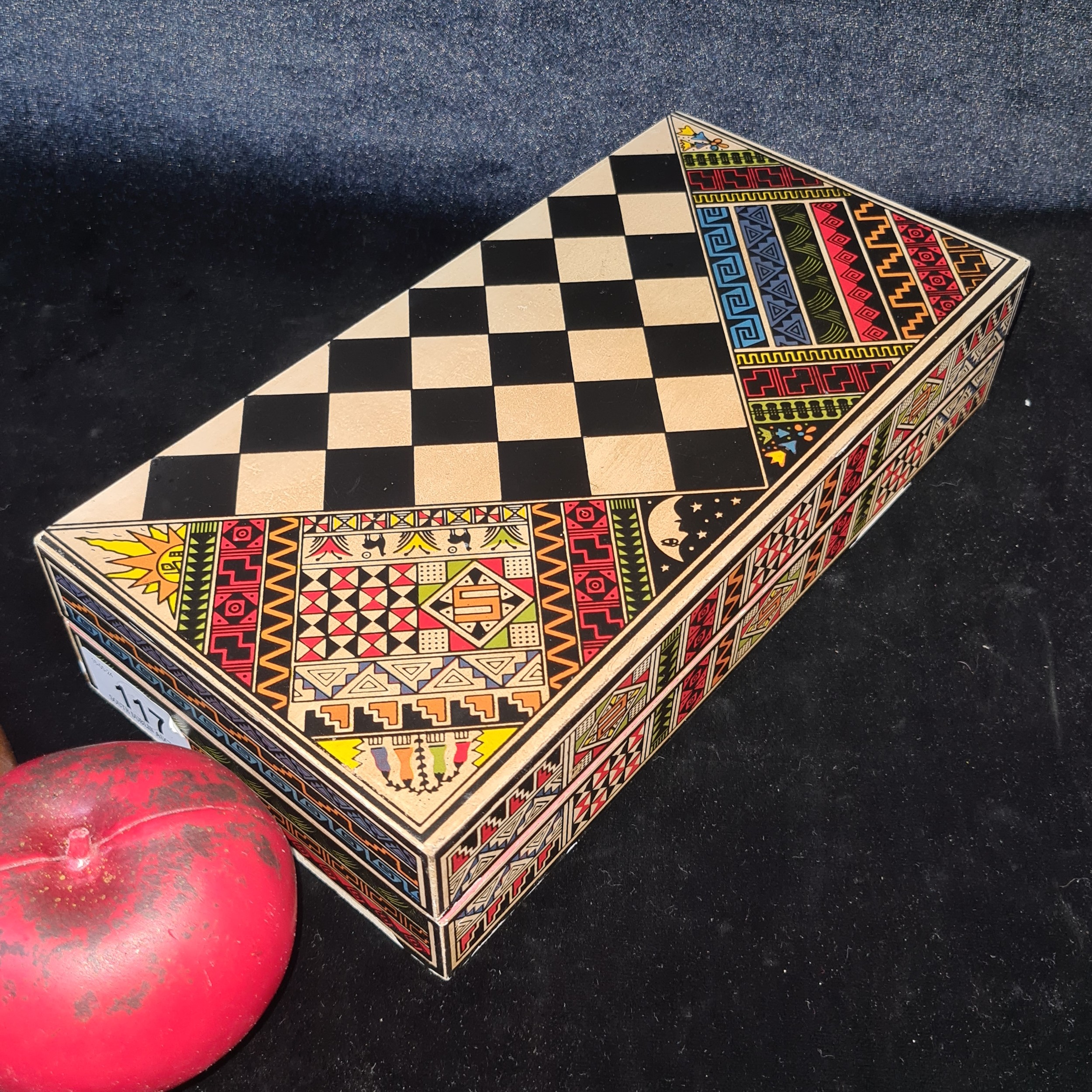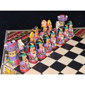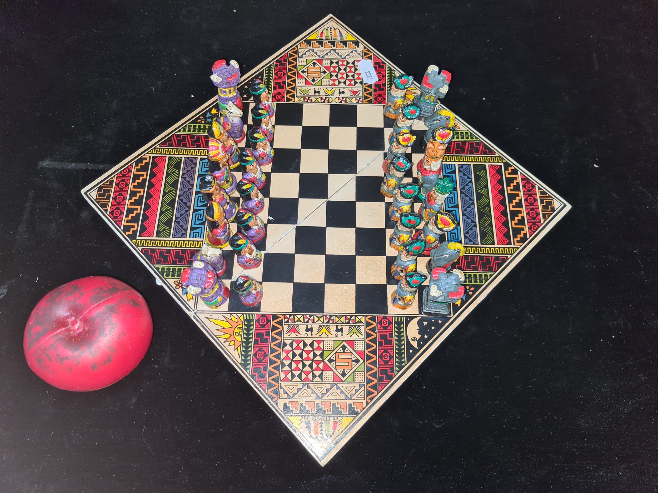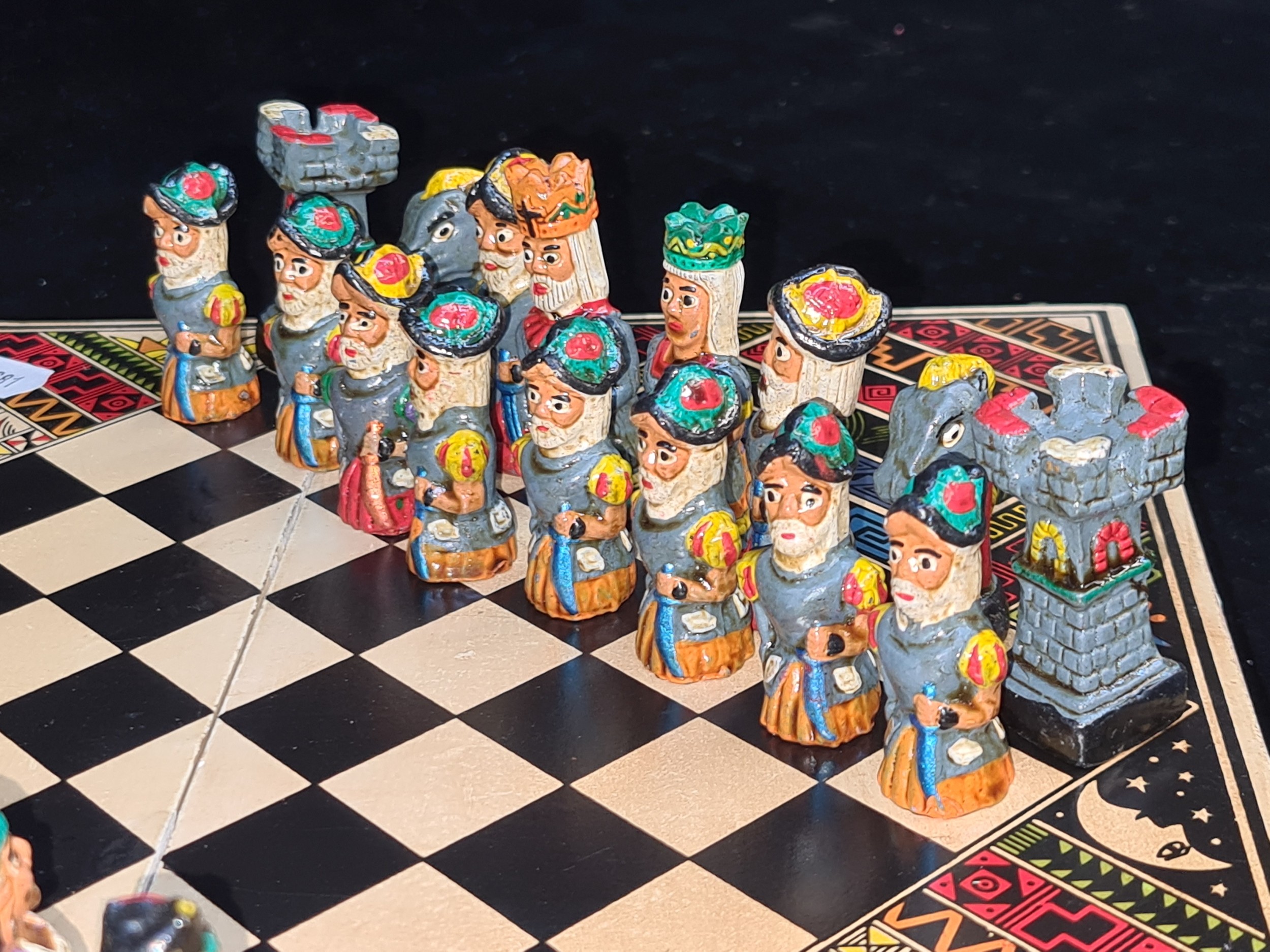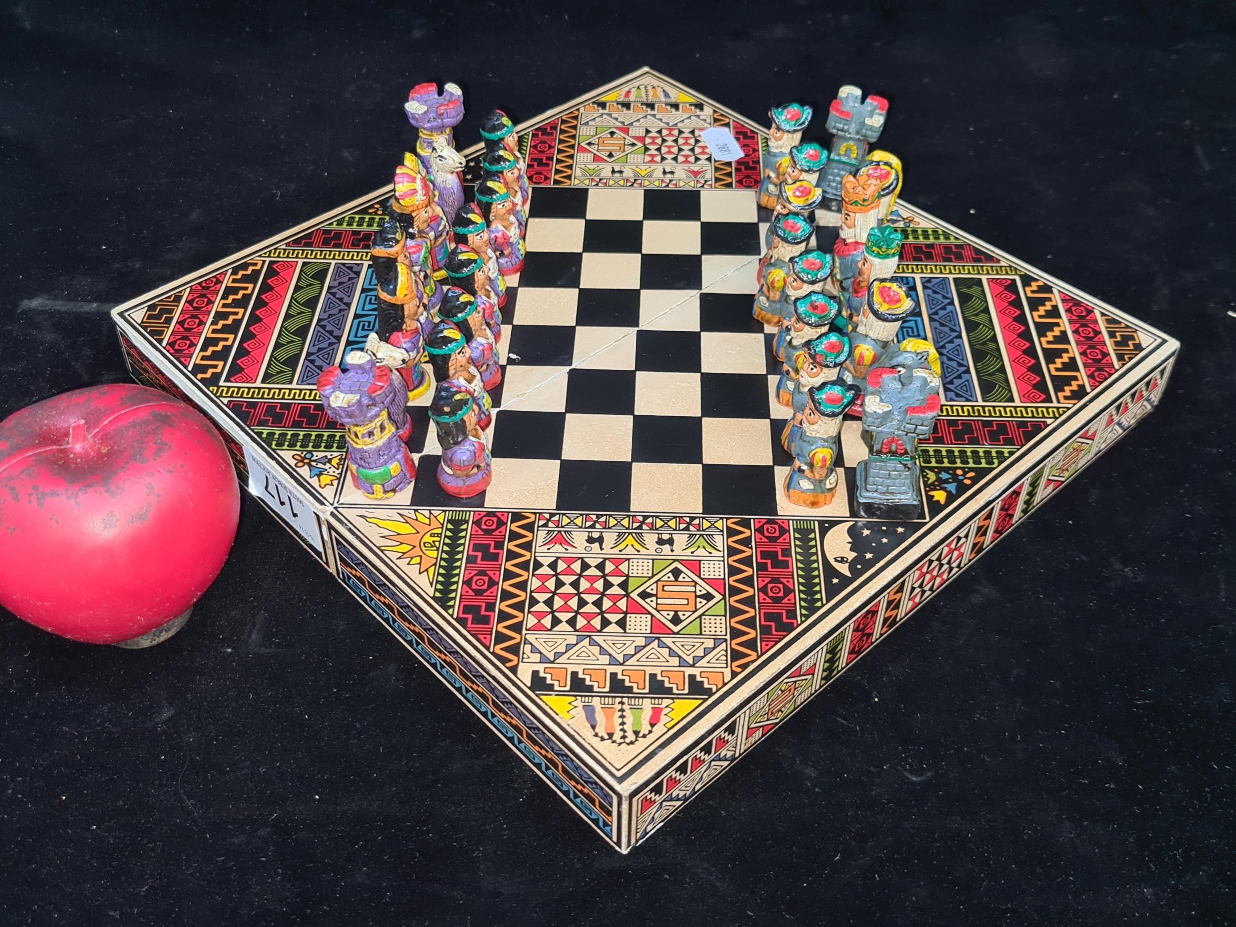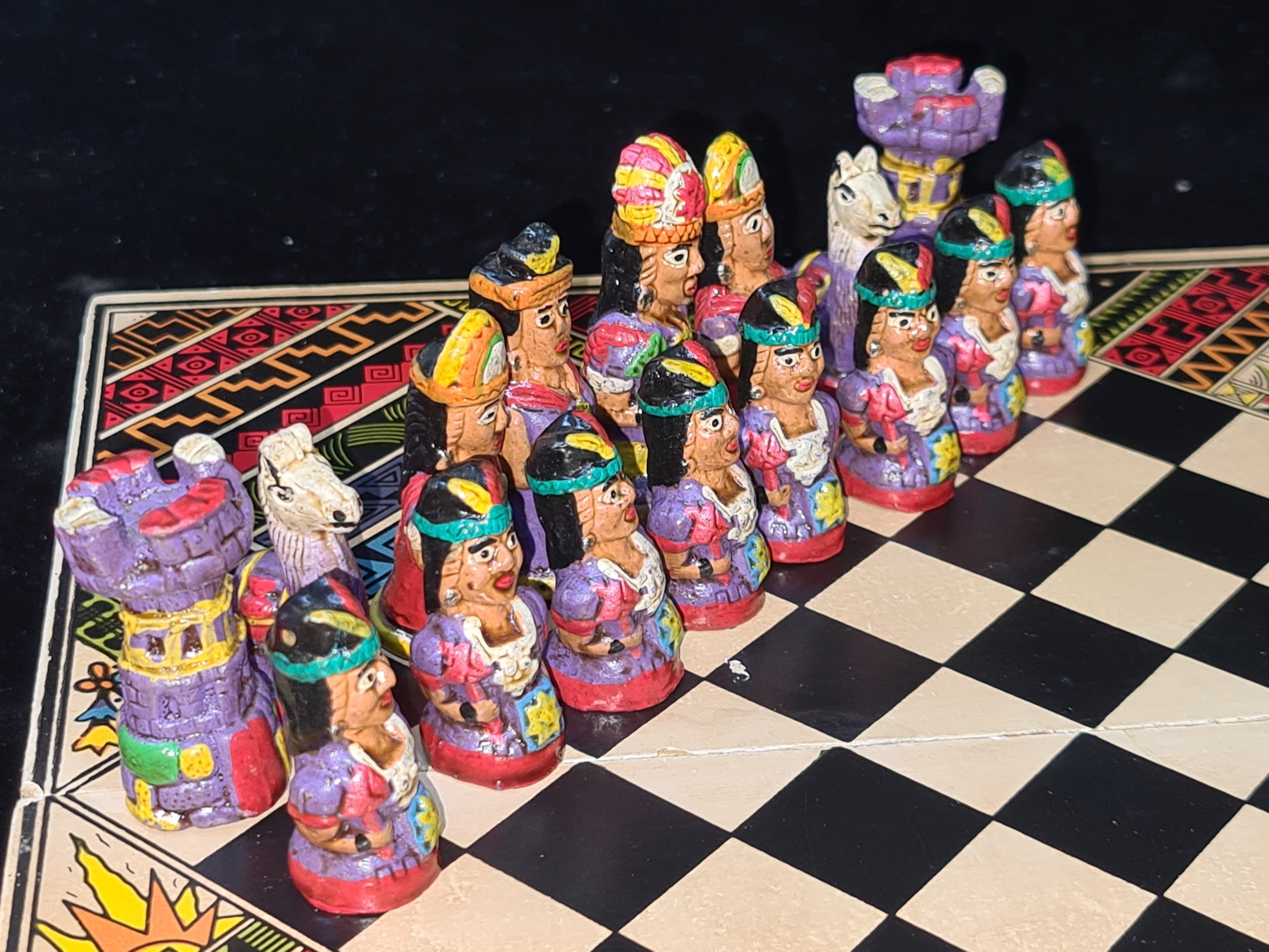 A vintage Aztec Mayan Incas vs. Spanish Conquistadors portable chess set. A very cool piece.