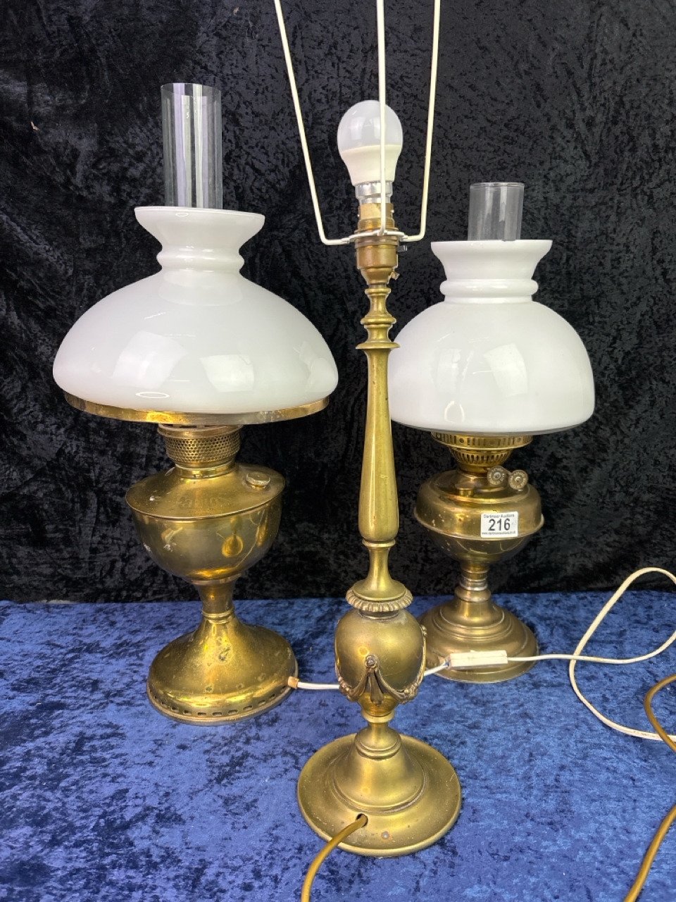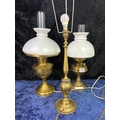 2 brass and glass vintage oil lamps and a brass table lamp