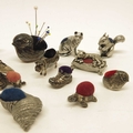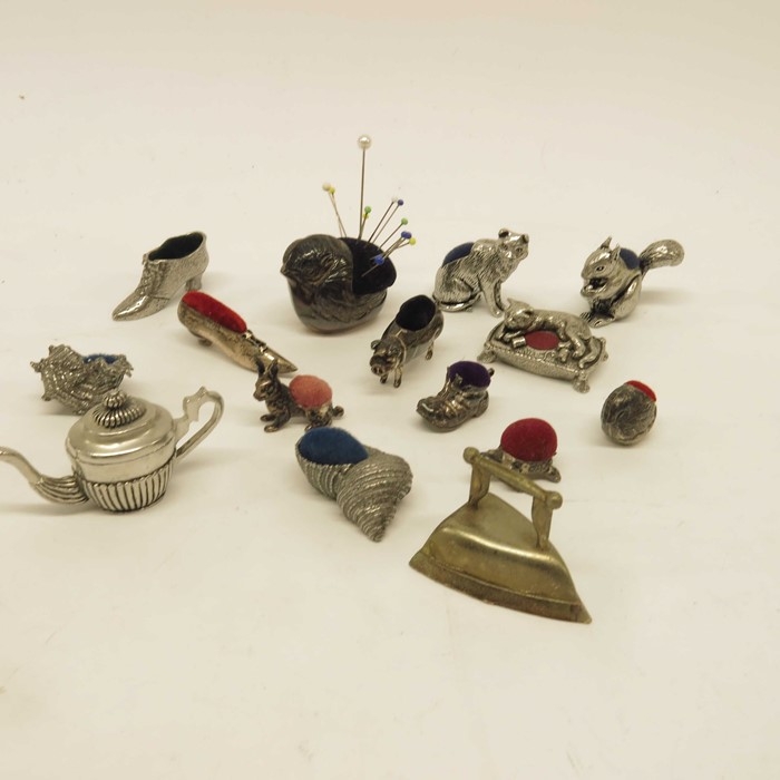 Edwardian style silver novelty pin cushions, including chicks, pig, shoe etc., together with Wentworth pewter animal pin cushions, metal pin cushions (10+)