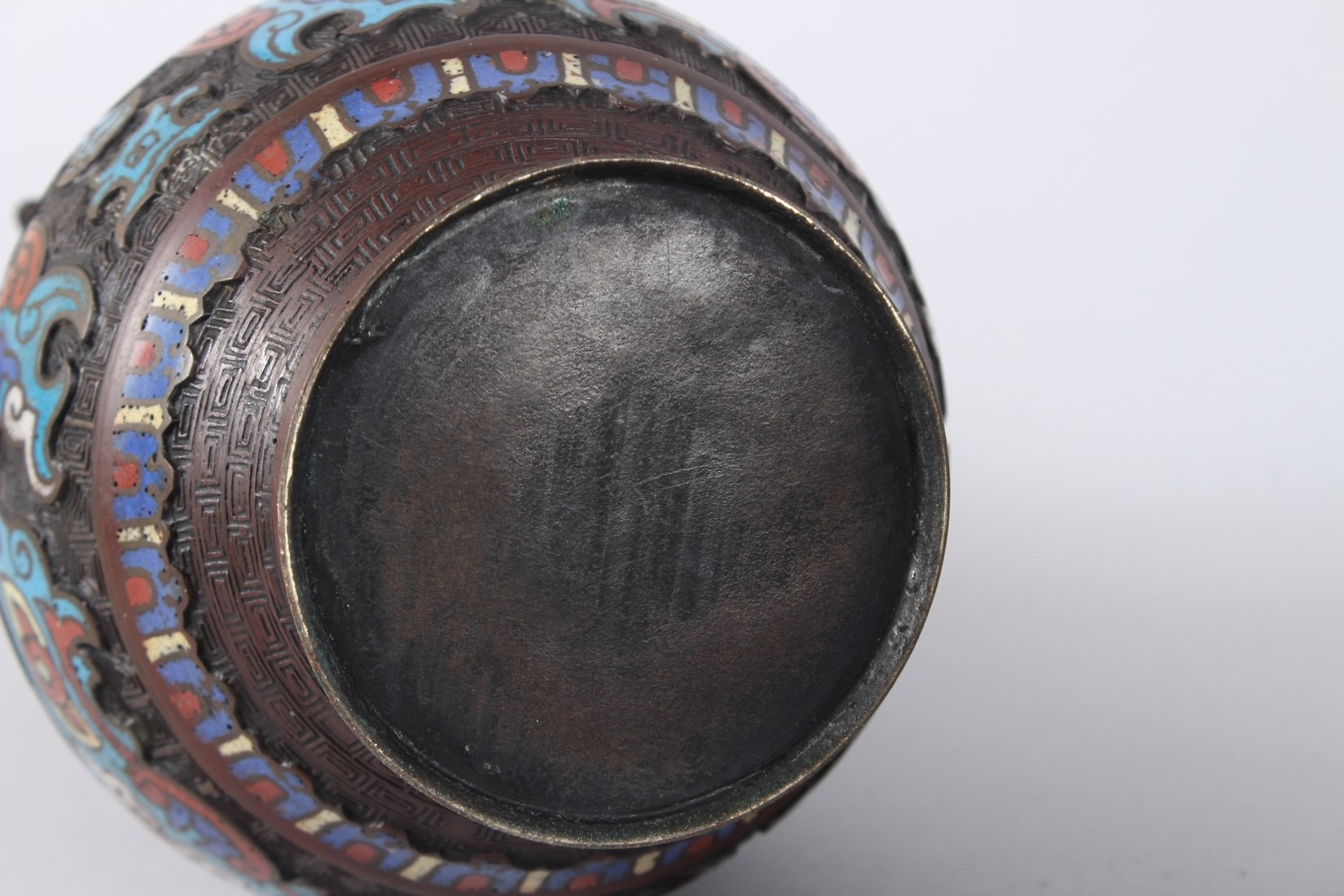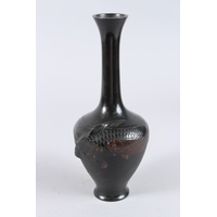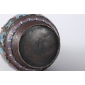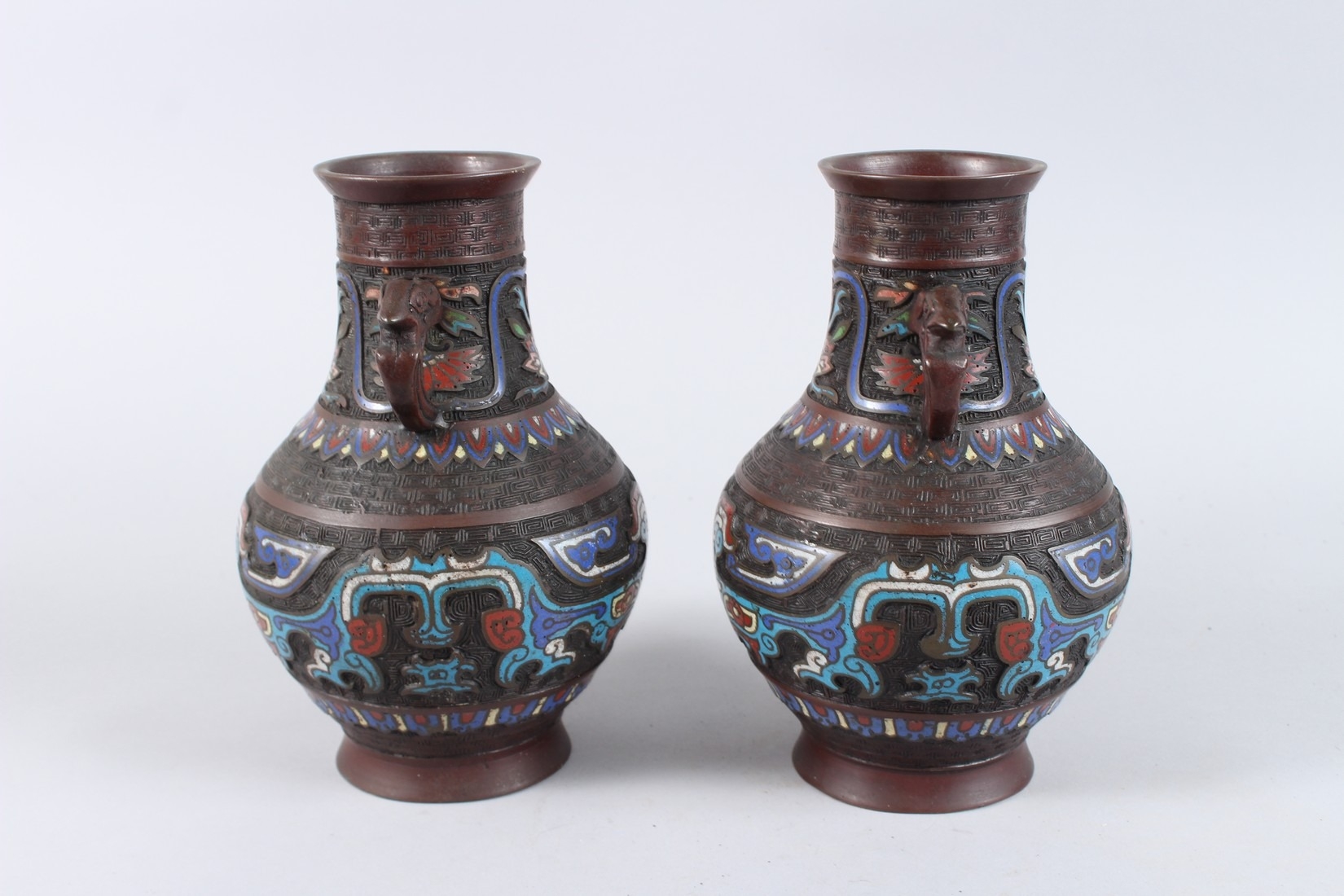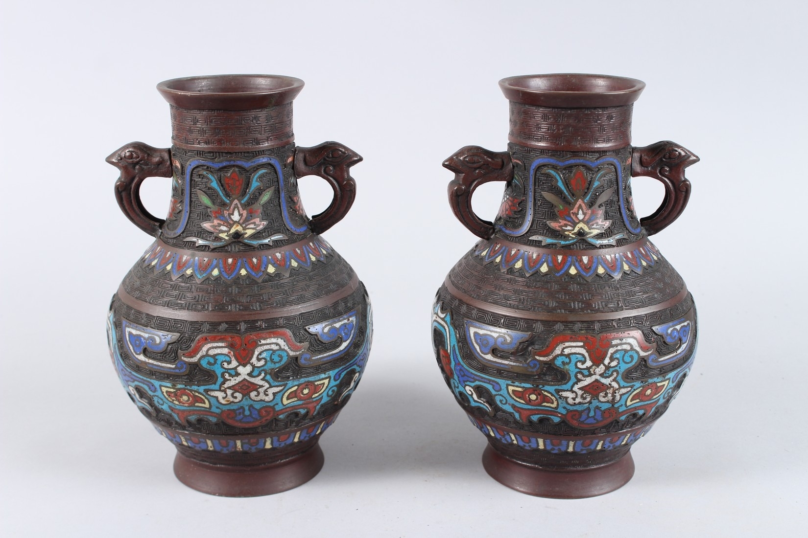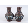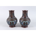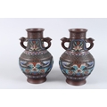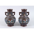 A PAIR OF CHINESE BRONZE AND CLOISONNE TWO HANDLED VASES. 10ins high.