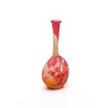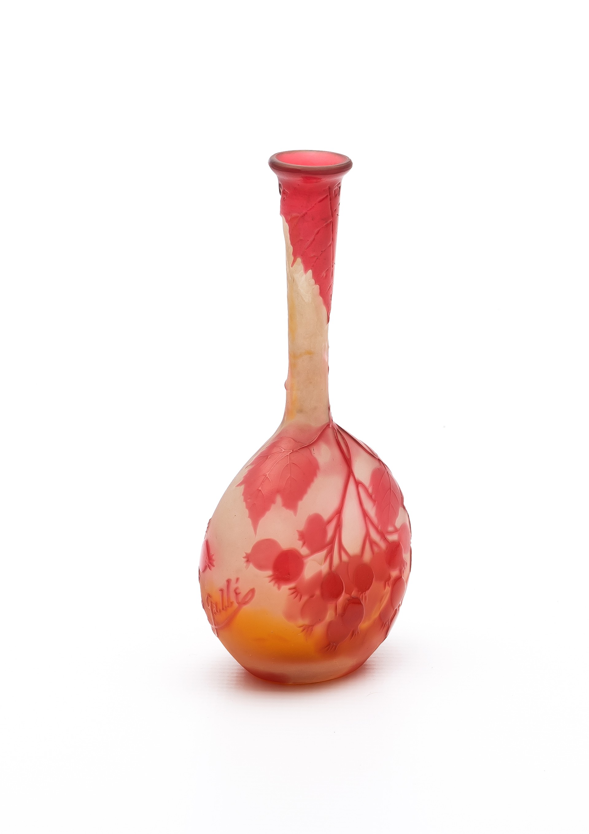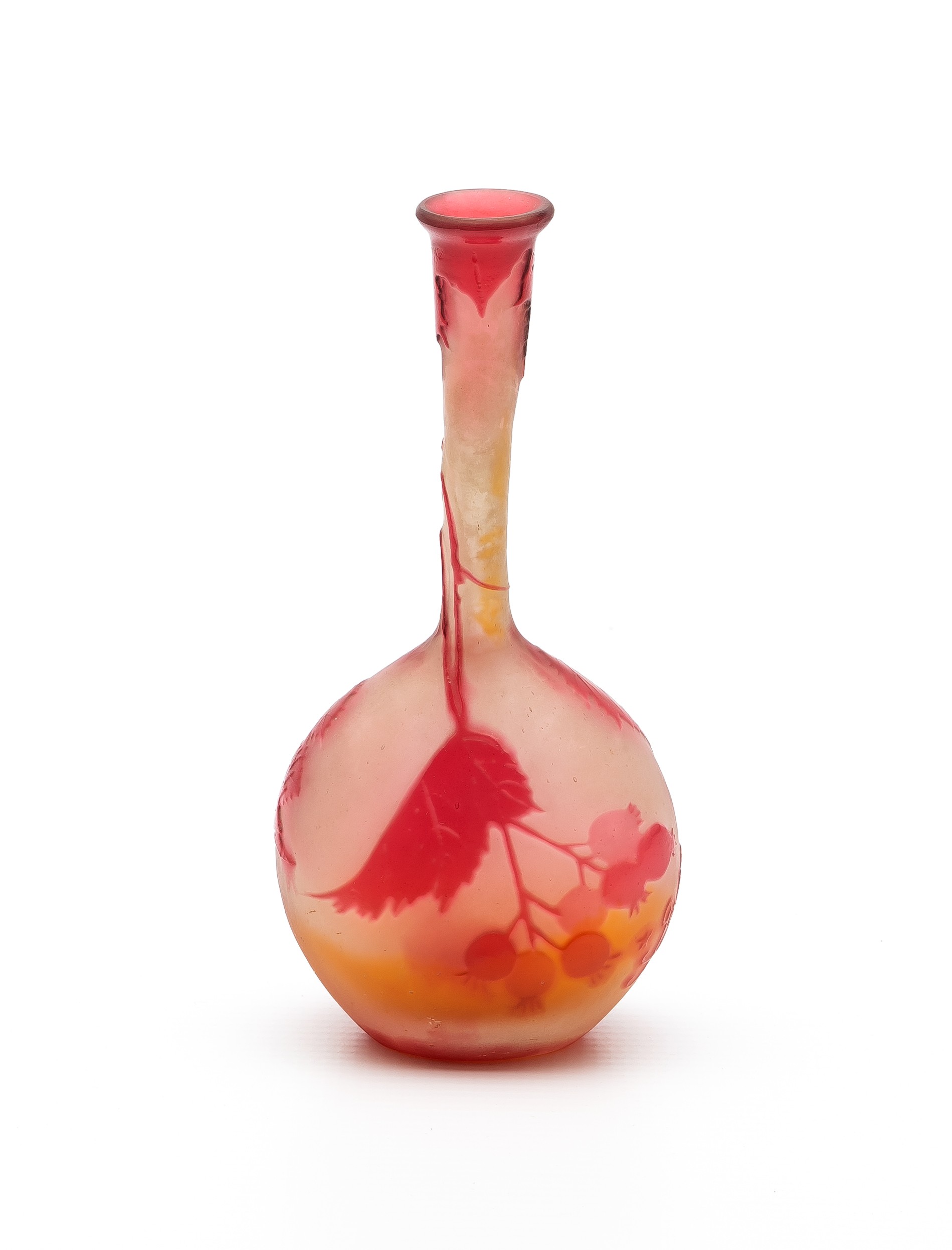 A frosted cameo glass vase embellished with red dog roses, embossed signature