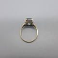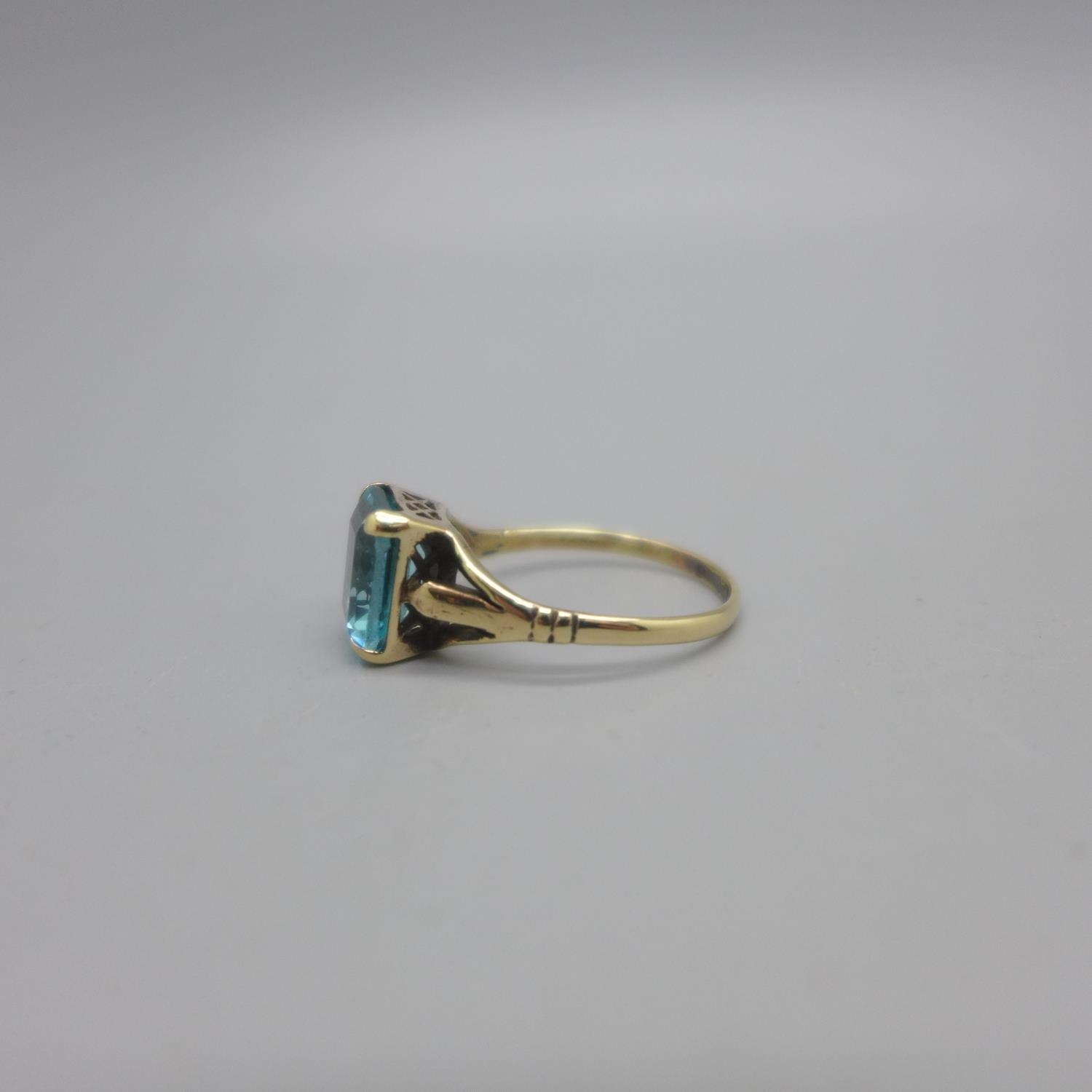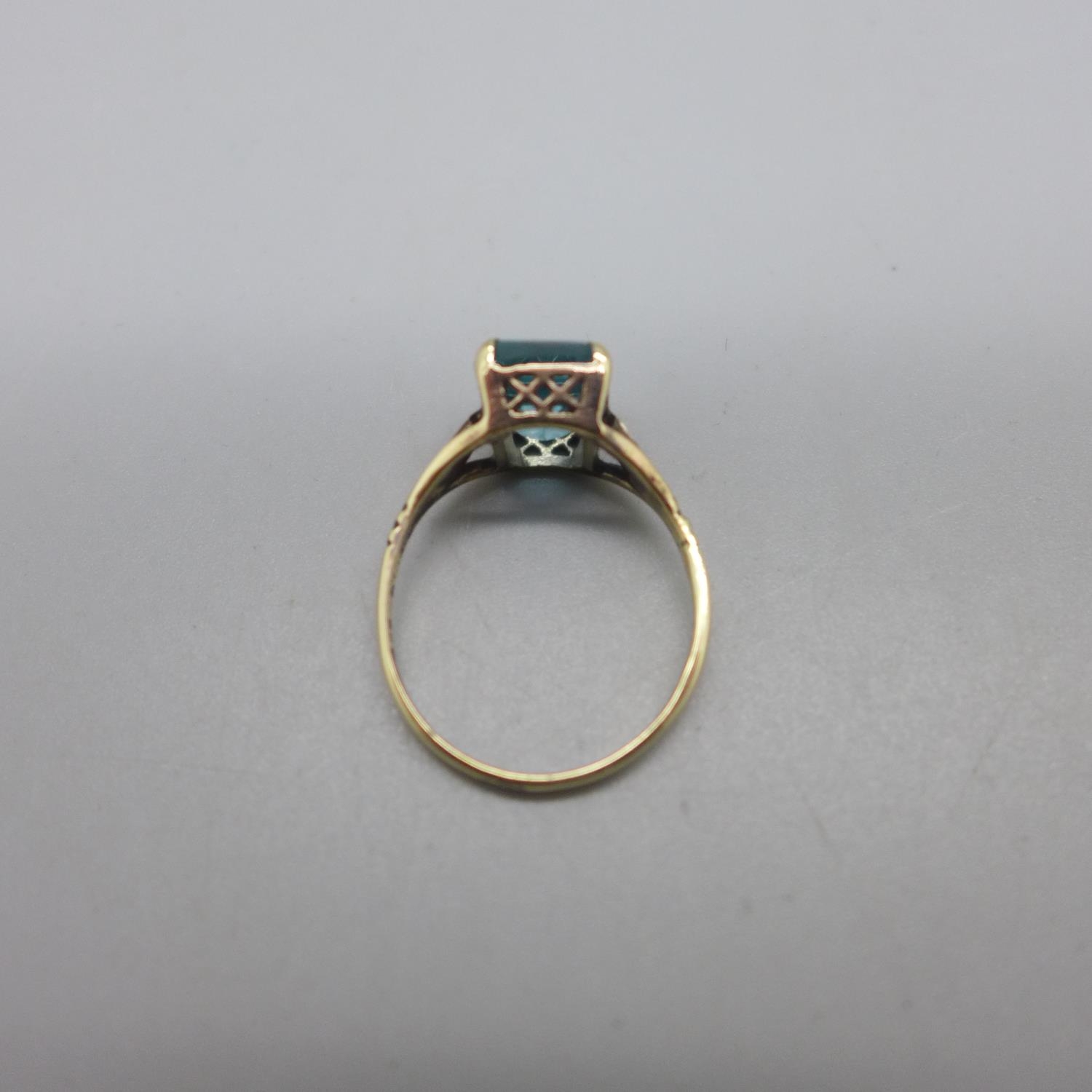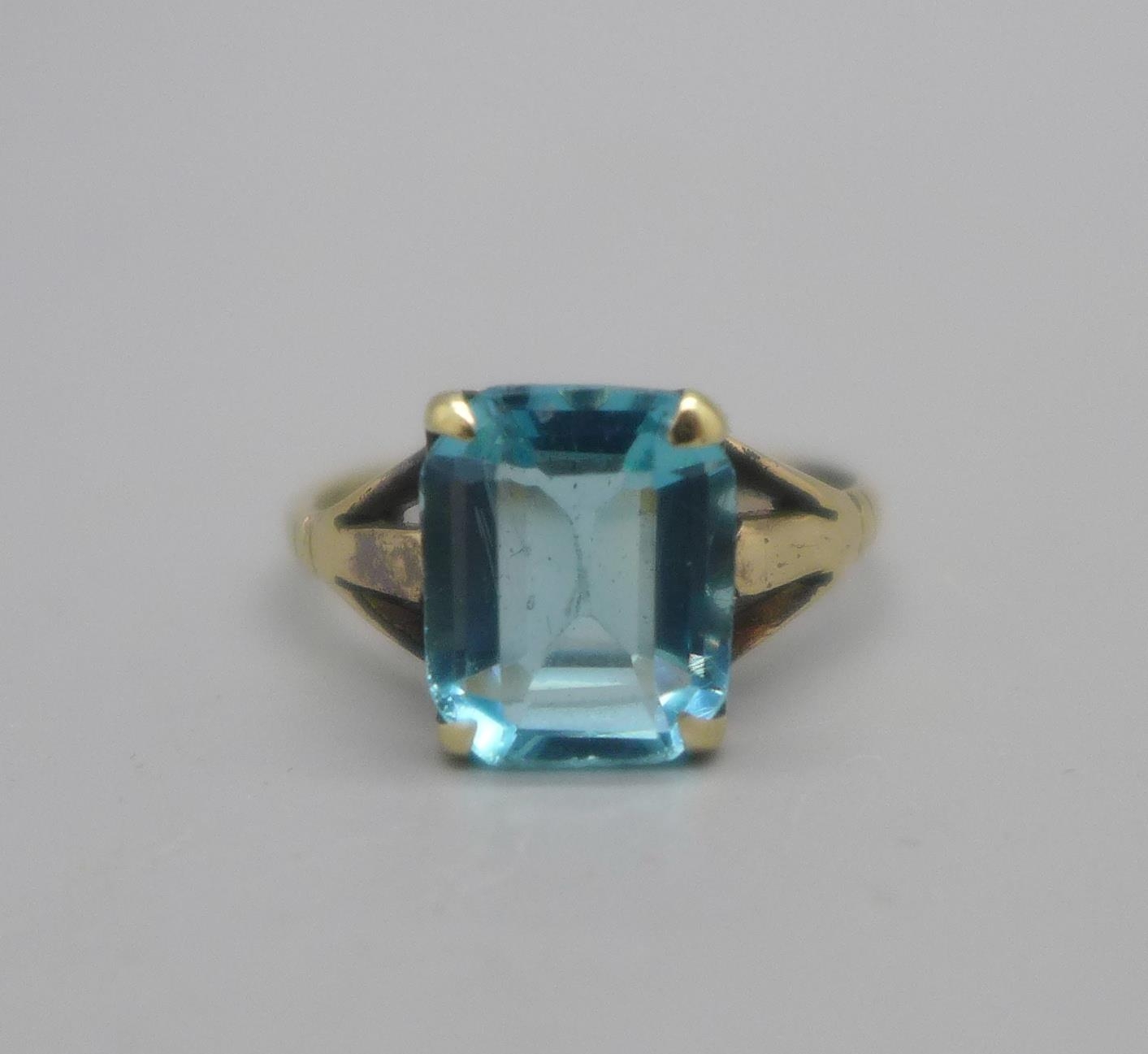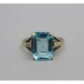 A 9ct gold, emerald cut, aqua colour gem set ring, 2.4g, O