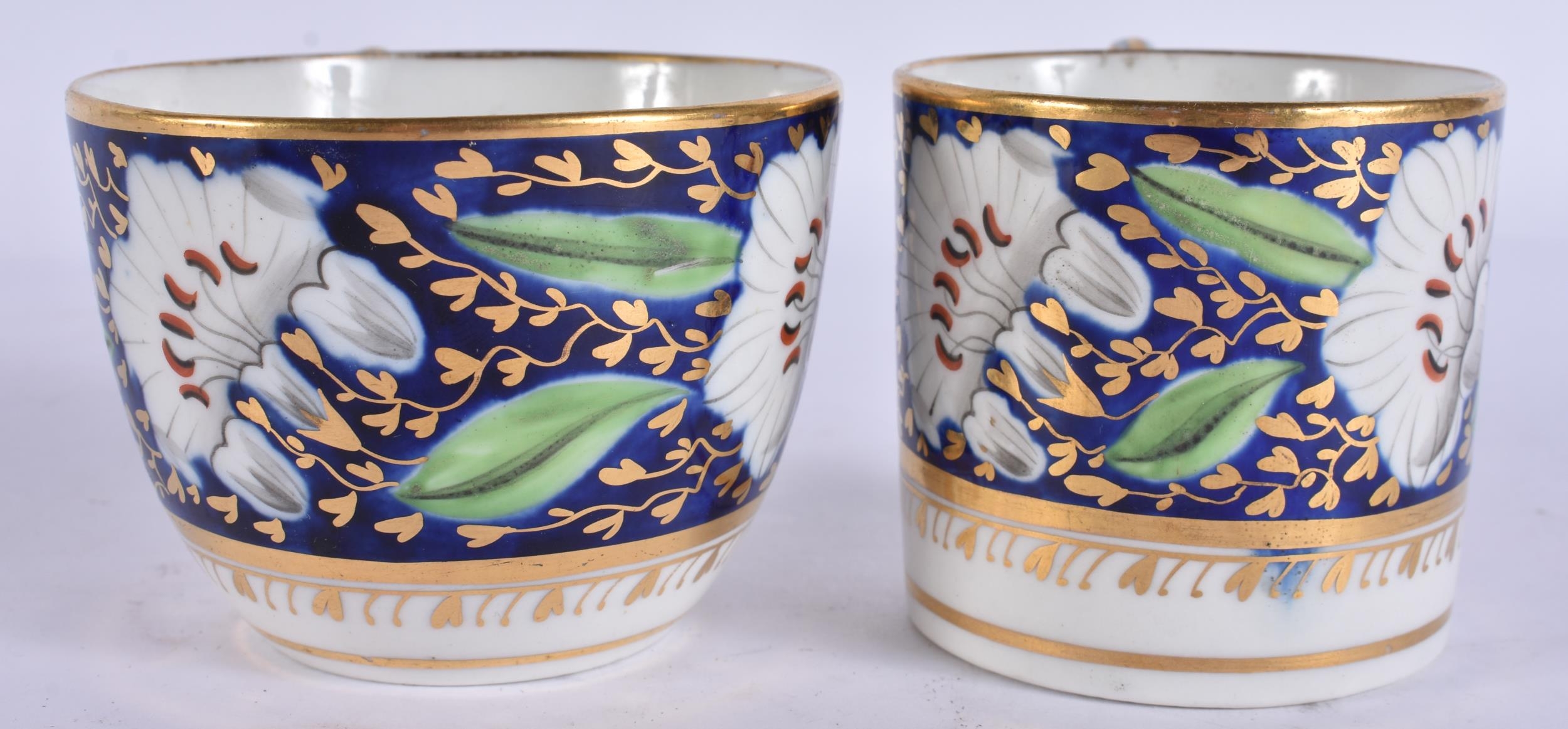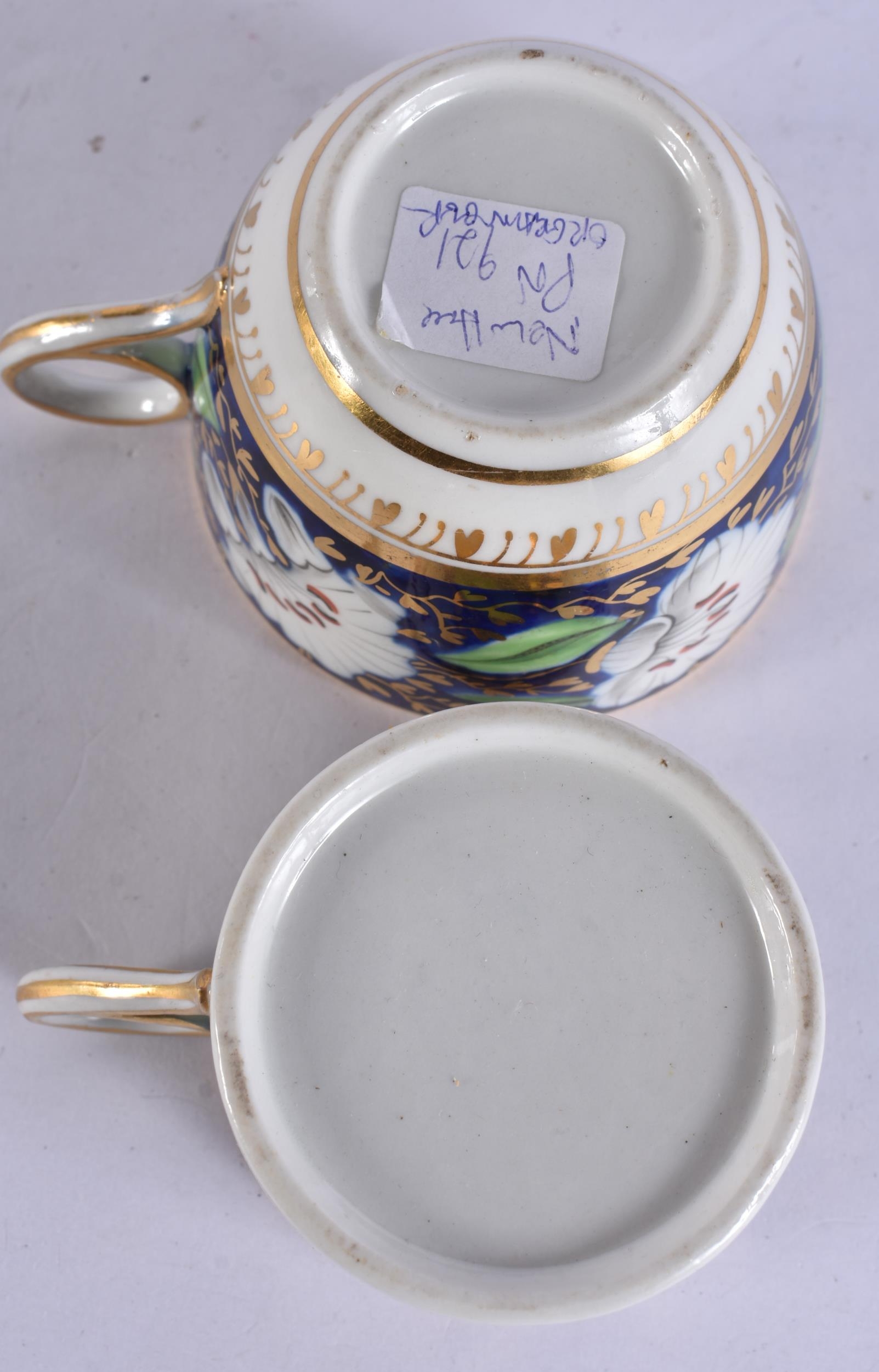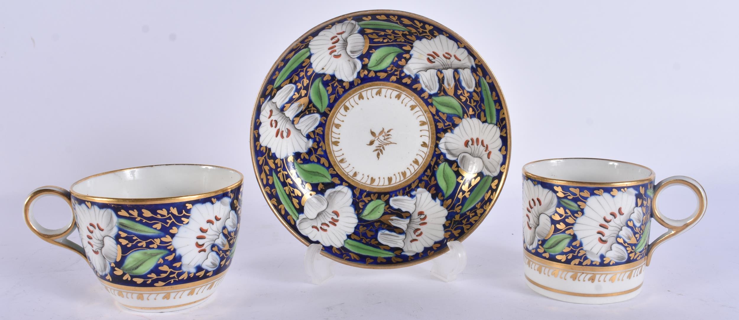 A LOVELY EARLY 19TH CENTURY ENGLISH PORCELAIN TRIO painted with flowers on a rich blue and gilt ground. 12.5 cm diameter. (3)