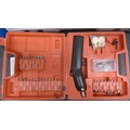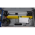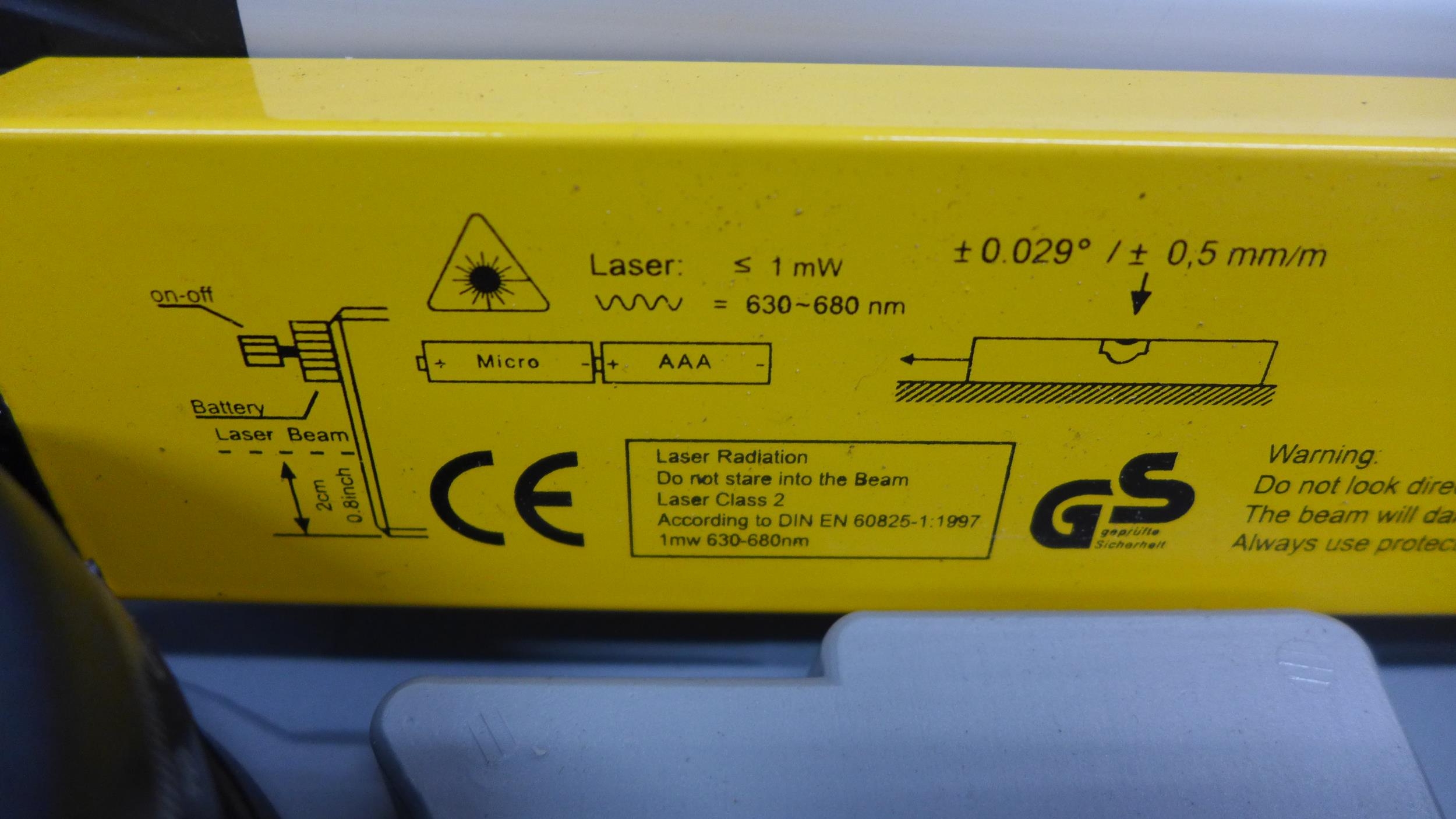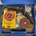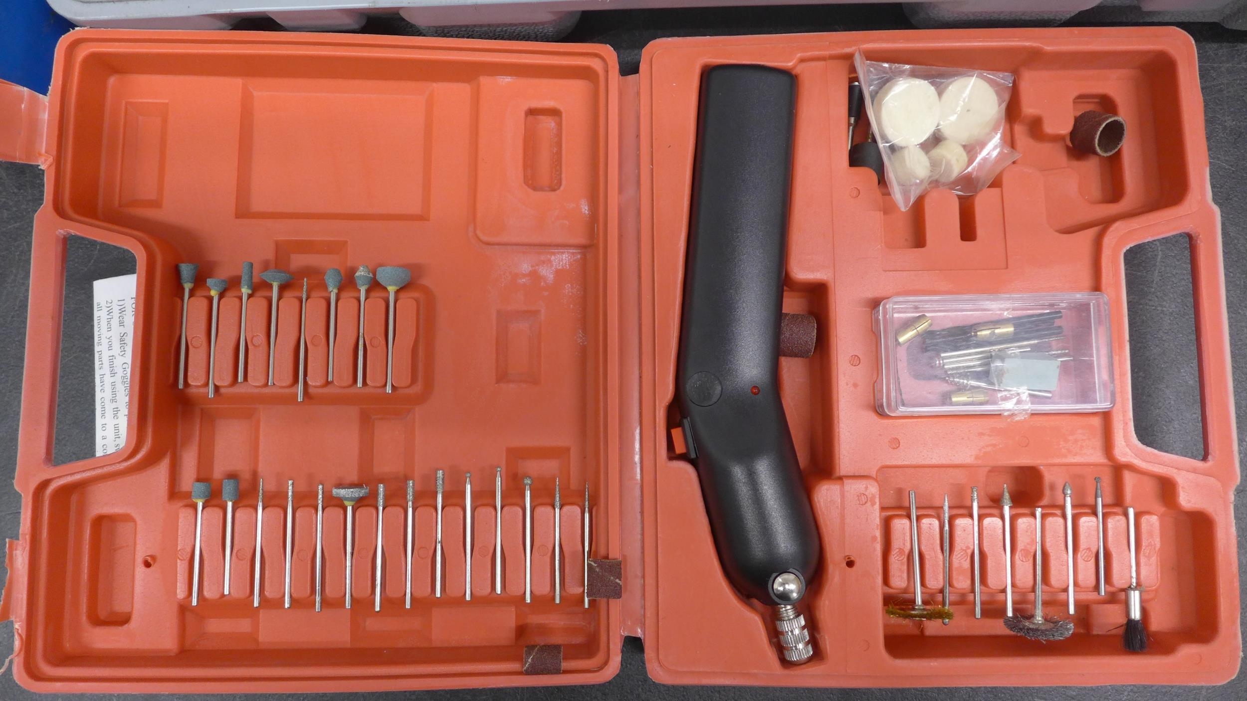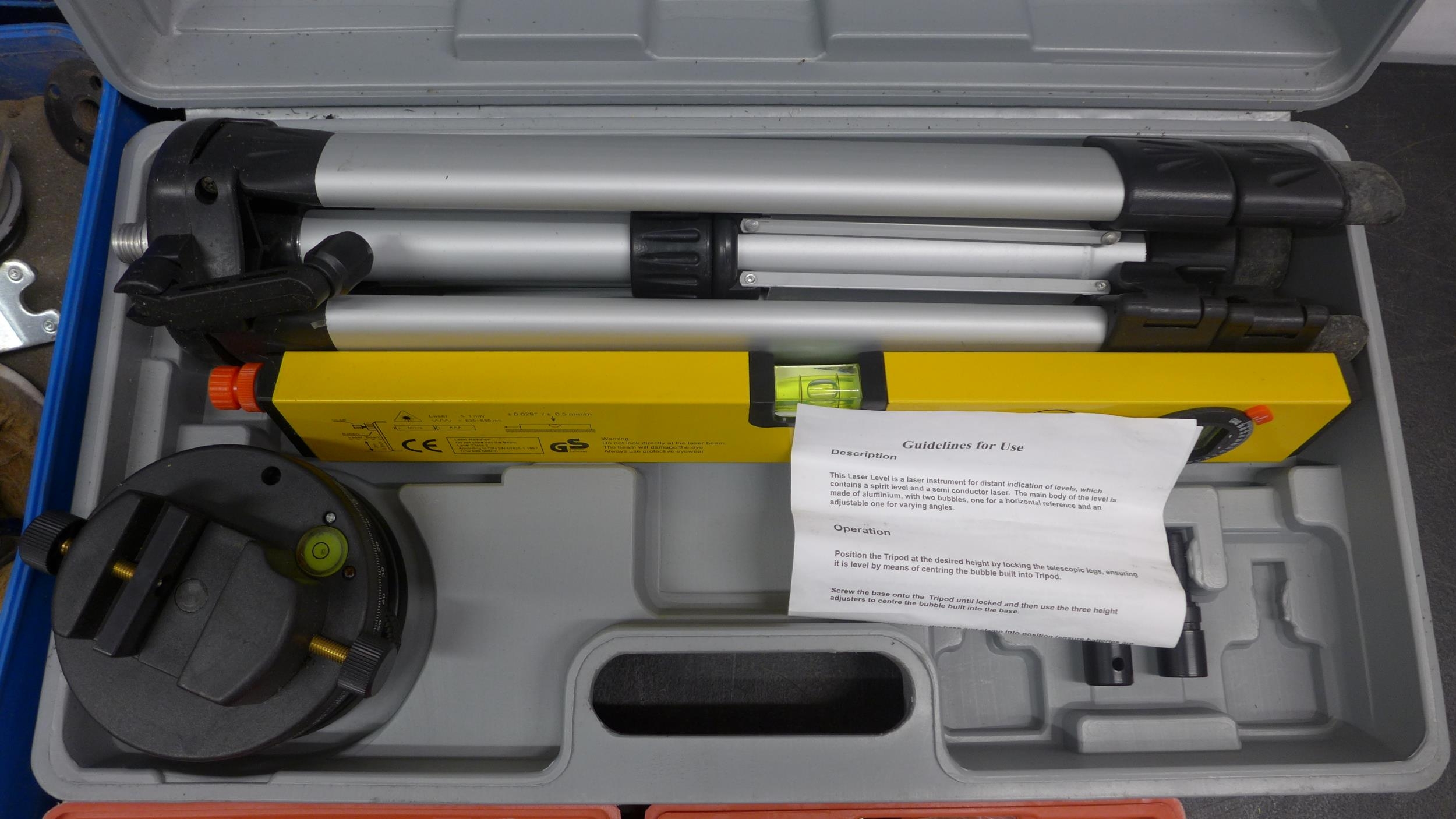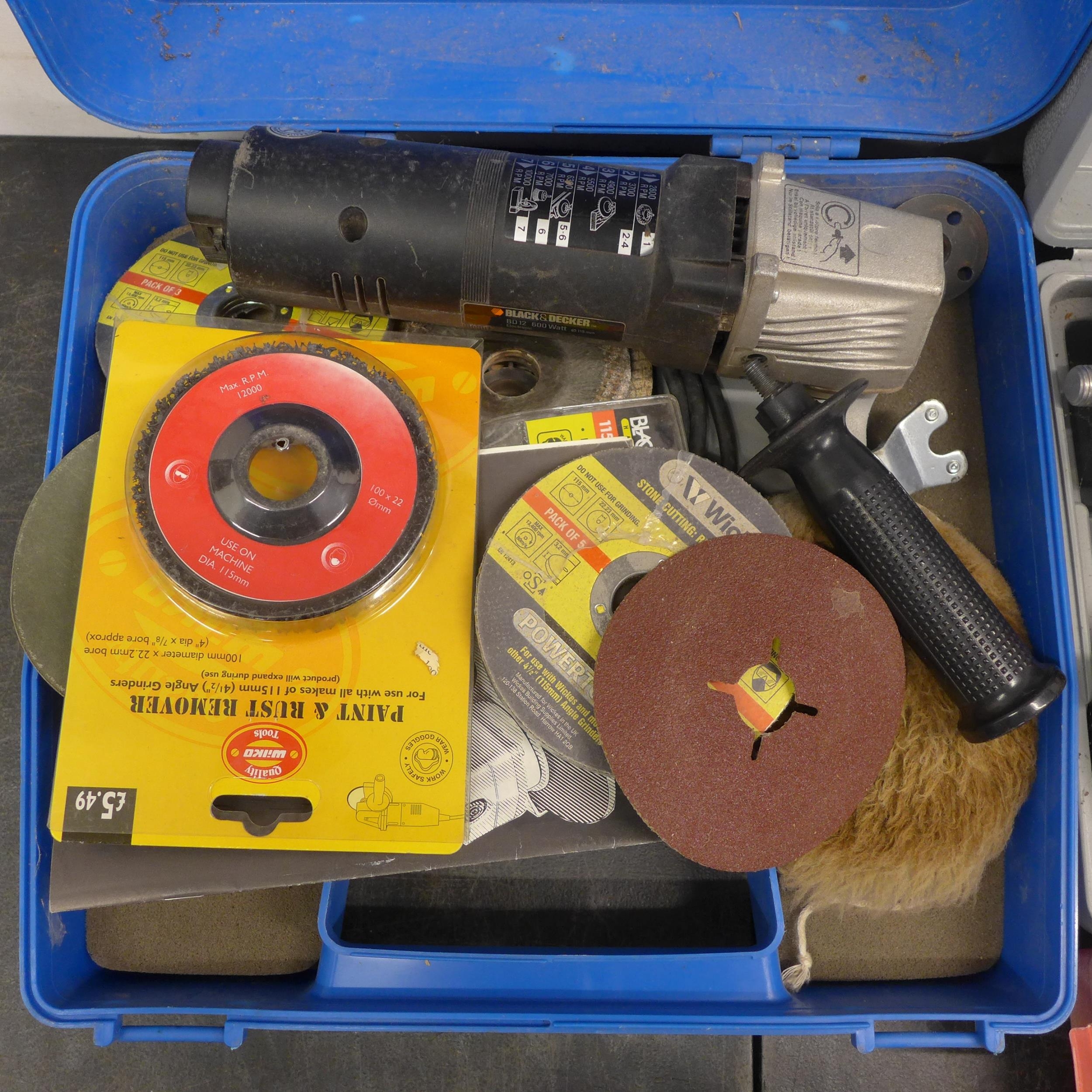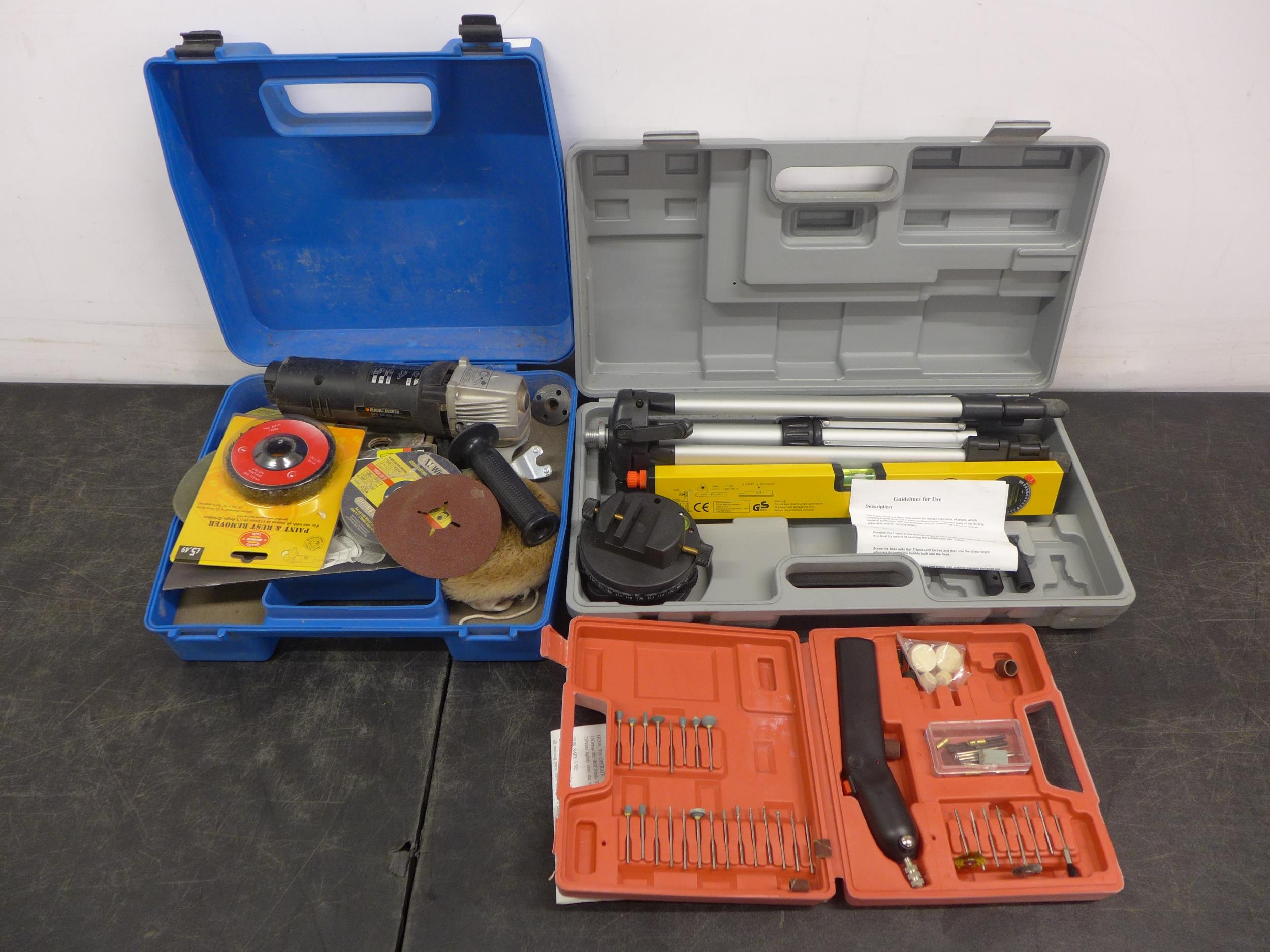 A laser level on a tripod in case and a rotary tool kit with attachments and a Black and Decker 600w grinder