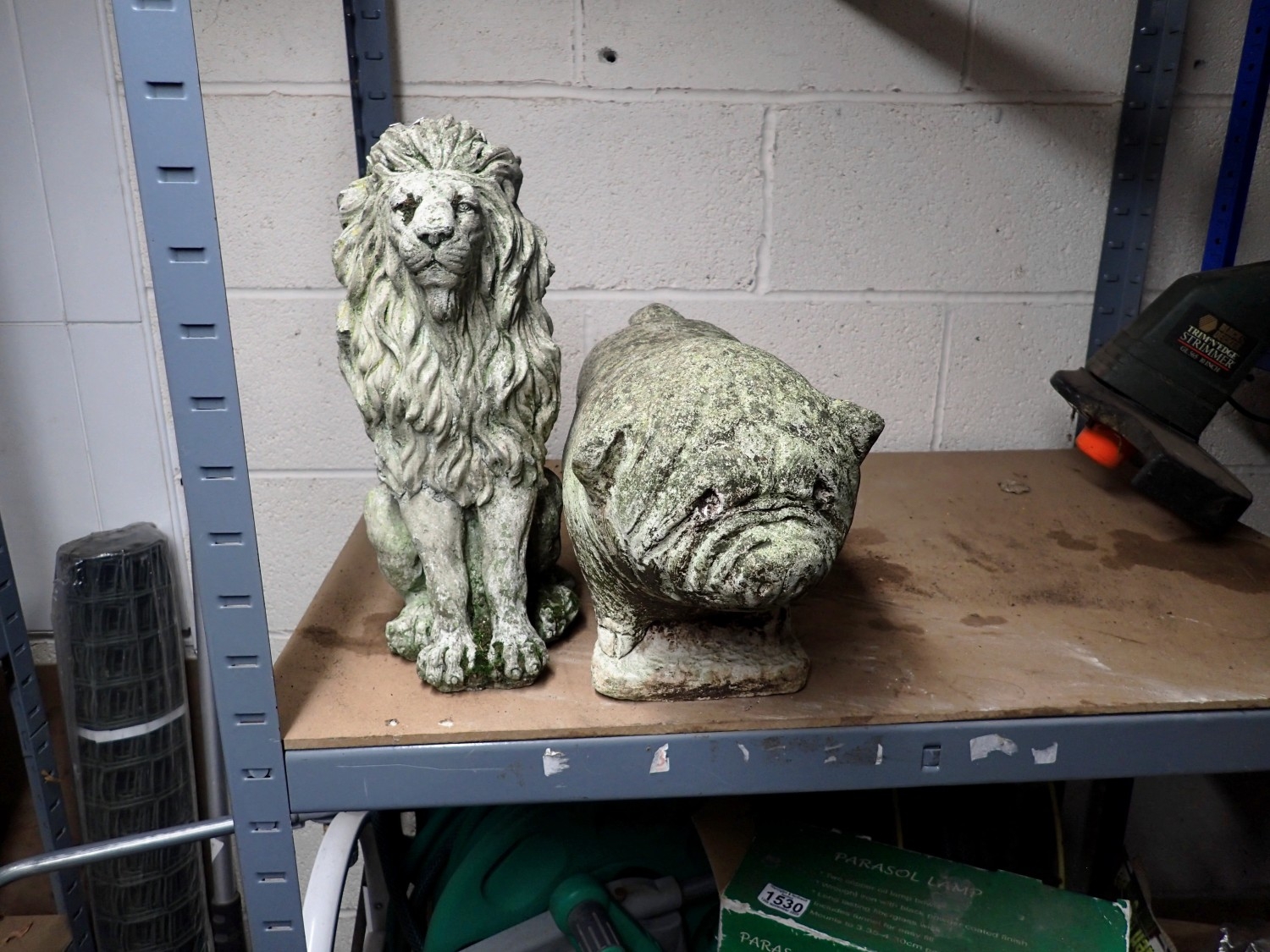 Two stone garden animals, one as a lion. Not available for in-house P&P
