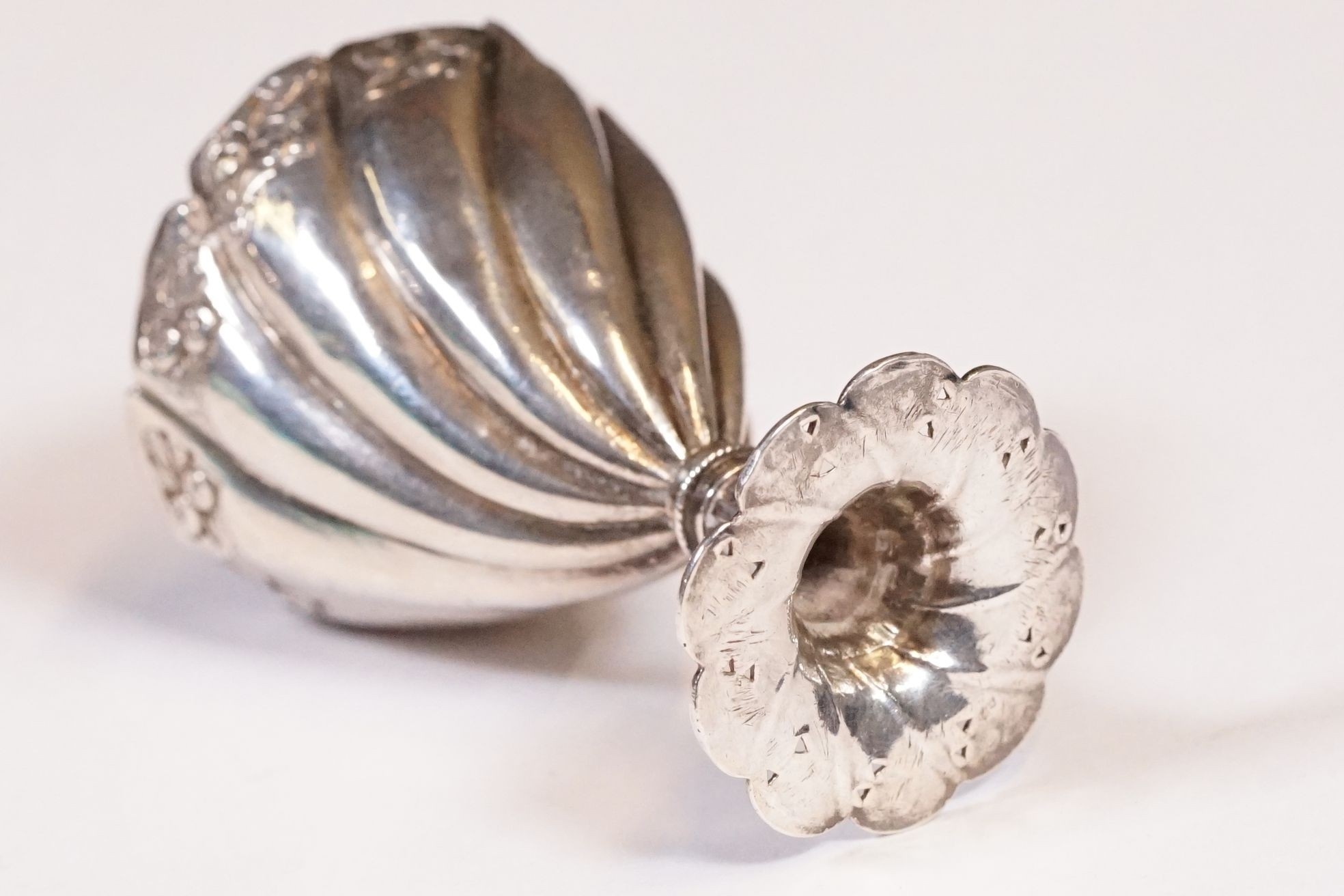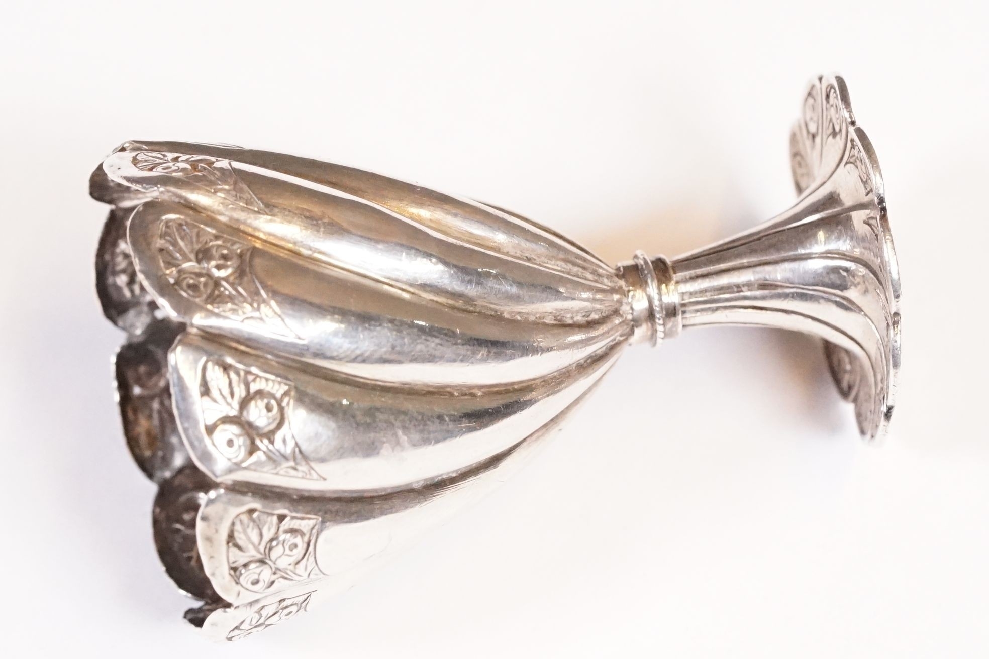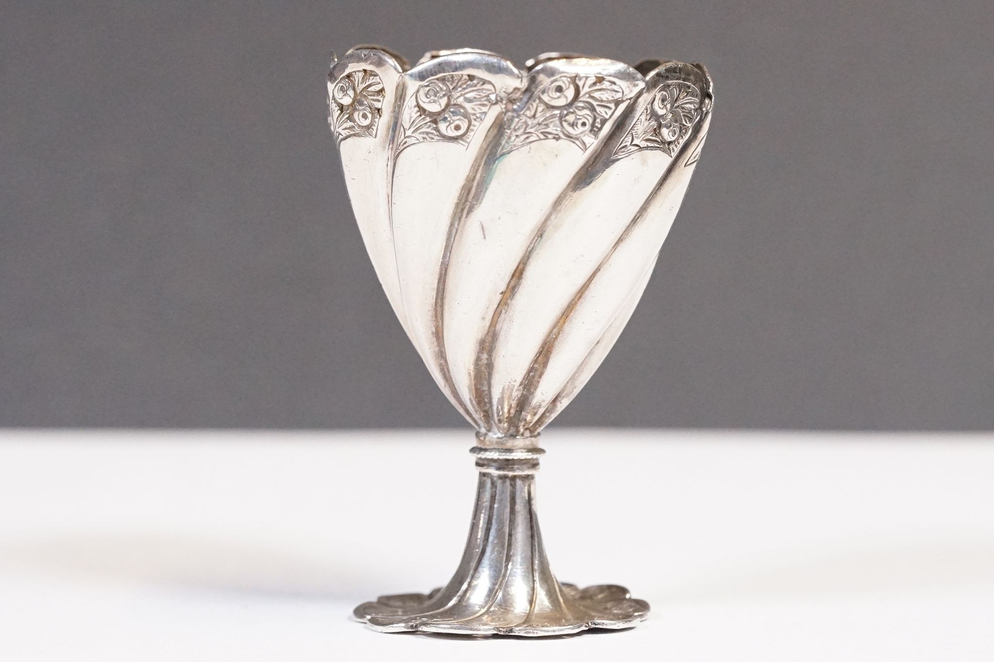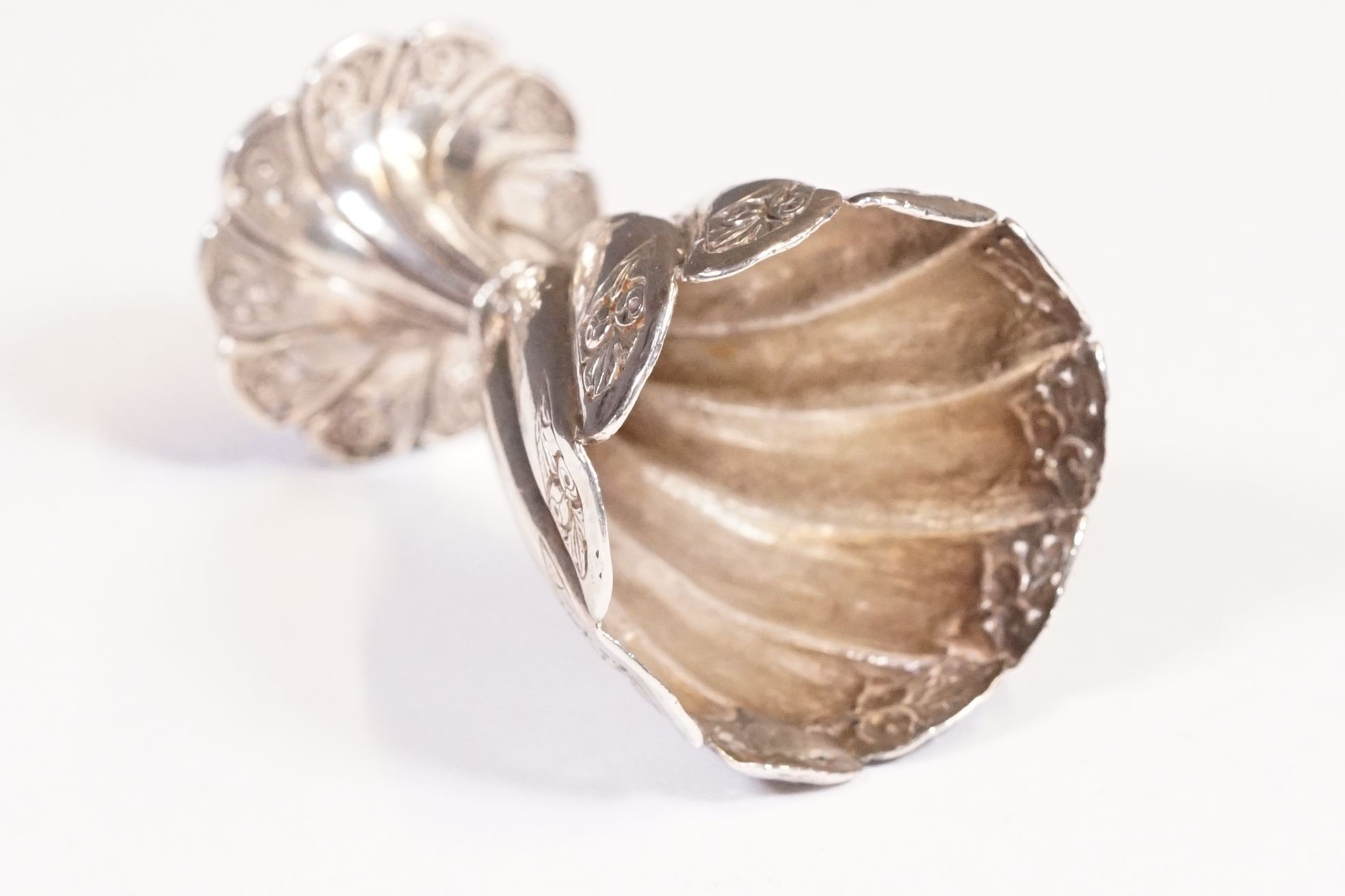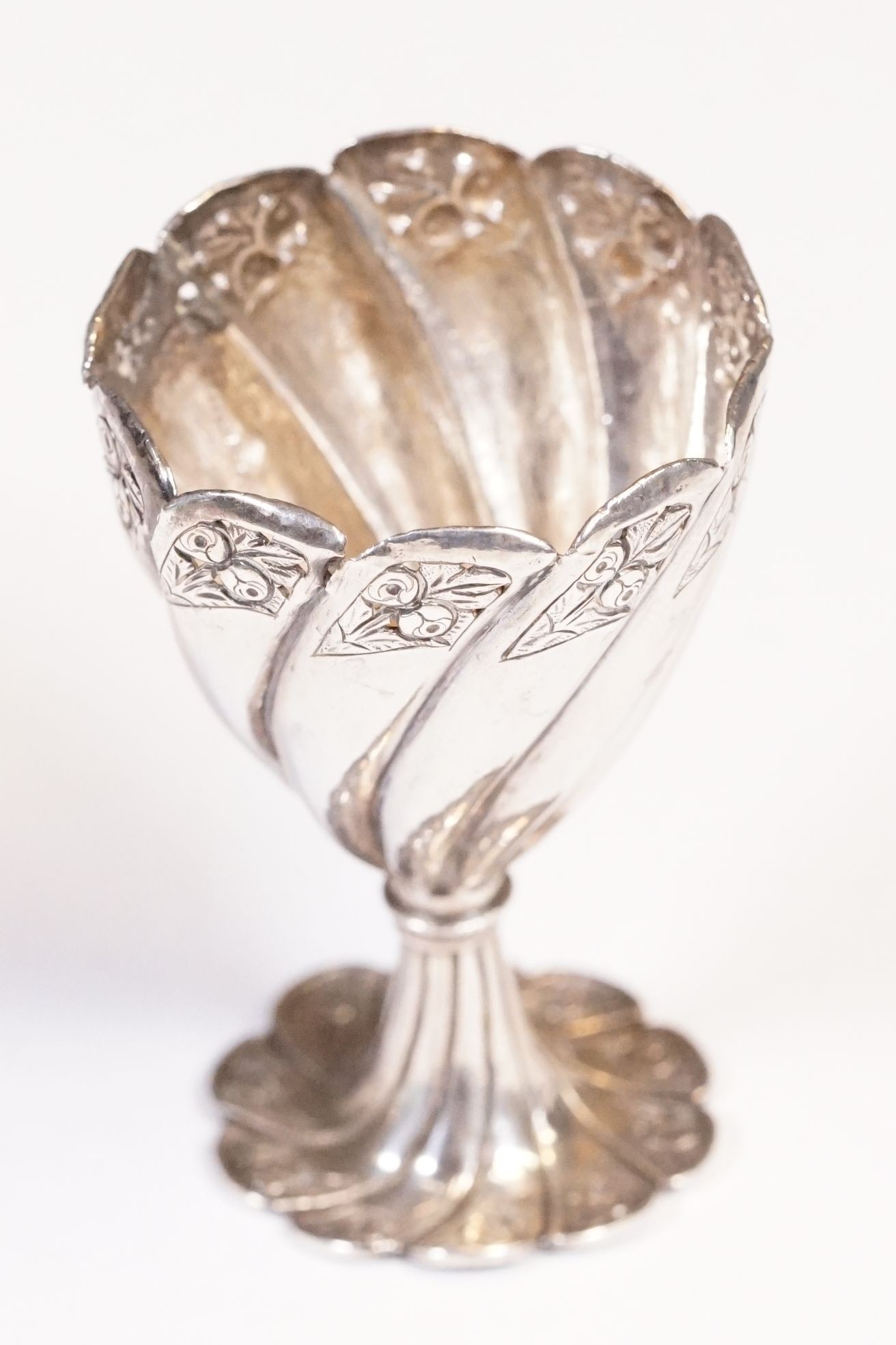 19th Century Turkish Ottoman Islamic silver zarf coffee cup holder of conical form with floral relief and spiral decoration, measures 6.3cm tall