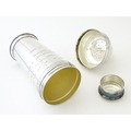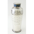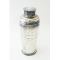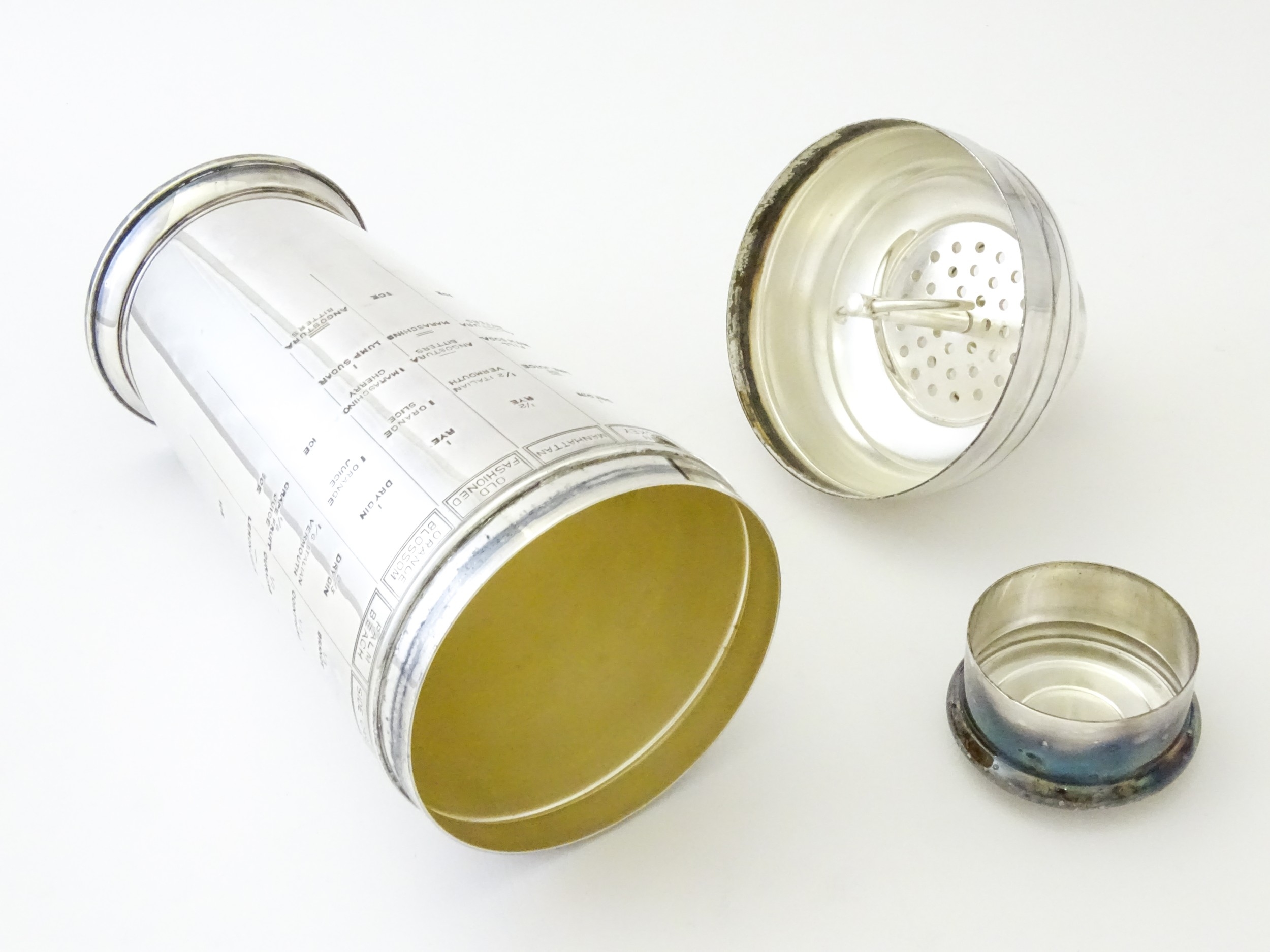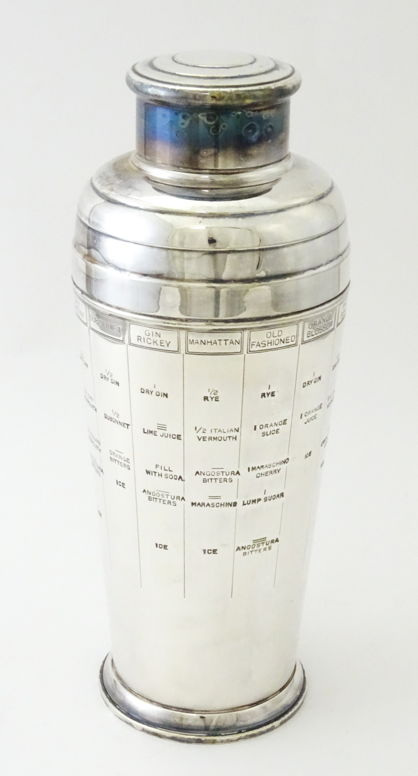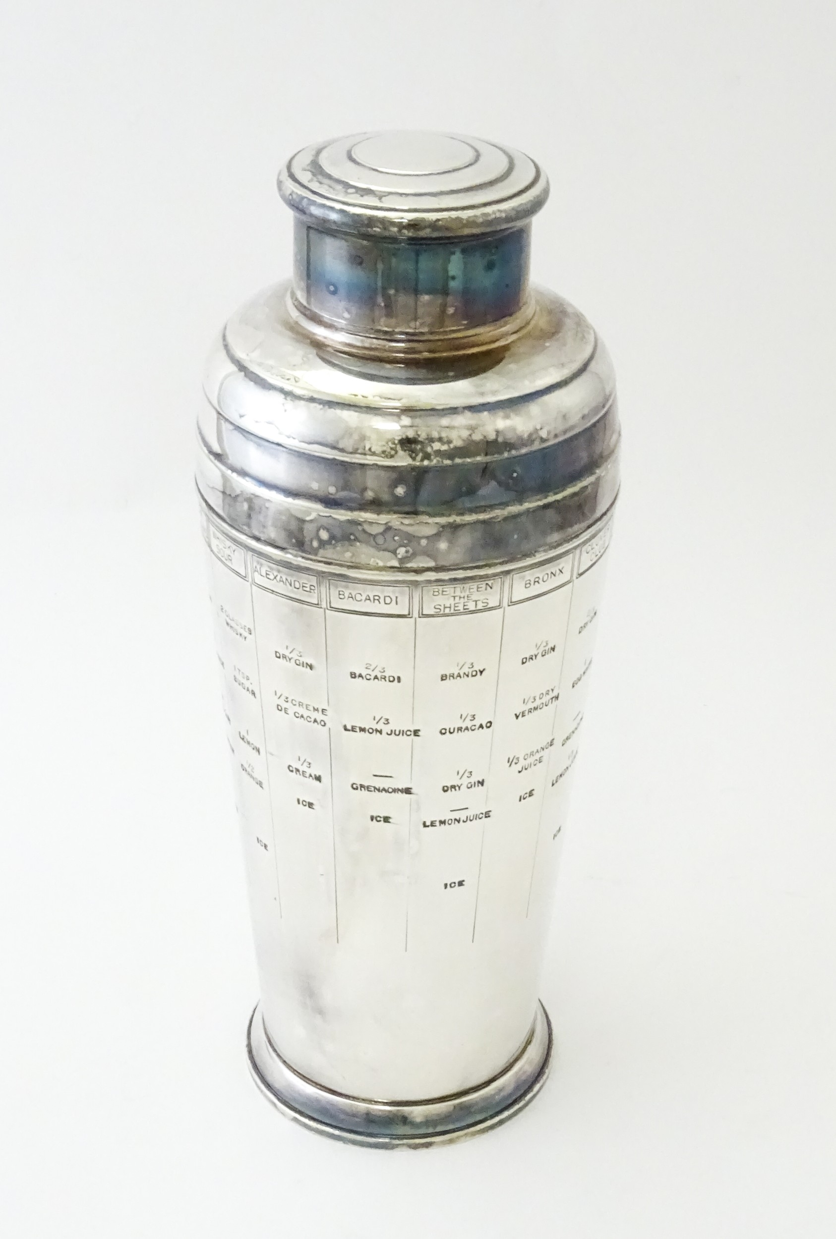 A silver plate cocktail shaker with engraved cocktail recipes detail to sides. Approx. 9 3/4" high
