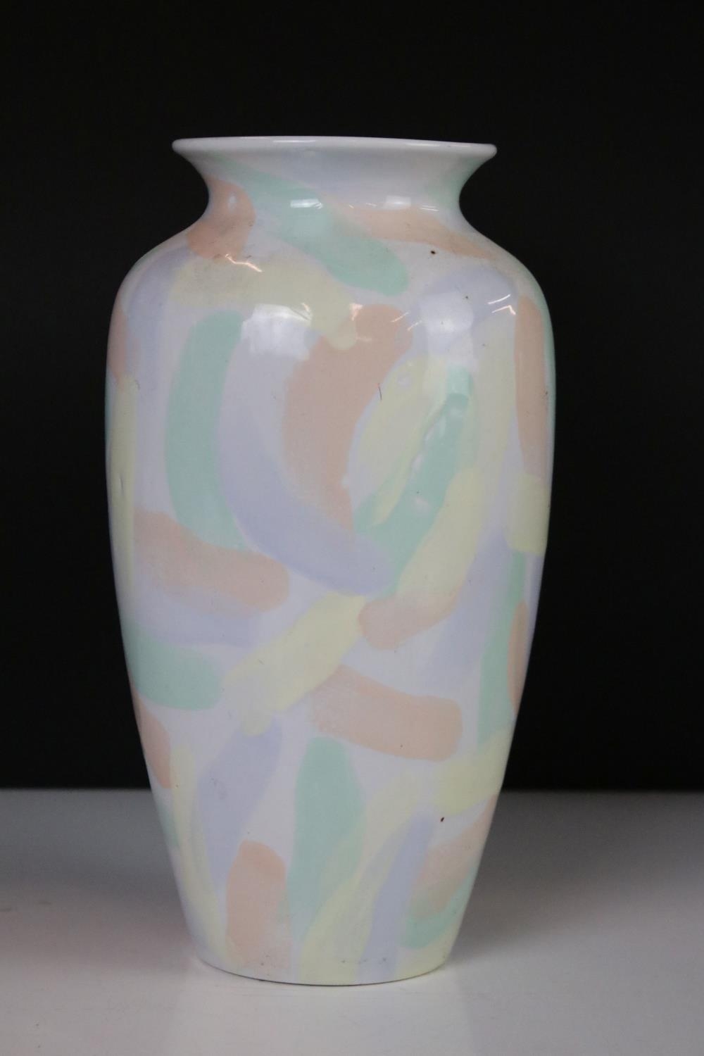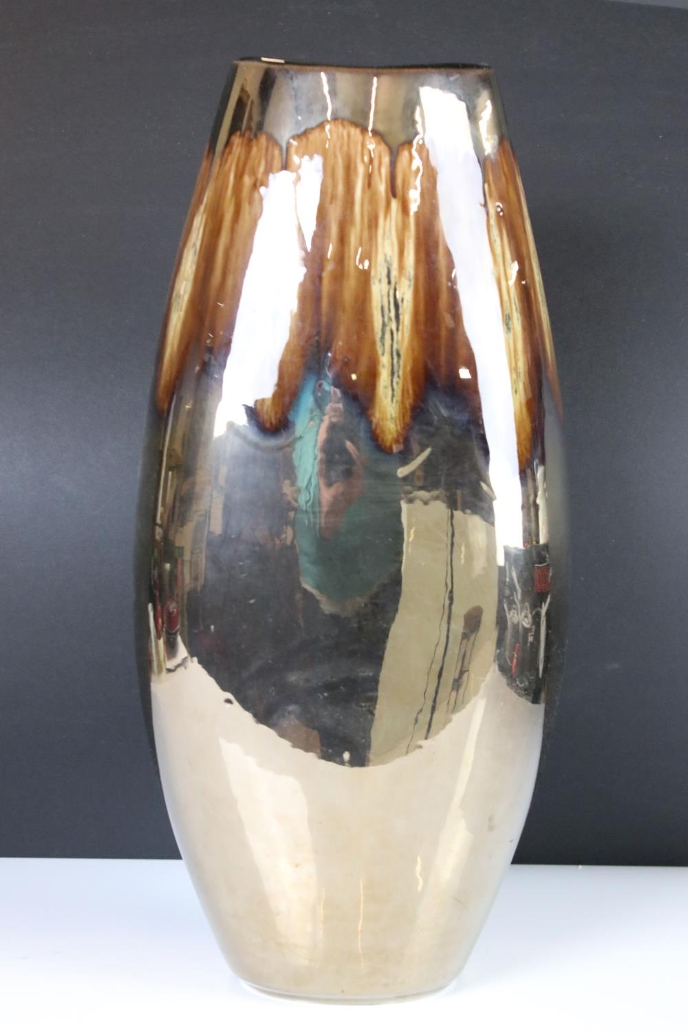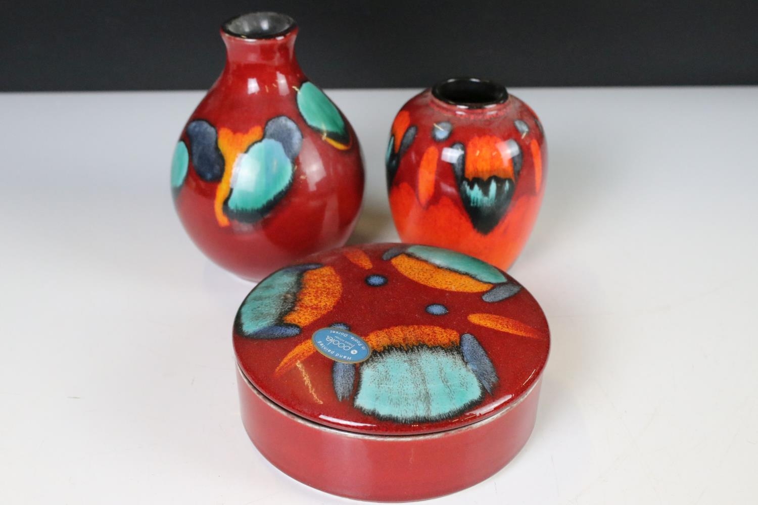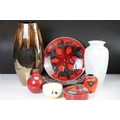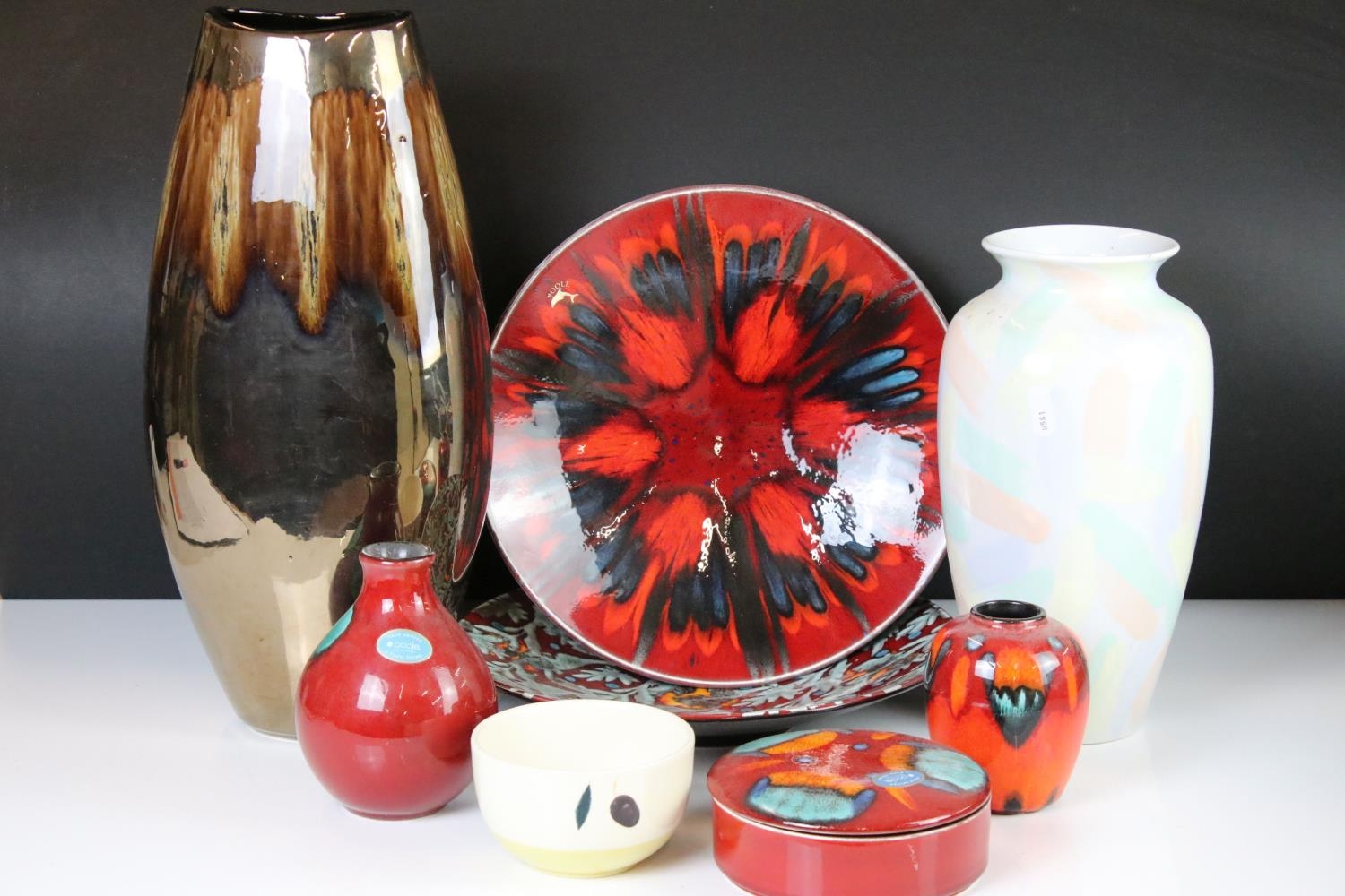 Collection of Poole Pottery including Brown Lustre Vase, 38cm high, Pastel Brush Strokes Vase, 26cm high, Exodus Plate and Red Magma Plate, 27cm diameter, Two Volcanic Vases and a Lidded Box plus a Sugar Bowl