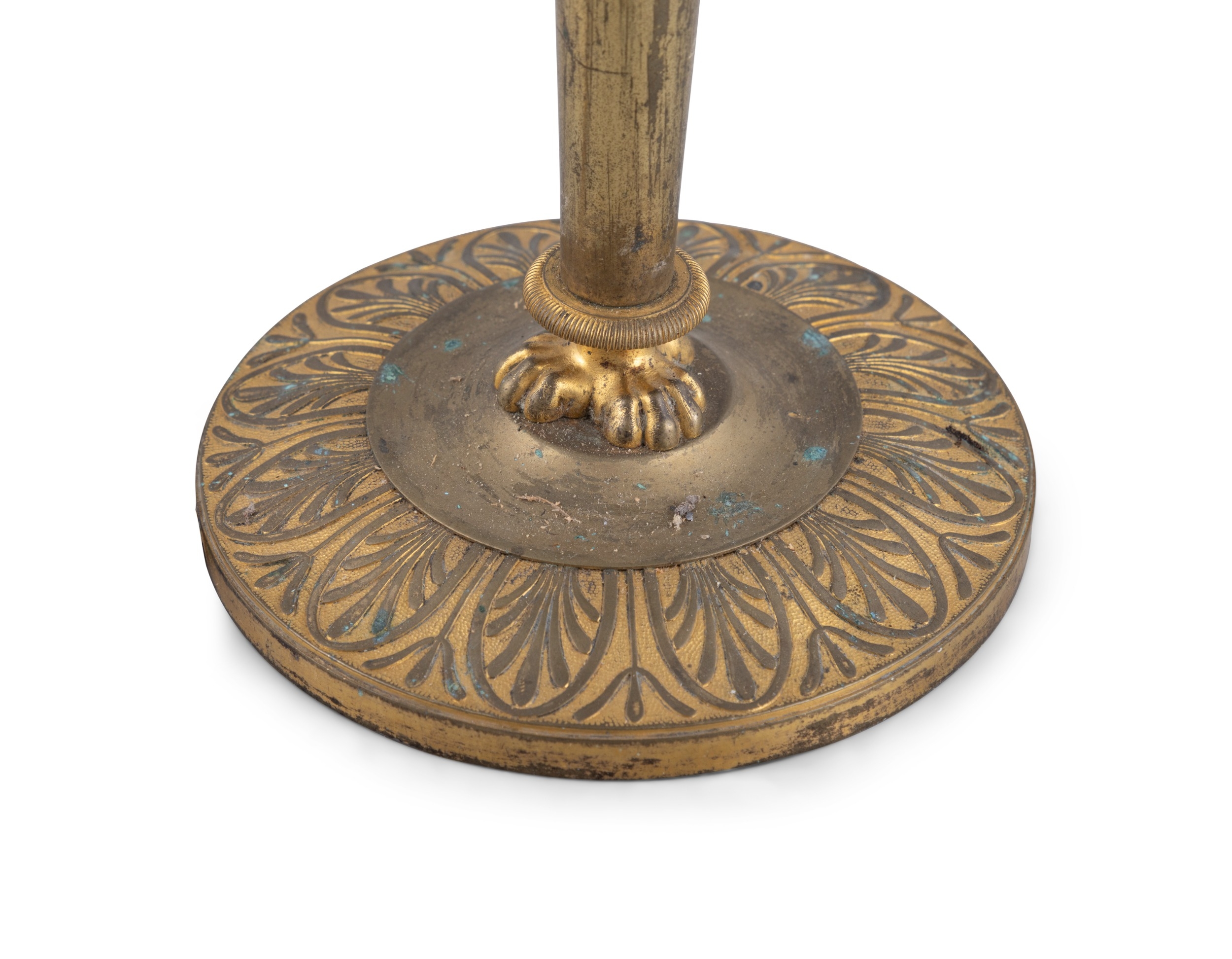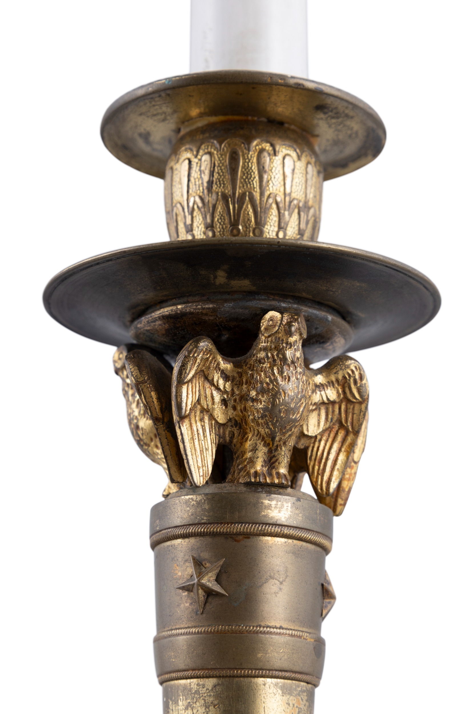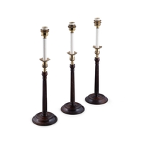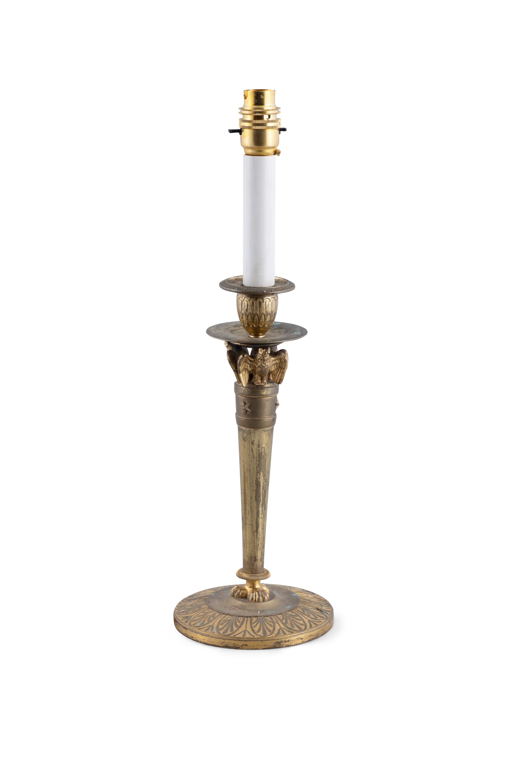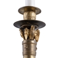 A 19TH CENTURY ORMOLU TABLE LAMP (E) the sockets supported by three carved owls, on a central column and triform paw feet, raised on circular base. with 44cm high ELECTRICAL GOOD IN NEED OF REWIRING ARE INDICATED BY THE SYMBOL **'(E)'** These are sold as 'antiques' only and if bought for use, buyers must have them checked over for compliance with safety regulations by a qualified electrician before you use them. Adam's does not take responsibility for non-functioning electrical goods as most second-hand electrical items sold at auction require re-wiring even if functioning at the time of the auction viewing.
