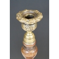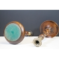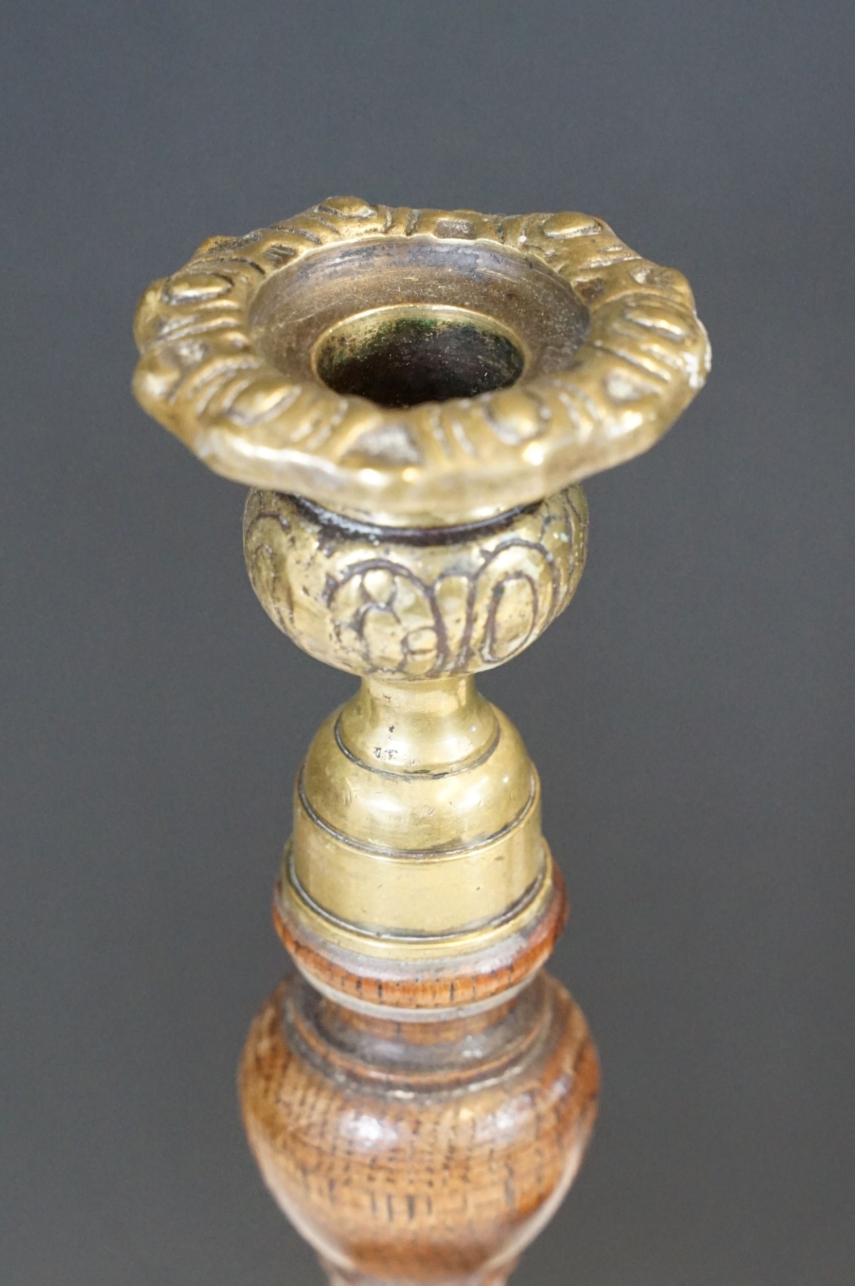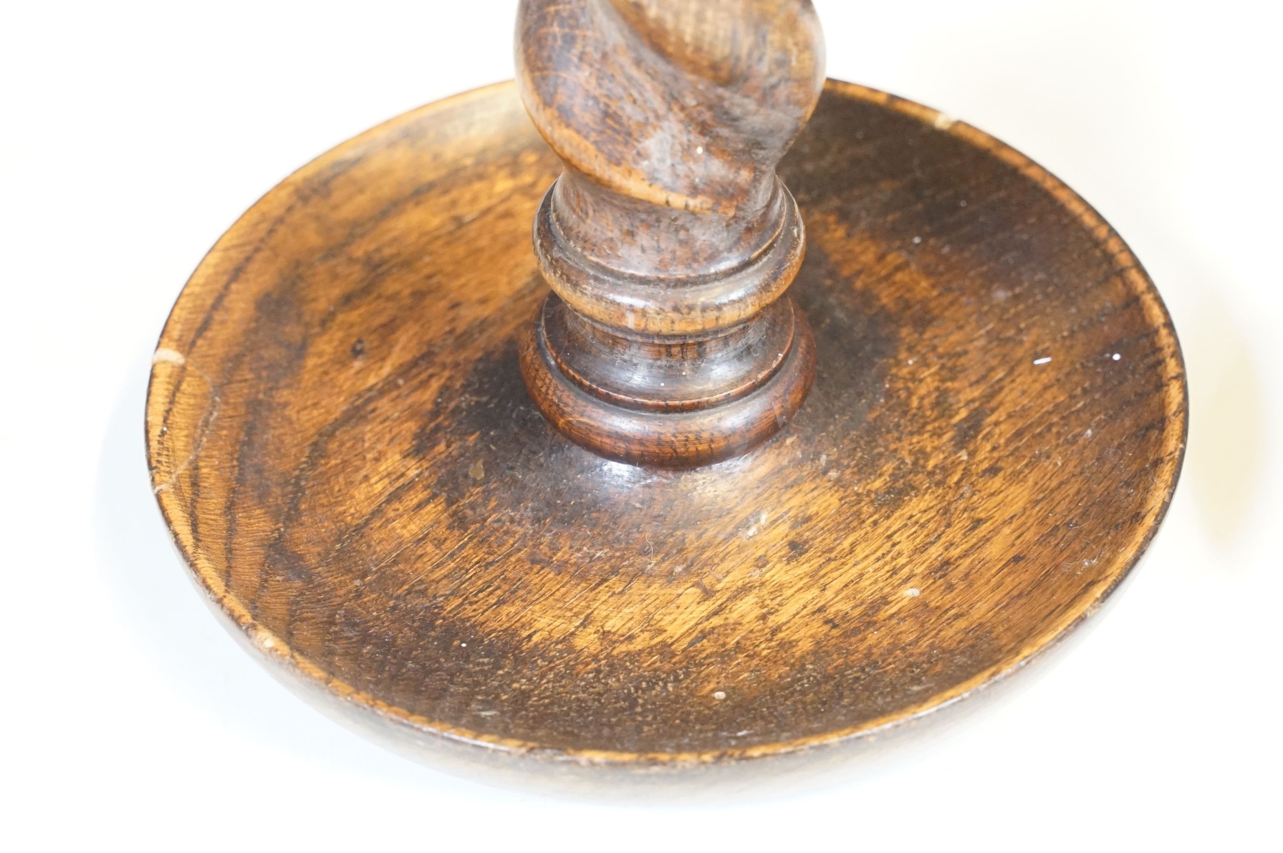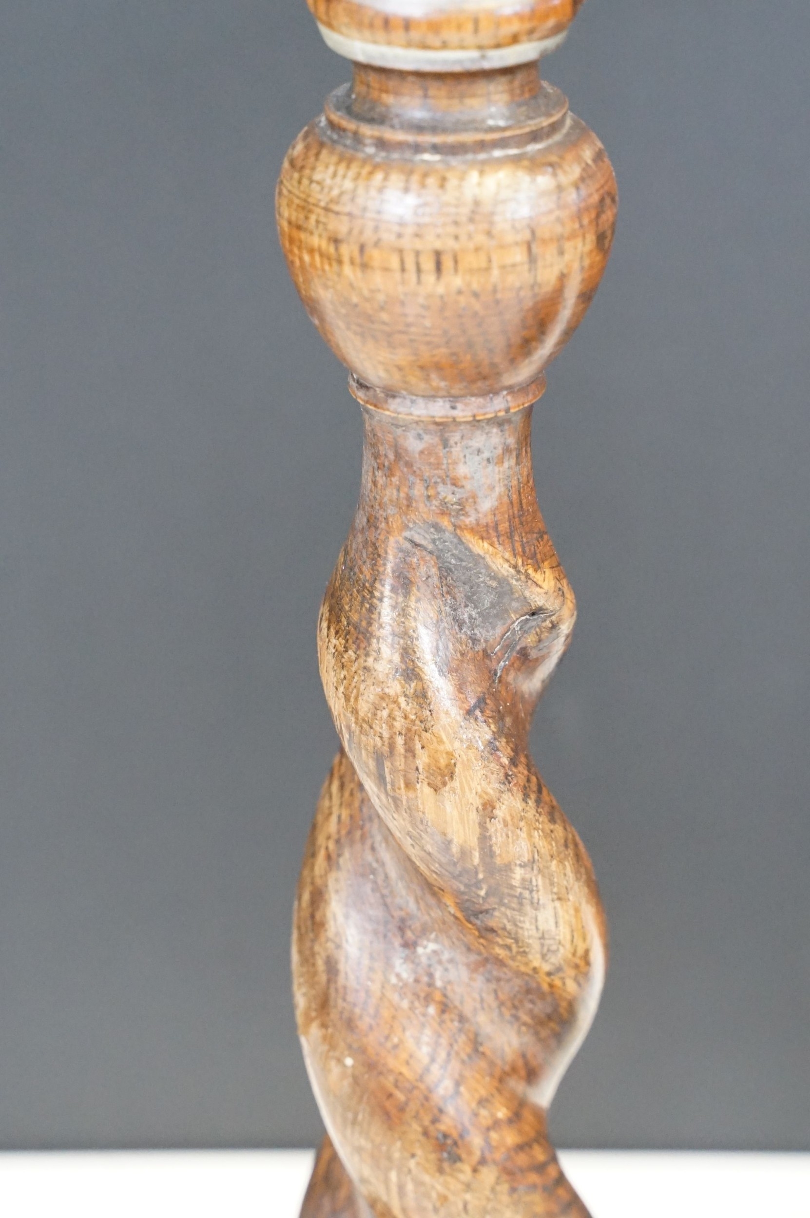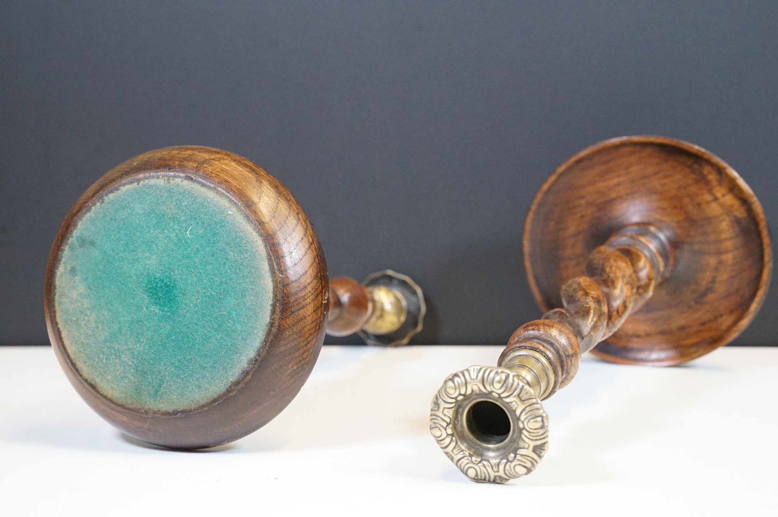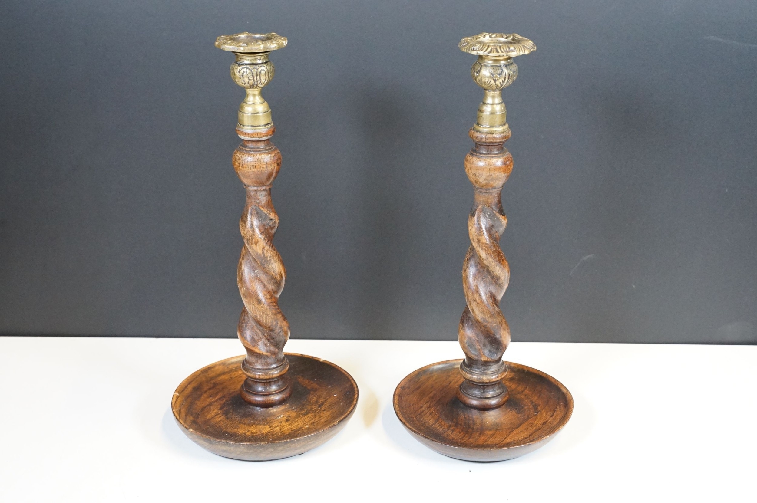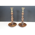 Pair of early 20th century turned oak barley twist candle sticks with circular bases and ornate brass tops (2)
