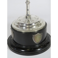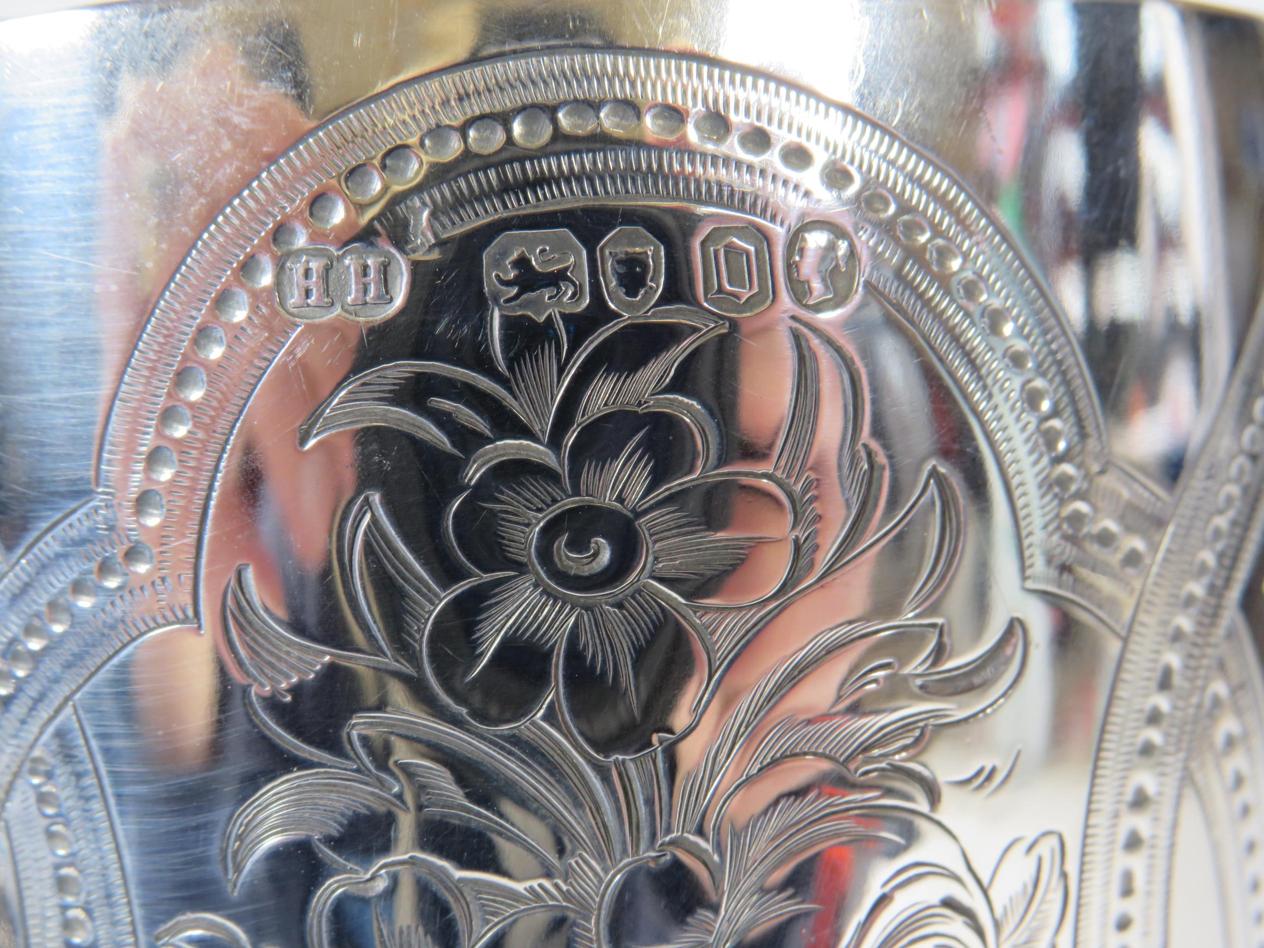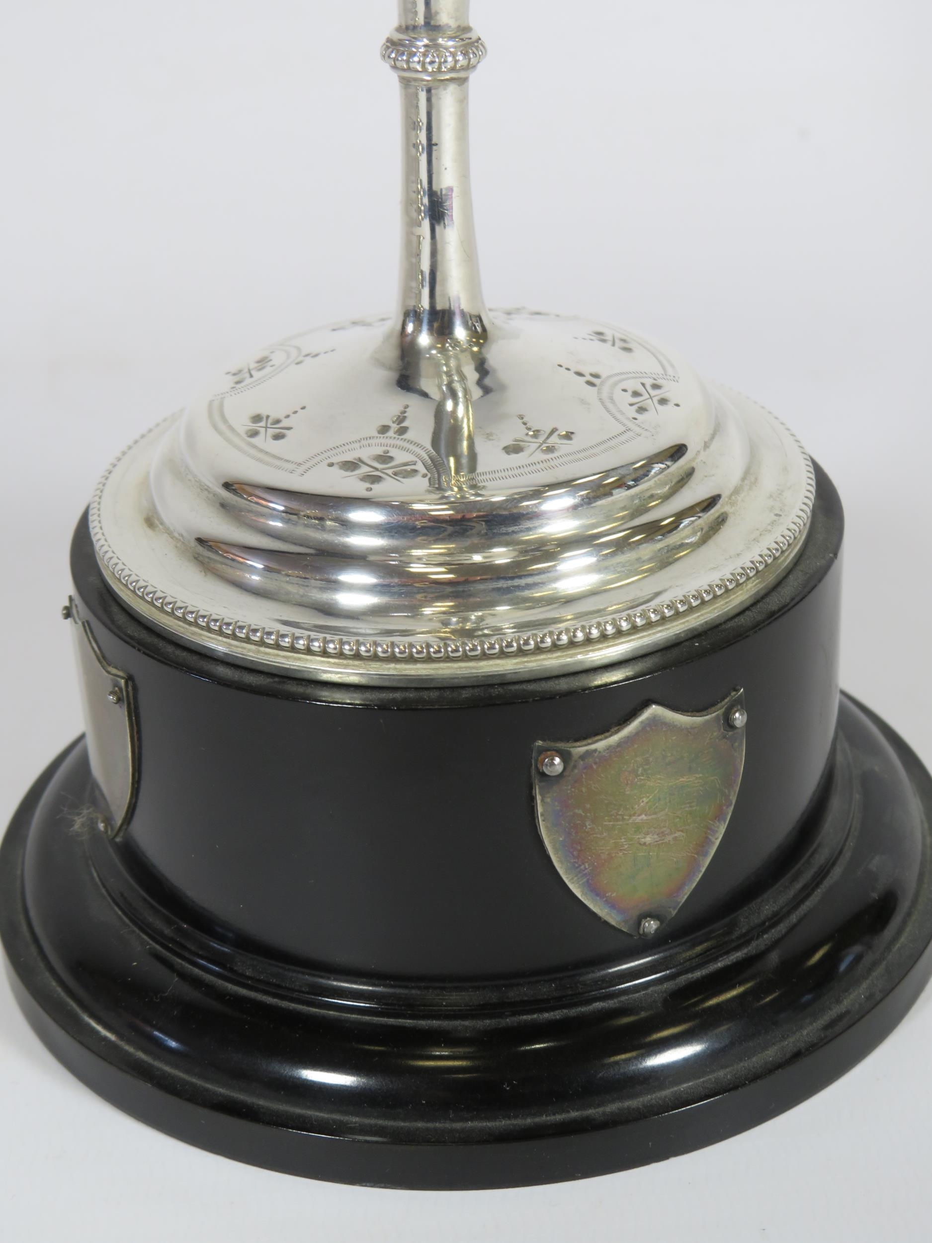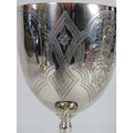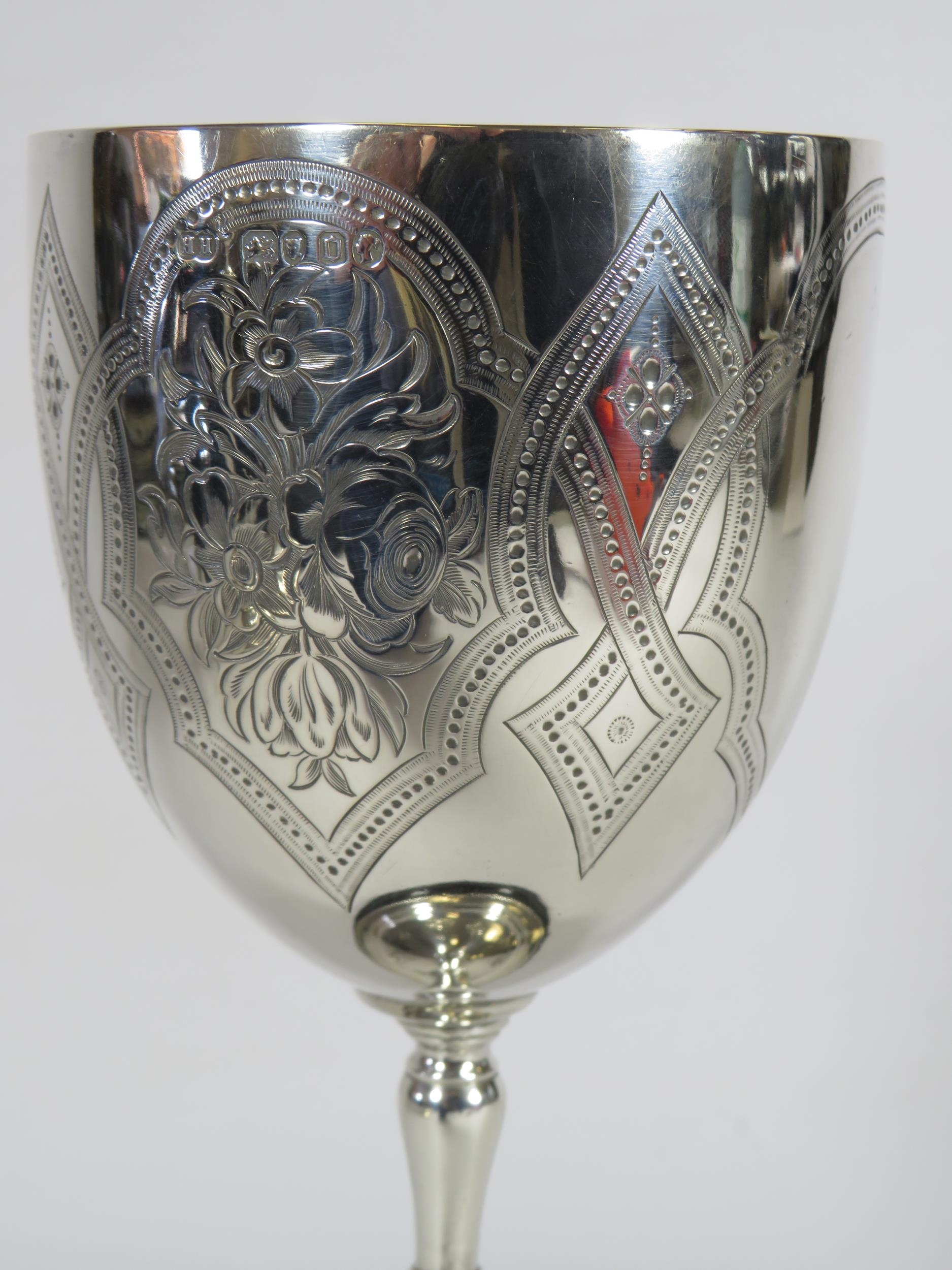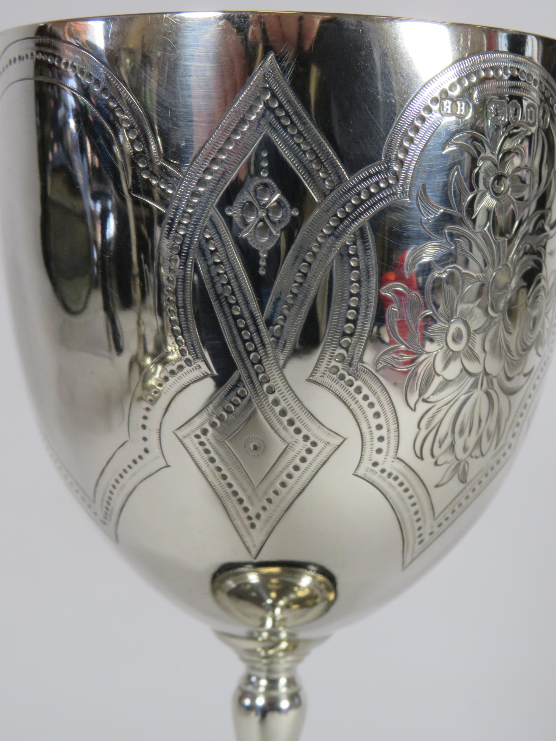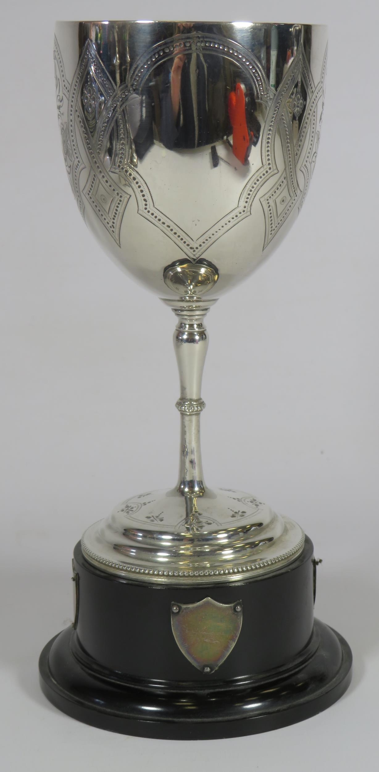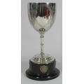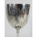 1869 London sterling silver Henry Holland trophy with lemon gilt interior and 4 shields on the base. 9" tall. Total silver weight 228 grams.