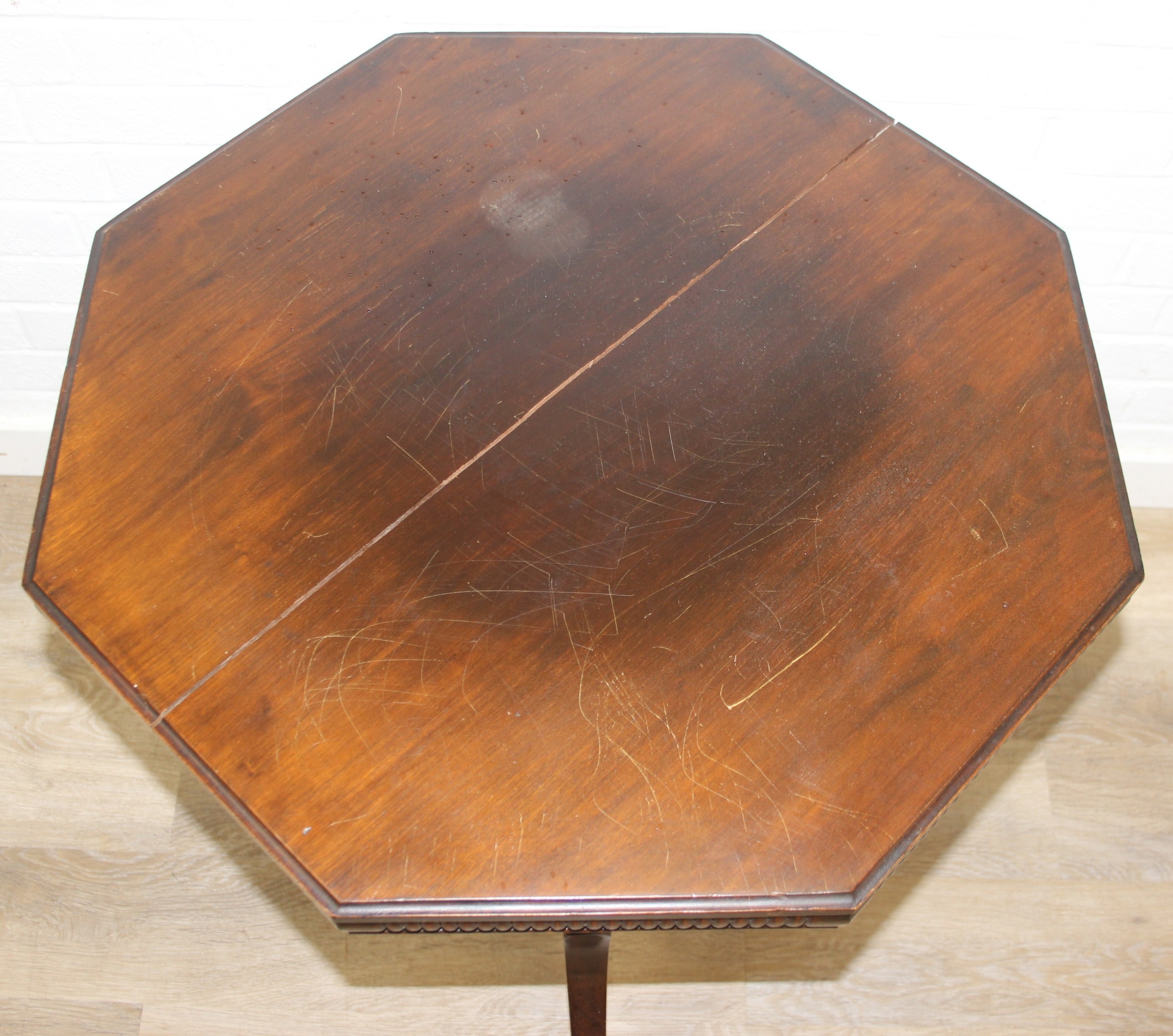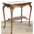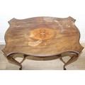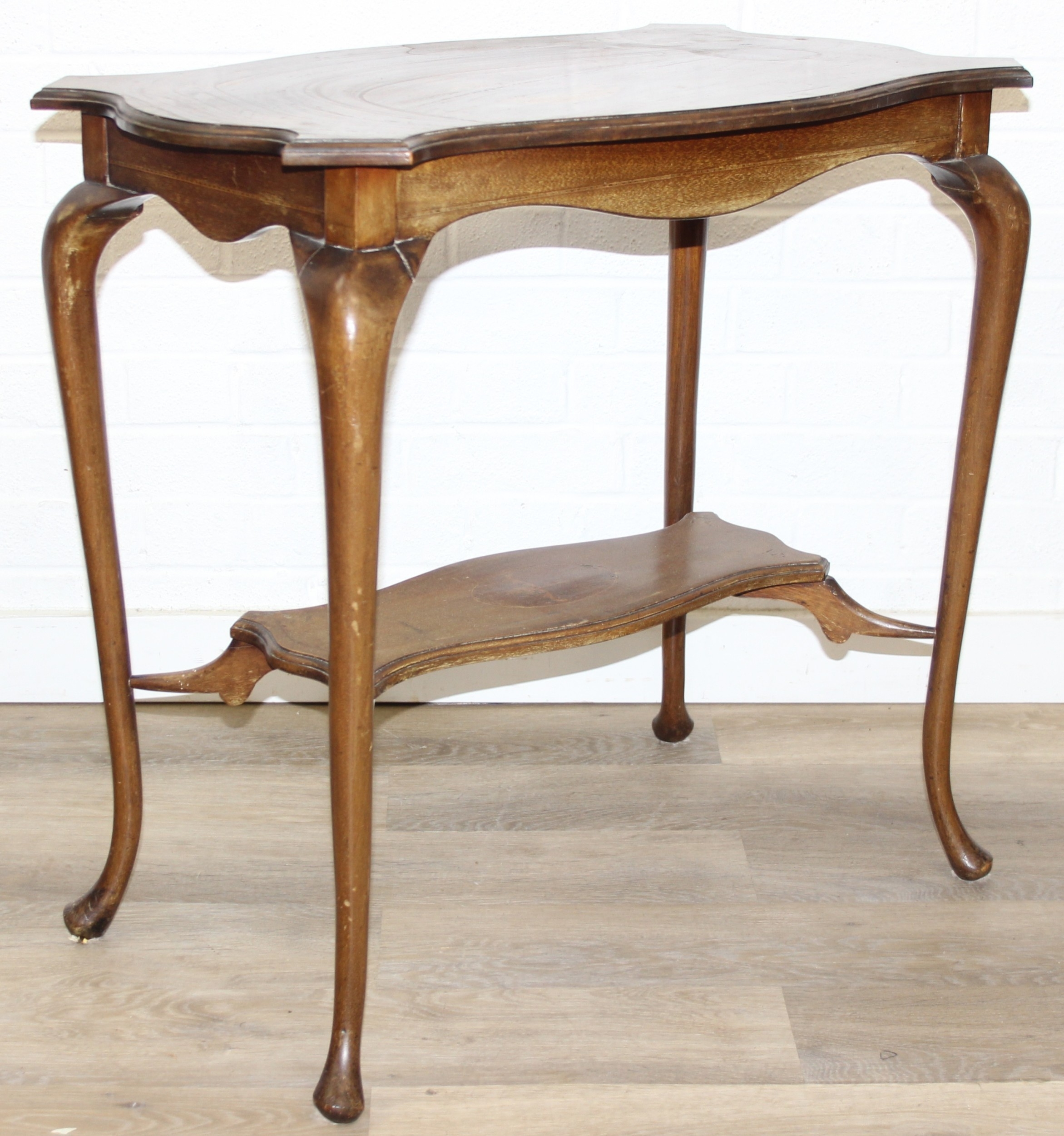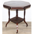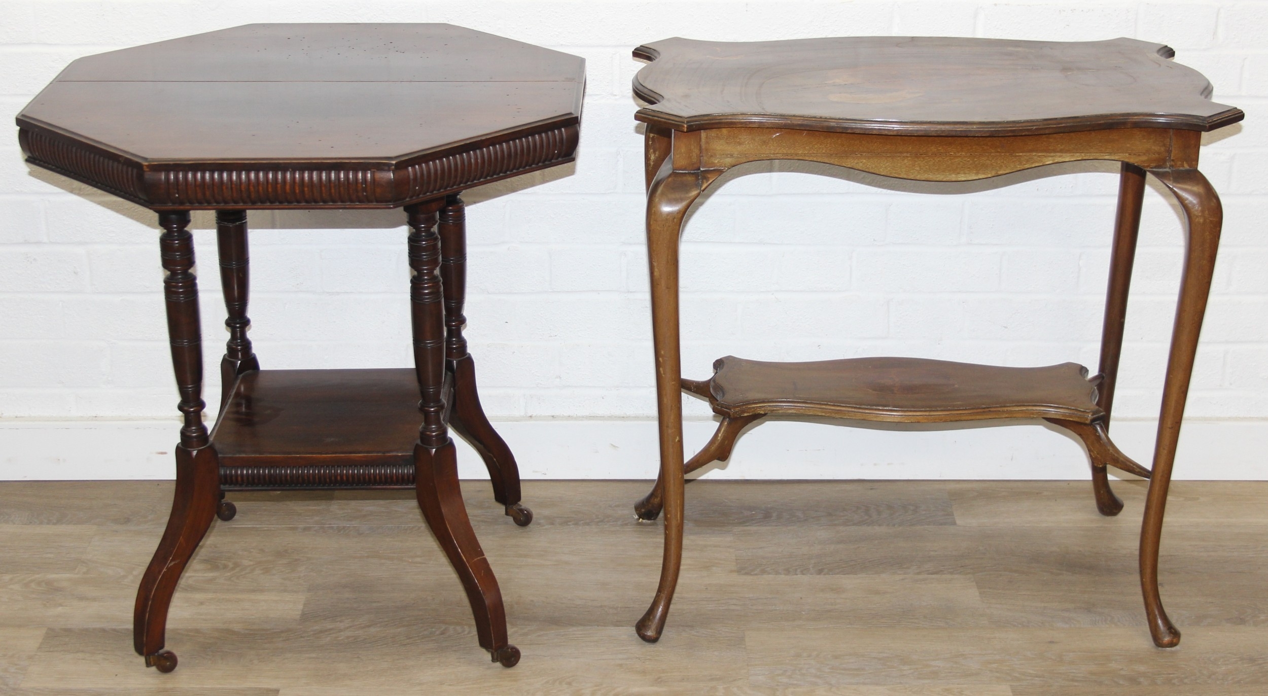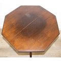 An Edwardian octagonal topped mahogany table, stamped for Joslins of Colchester under, and a further Edwardian table with Sheraton Revival inlay, the Sheraton table 74cm x 45cm x 72cm [2]