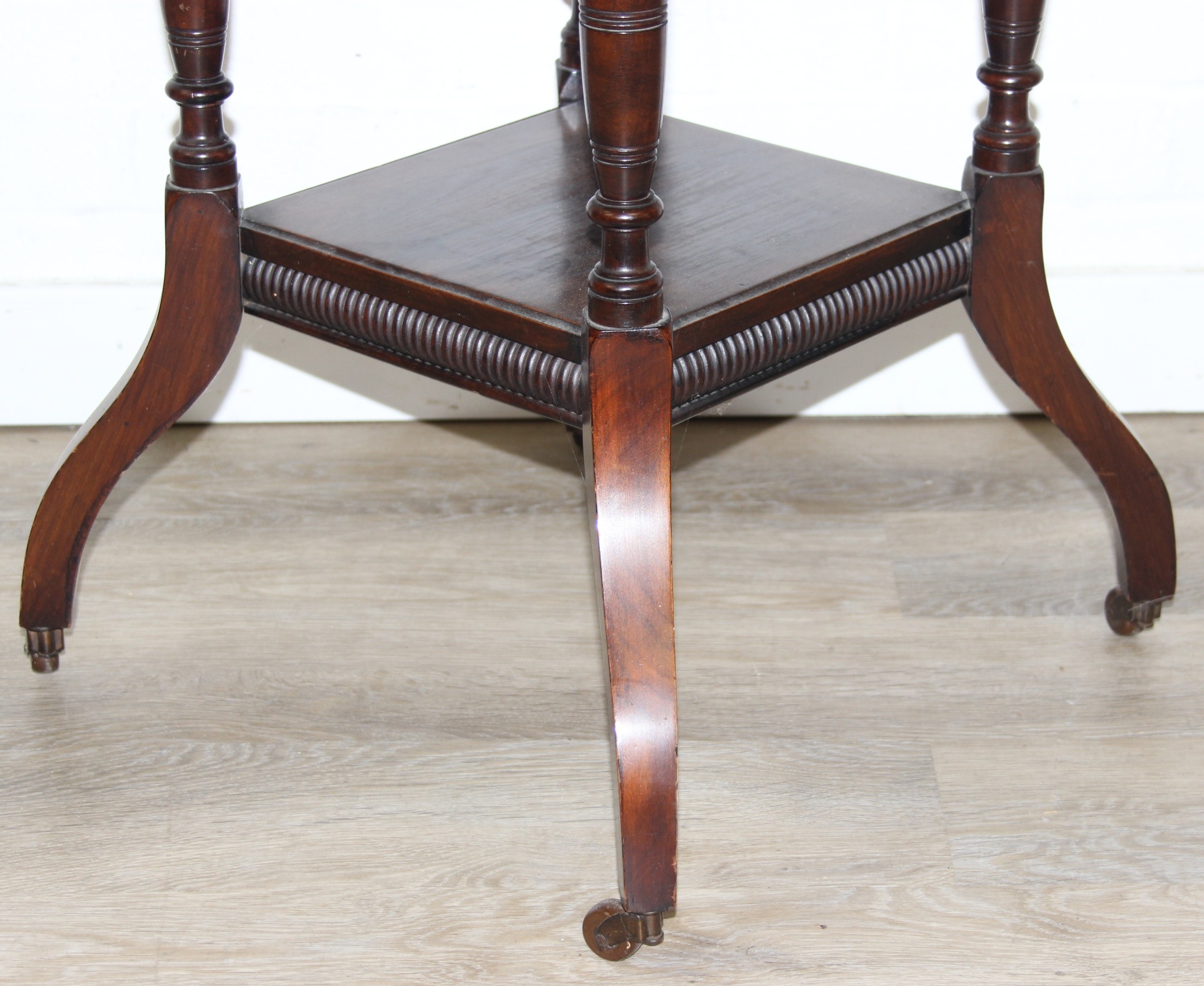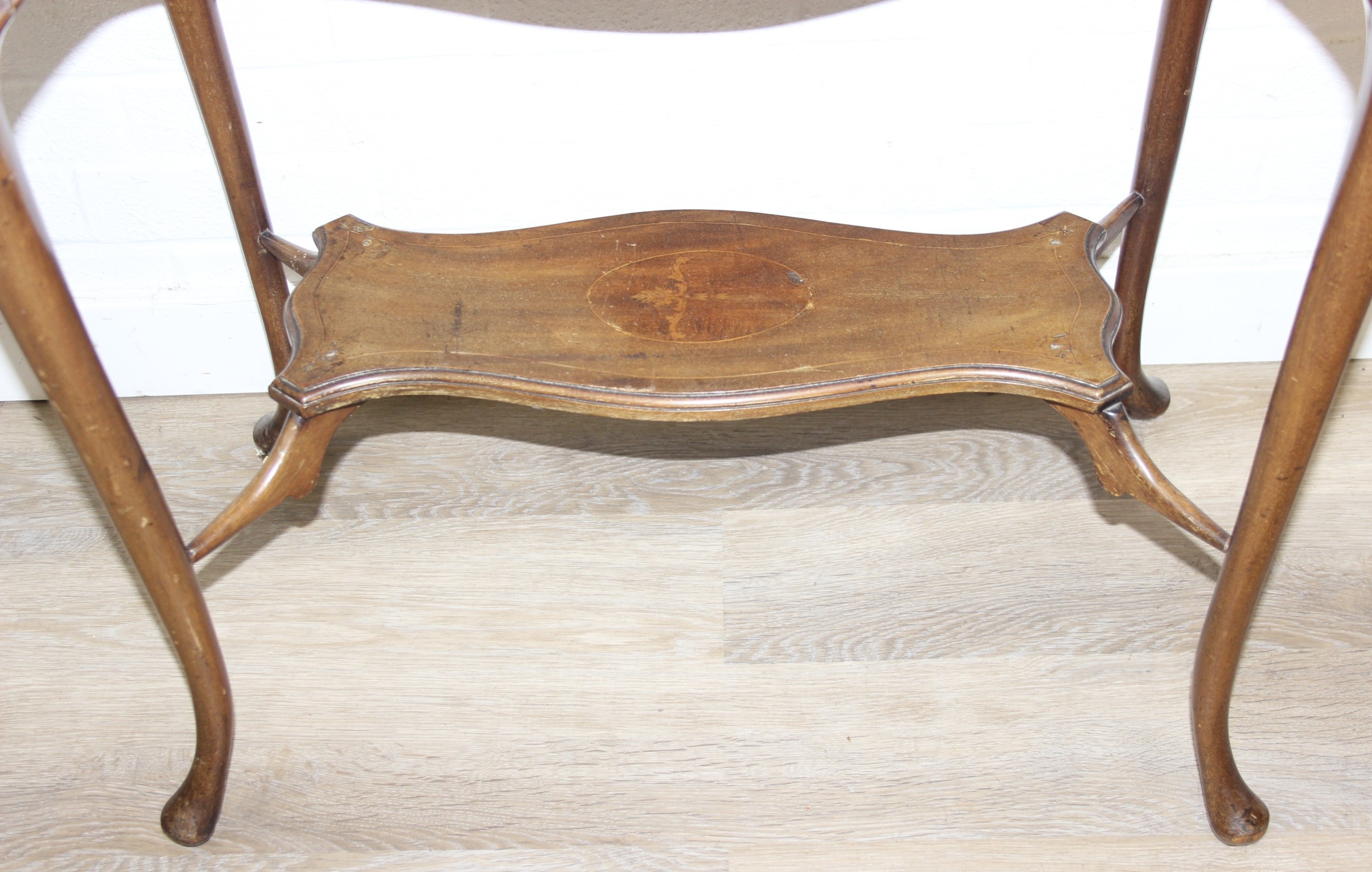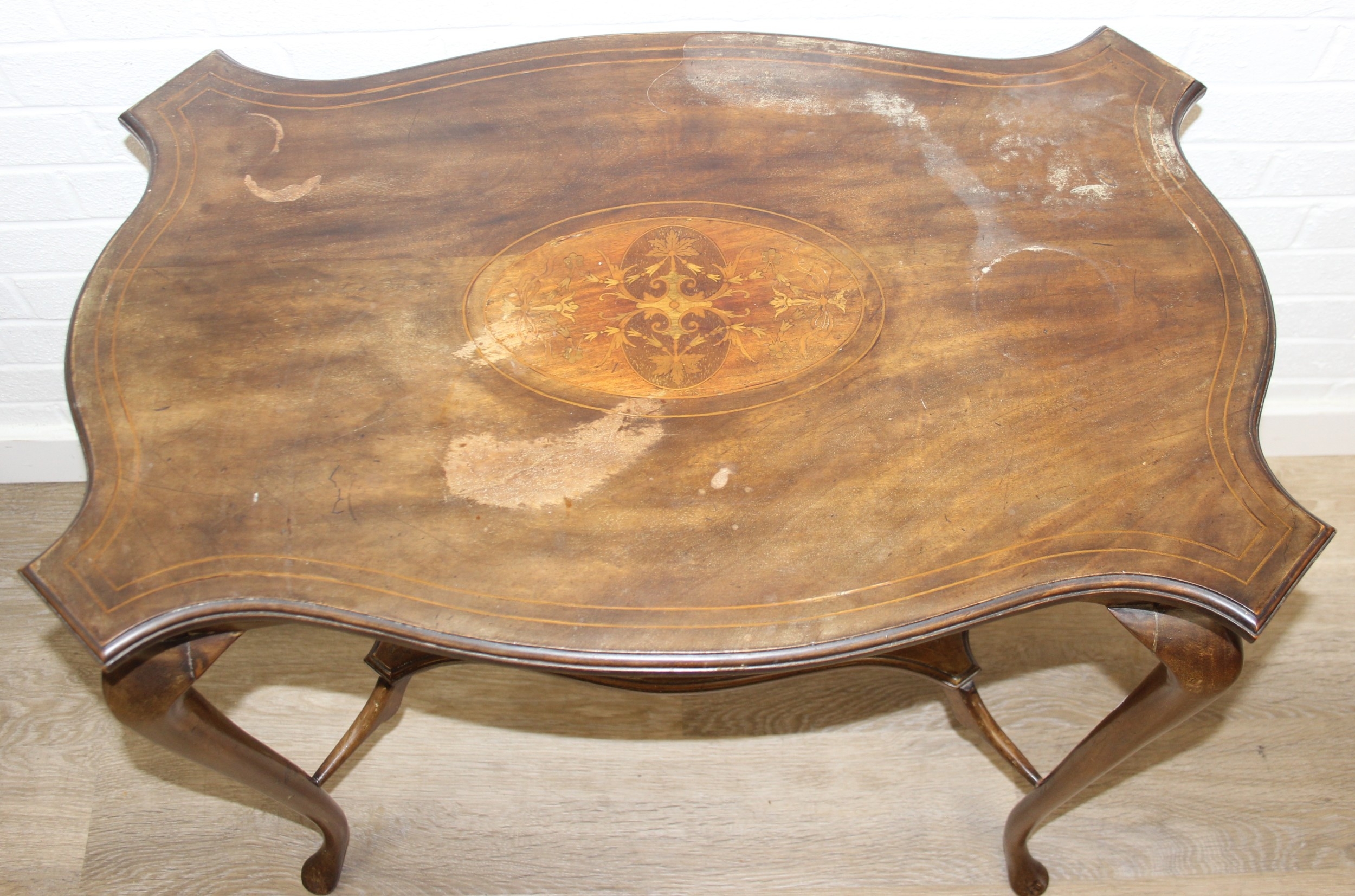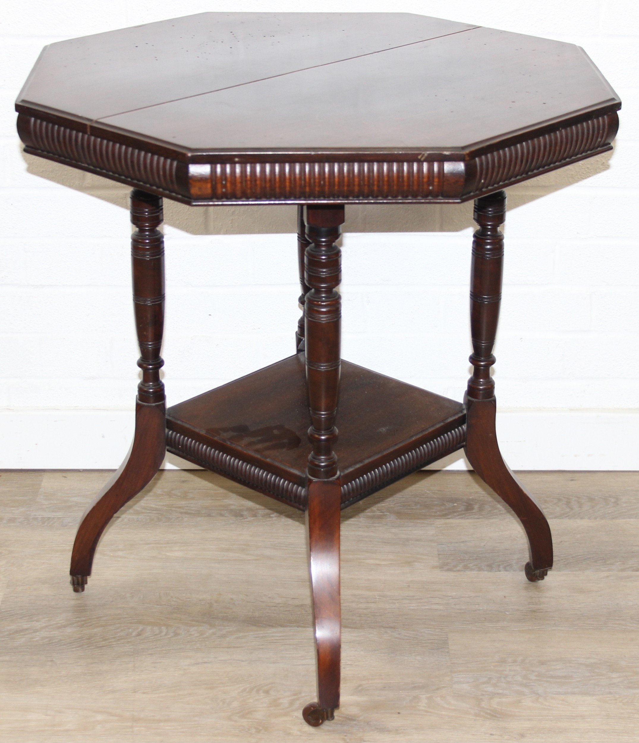 An Edwardian octagonal topped mahogany table, stamped for Joslins of Colchester under, and a further Edwardian table with Sheraton Revival inlay, the Sheraton table 74cm x 45cm x 72cm [2]