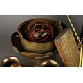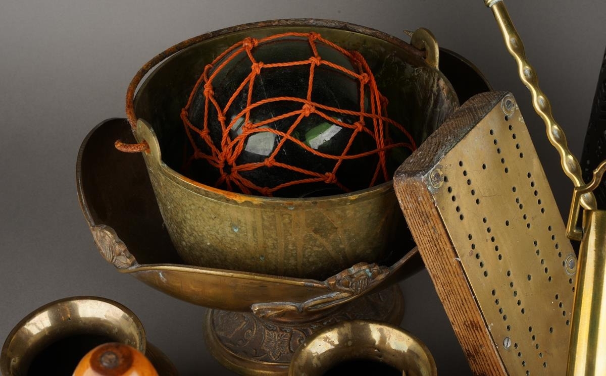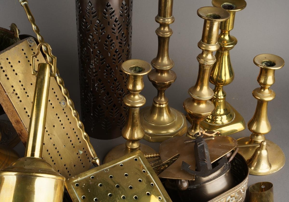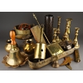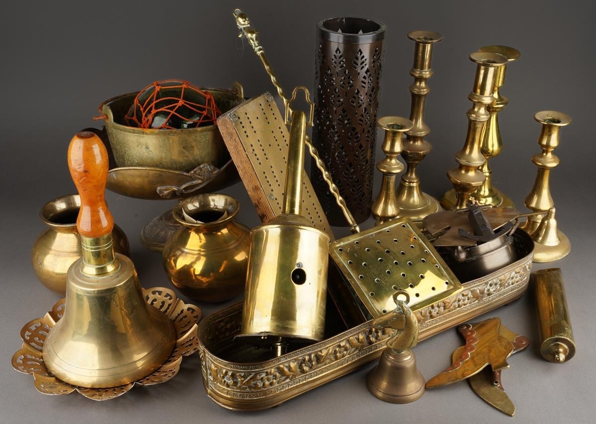 Assorted English and Continental copper and brass including a pair of Indian urns / bowls, chestnut warming pan, various candlesticks, a large bell, Indian oval raised bowl, pan, oval serving dish, brass spit Jack etc [1 box - Q]