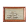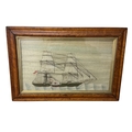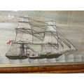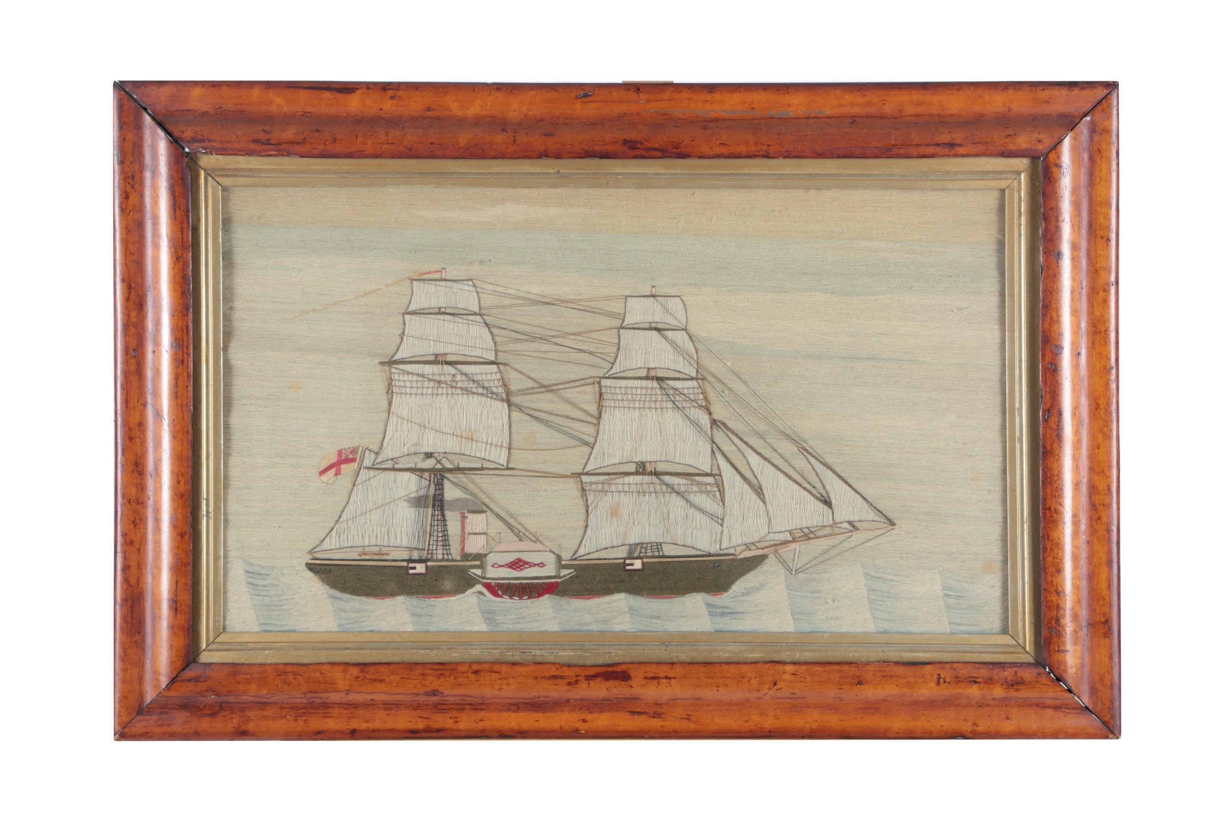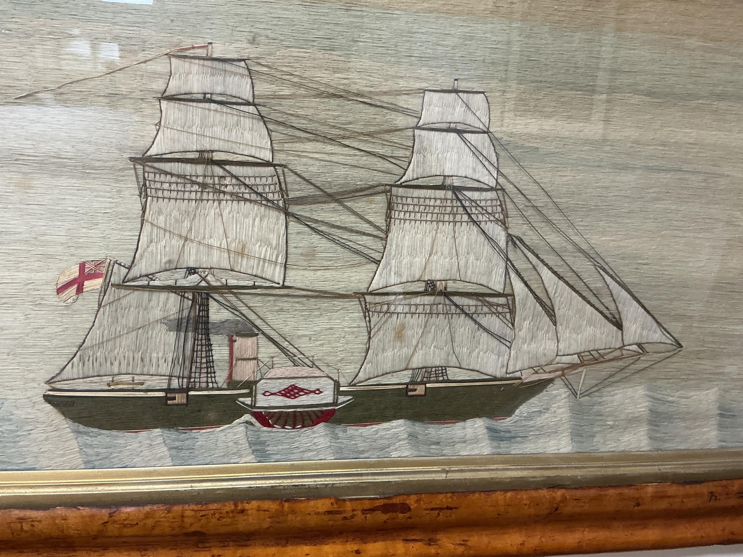 A 19th century 'folk art' sailors woolwork embroidery or 'woolie' of a fully rigged British steam assisted ship. Worked in long stem stitch in various coloured wools mounted and framed with a maple frame. 60cm x 34cm.
