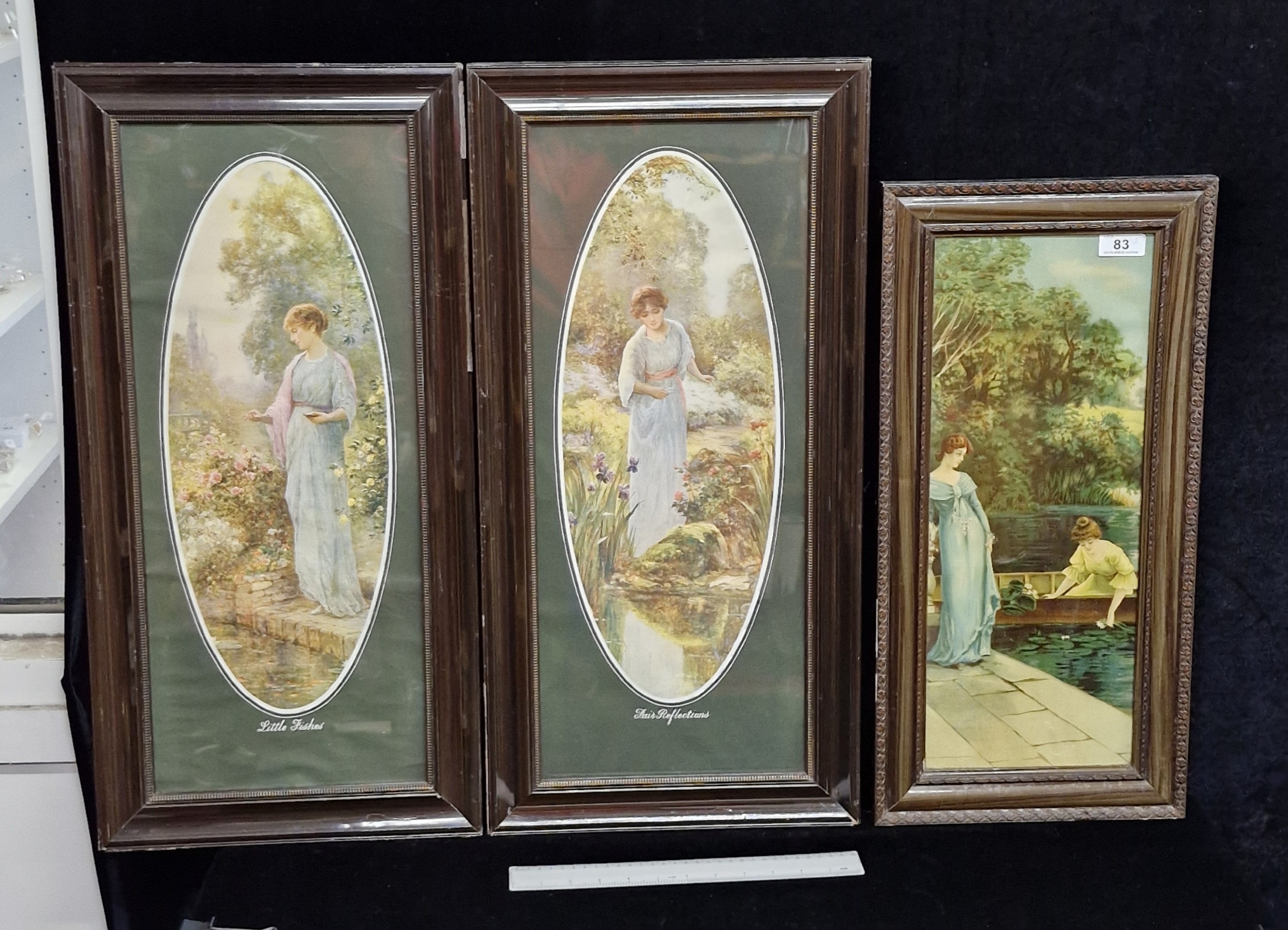Three charming vintage prints including a pair after paintings by 'Ernest Walbourn' titled 'Fair Reflections' and 'Little Fishes'. All featuring elegant ladies in English garden settings.