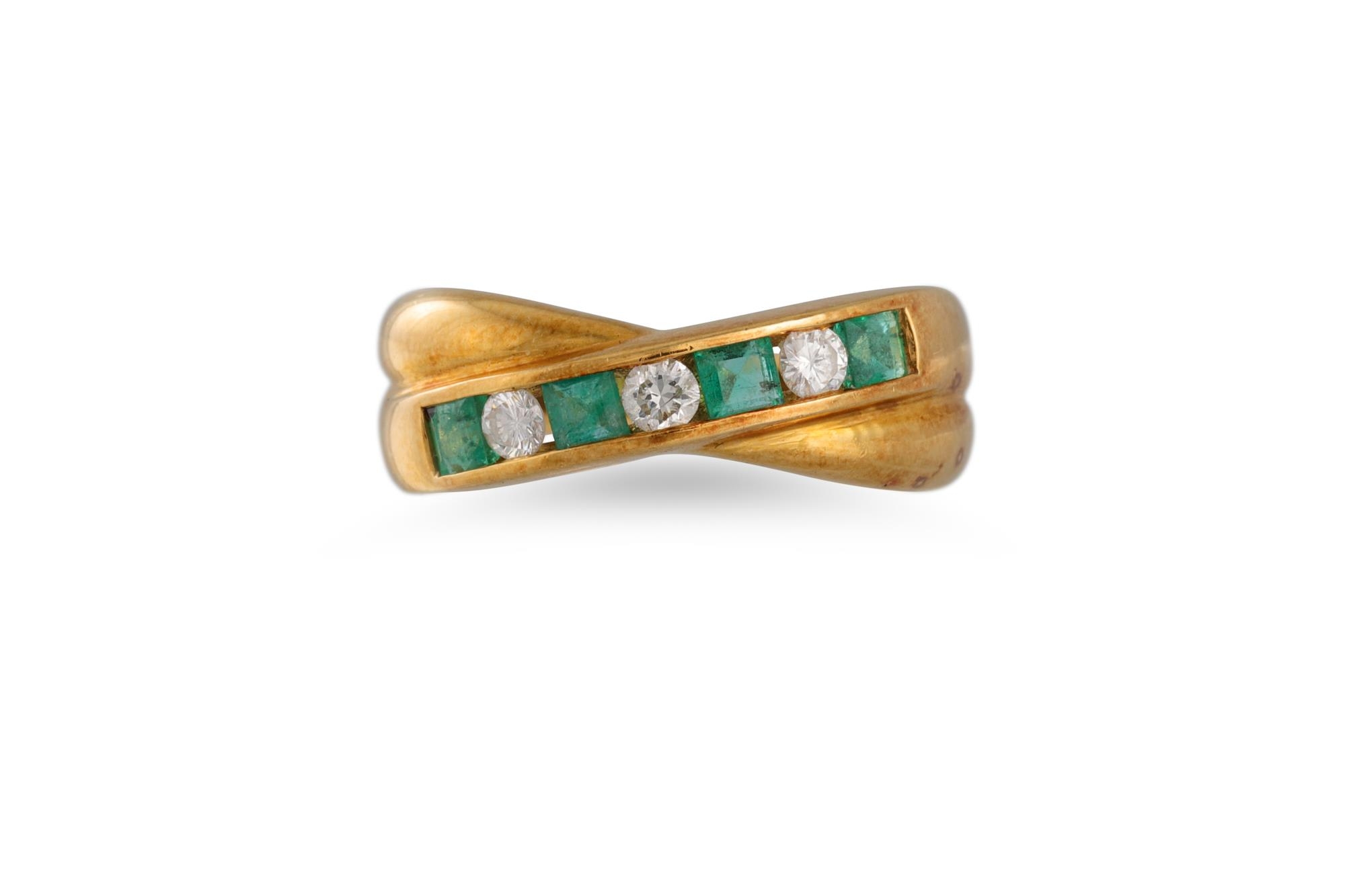 AN EMERALD AND DIAMOND CROSS OVER RING, mounted in 18ct yellow gold, size M - N