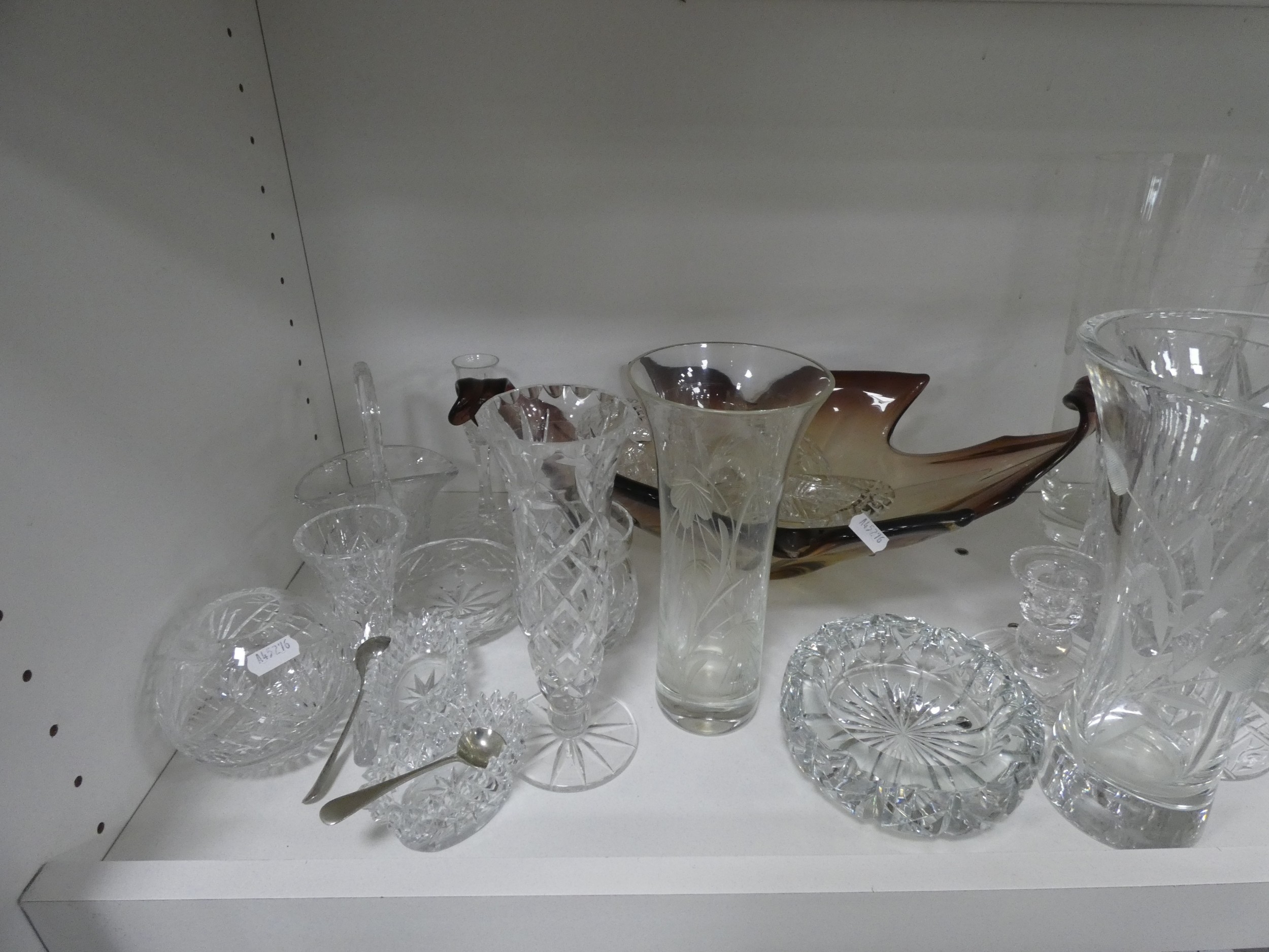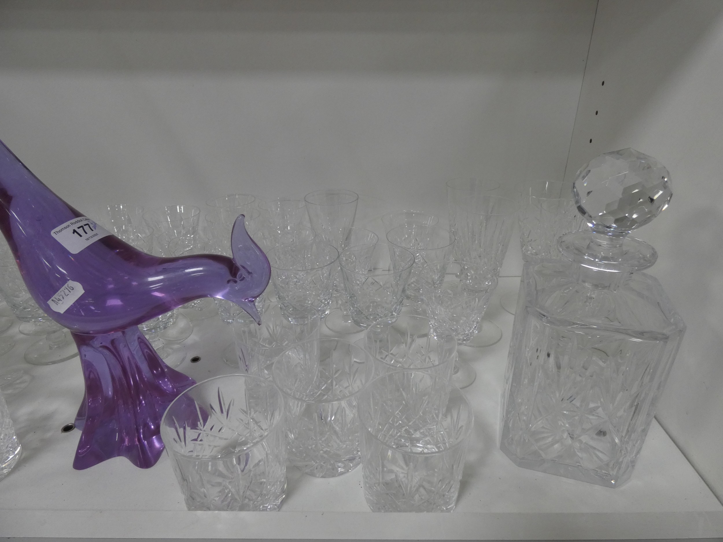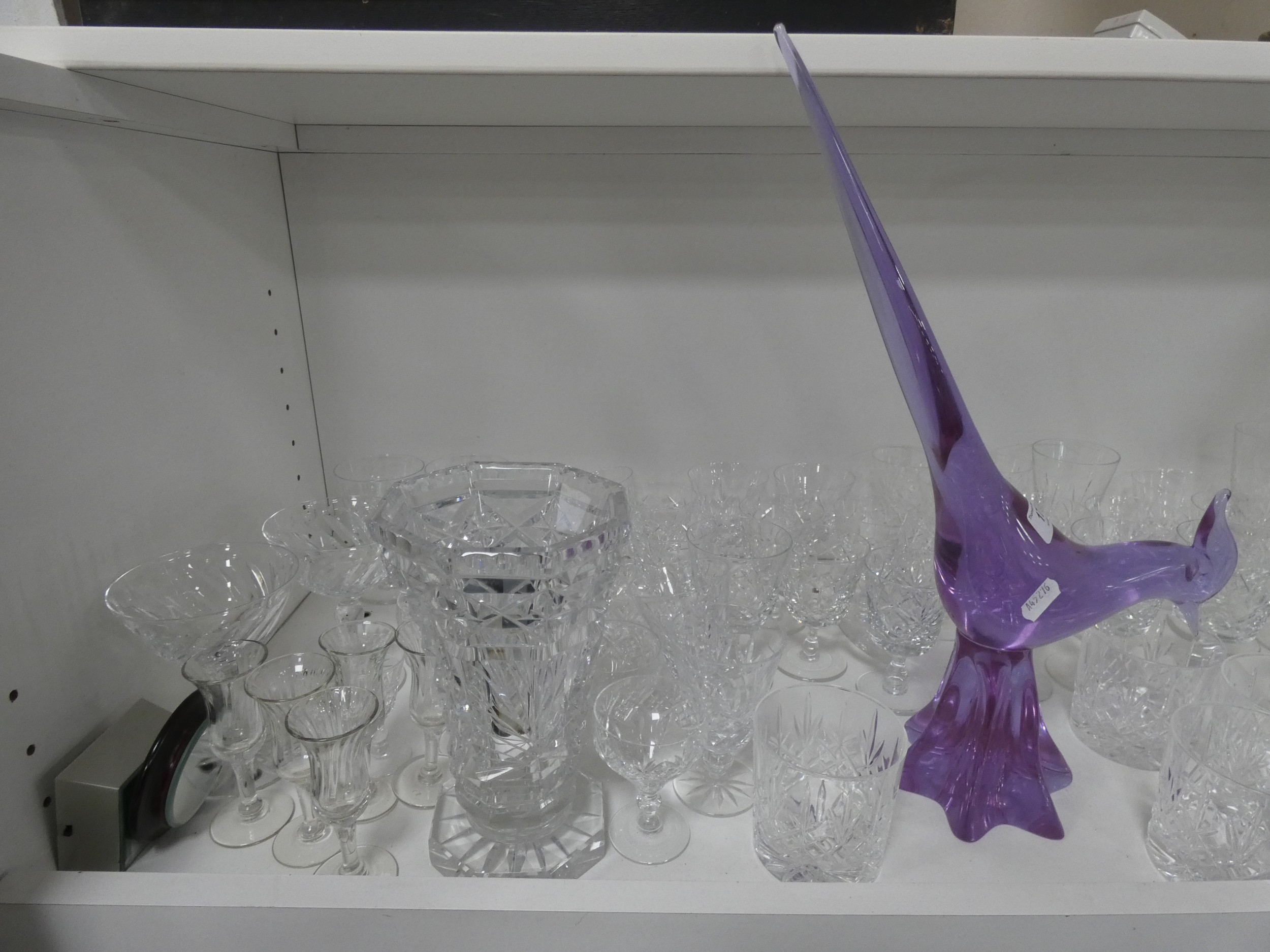Crystal and glassware to include decanter, whisky glasses, wine, liqueur and sherry glasses, vases, bowls, art glass bird ornament etc (two shelves).