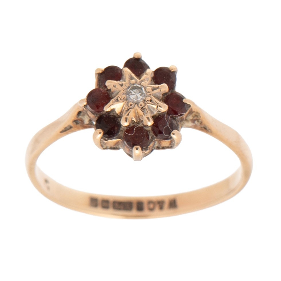 A 9ct gold, garnet and diamond flower head ring, the illusion starburst set central diamond of approximately 1.5mm, surrounded by eight garnets, ring size N/O, 1.8g.