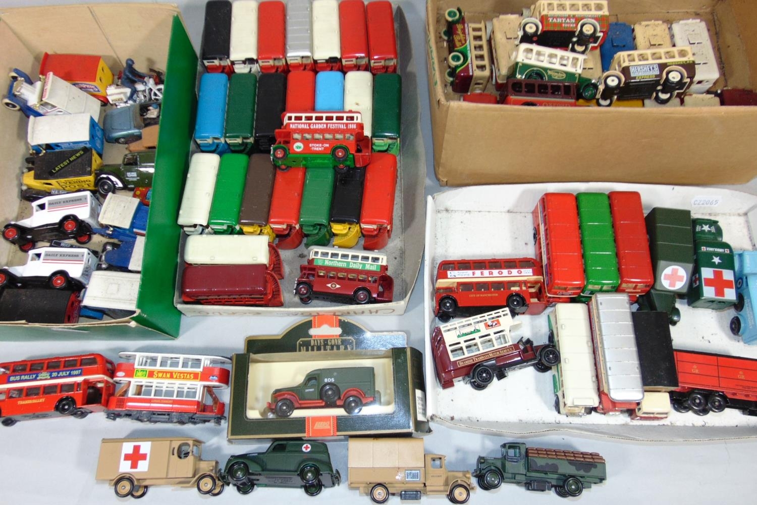 Large quantity of cars, buses and trucks mostly by Lledo including many from Days Gone range, together with a boxful of unsorted empty Lledo boxes from same source