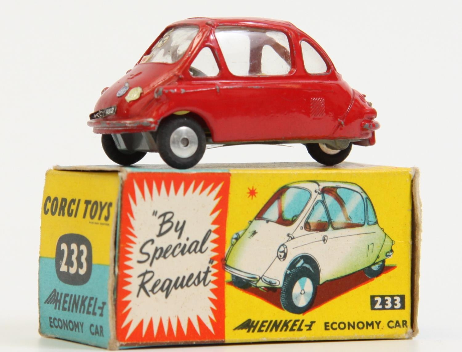 Corgi Toys 233 Heinkel Economy car, red body, yellow interior, boxed