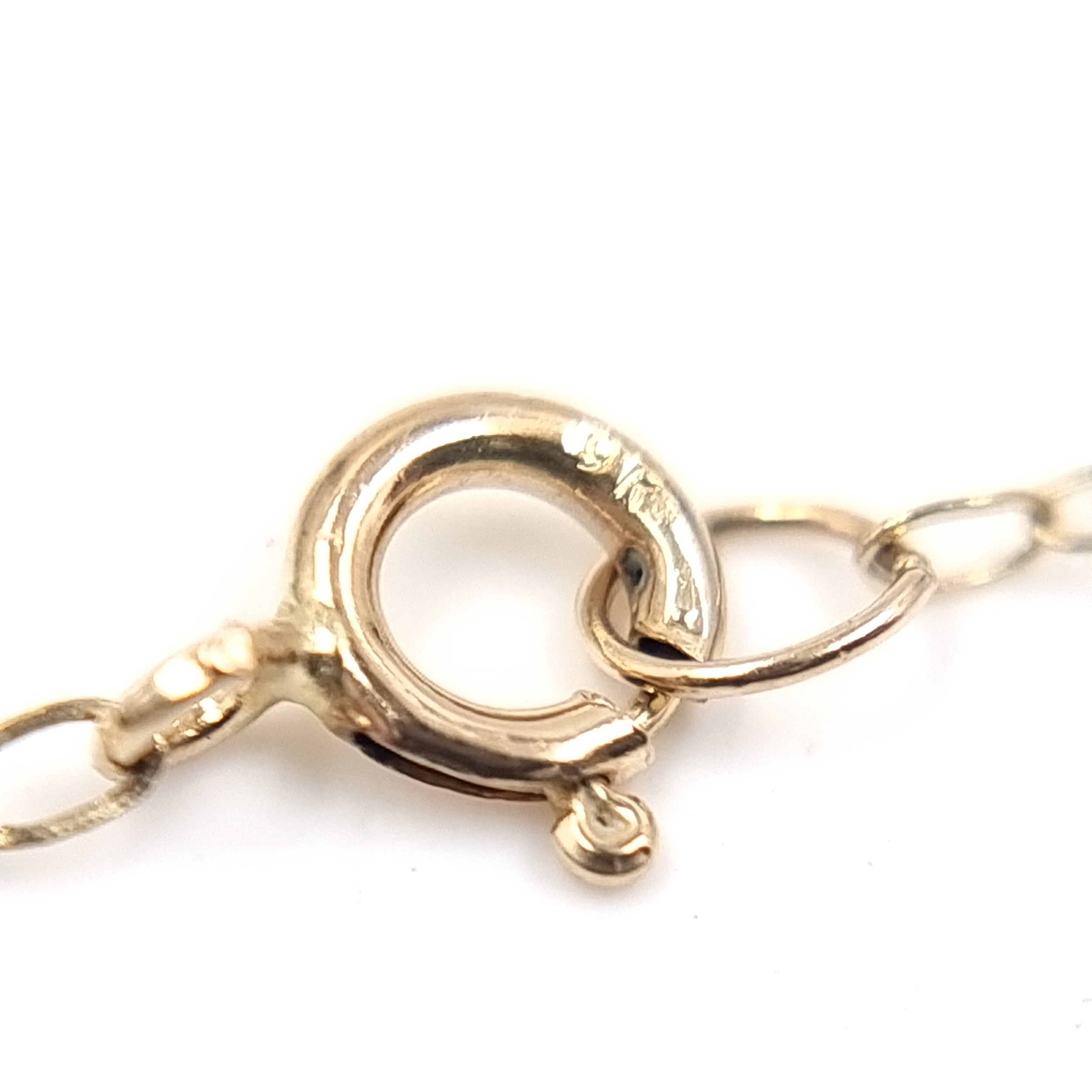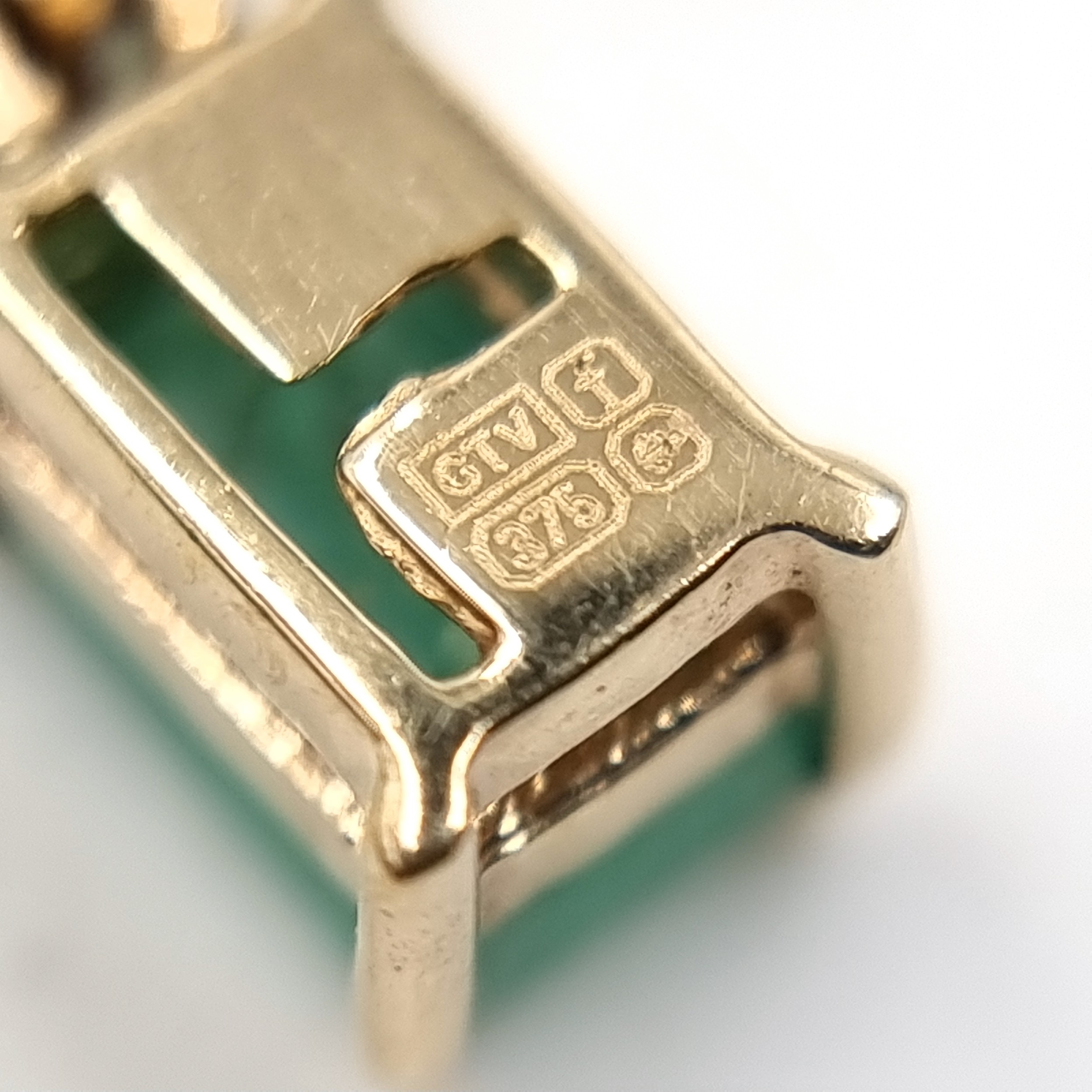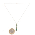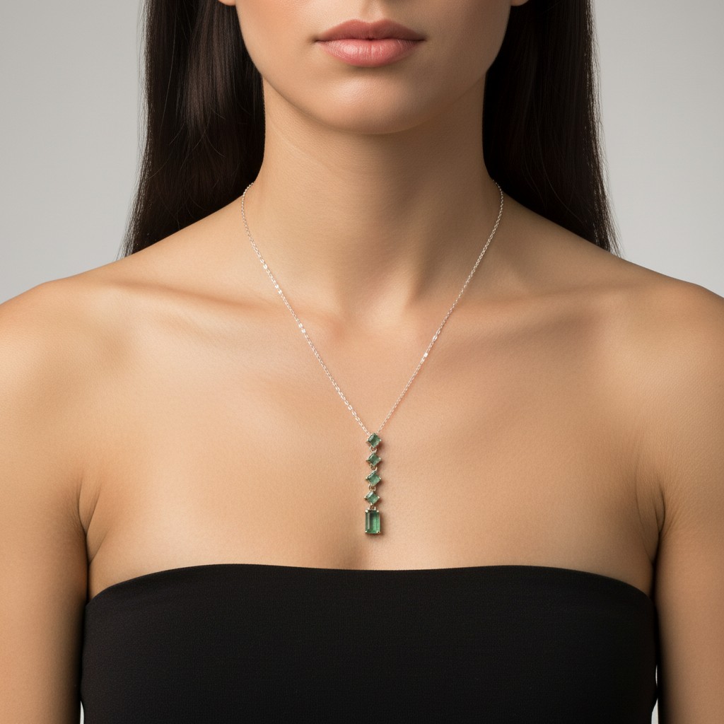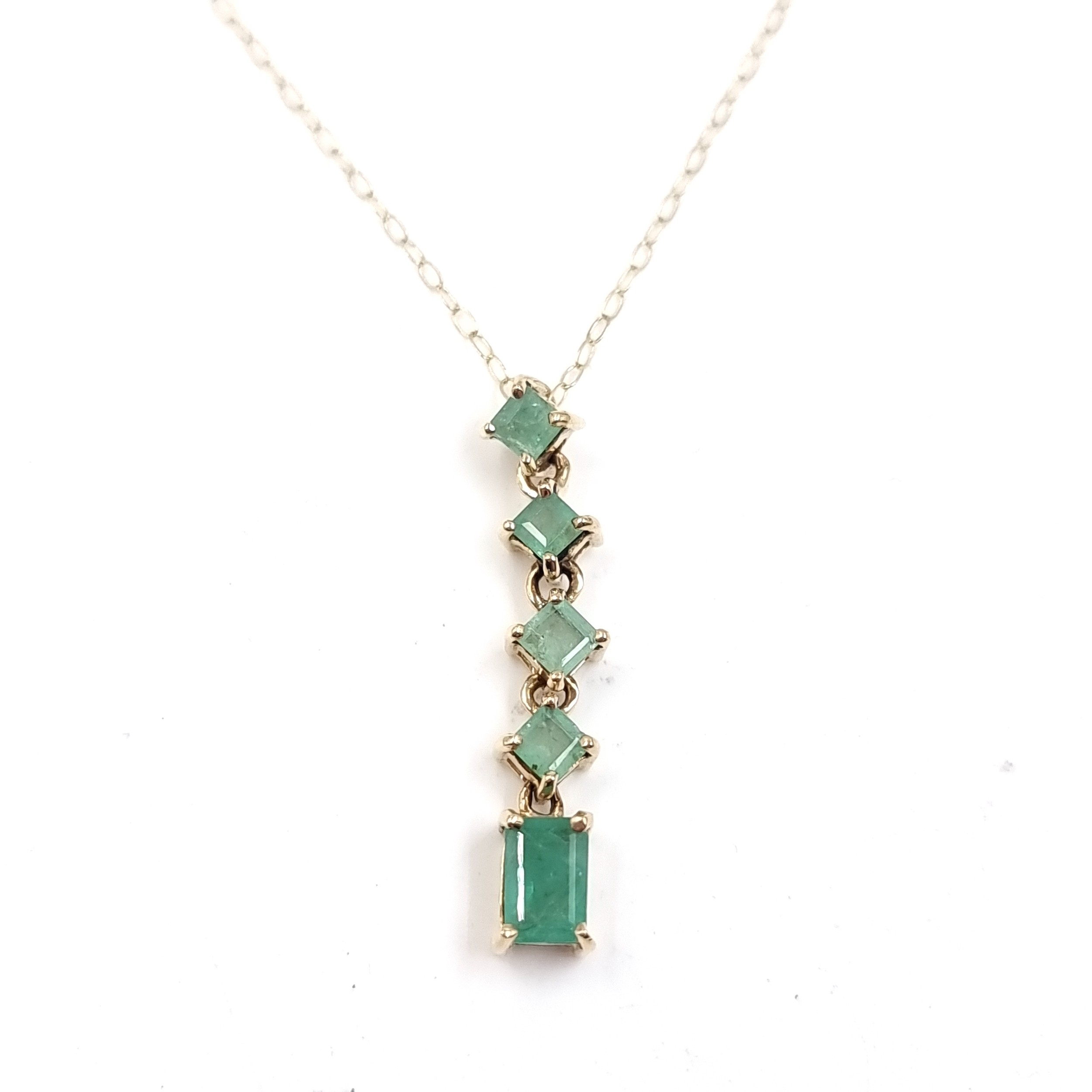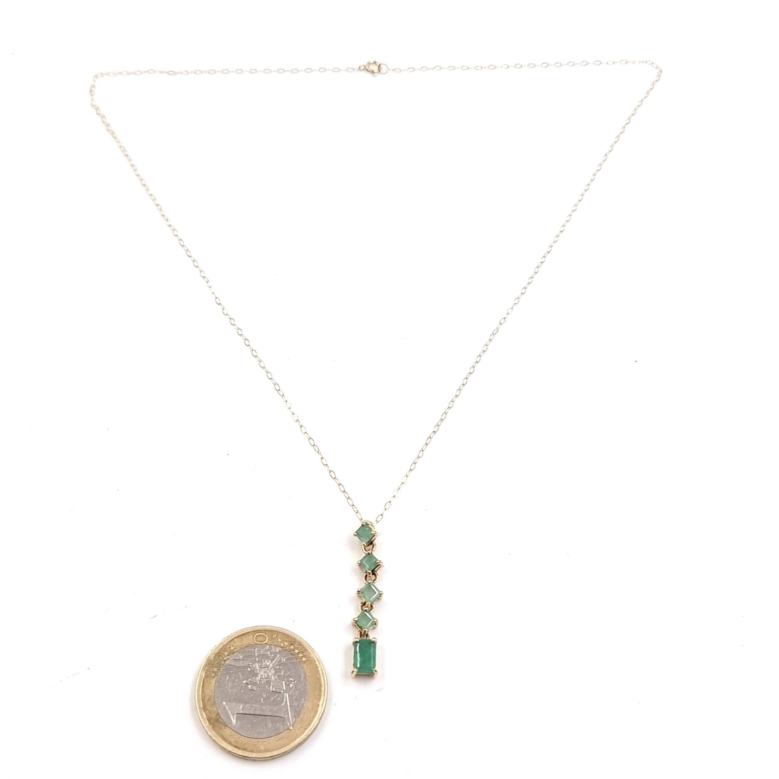 A five Emerald gemstone pendant necklace set in nine carat gold. Weight - 1.75 grams. Please note, the image of the modelled item was created by a new imaging/ staging software called showiton.ai. Upload a simple image of a piece of jewellery and the software stages it on a model for you. Paste the URL (showiton.ai) into your browser and try it for free. It’s a very simple, user-friendly platform.