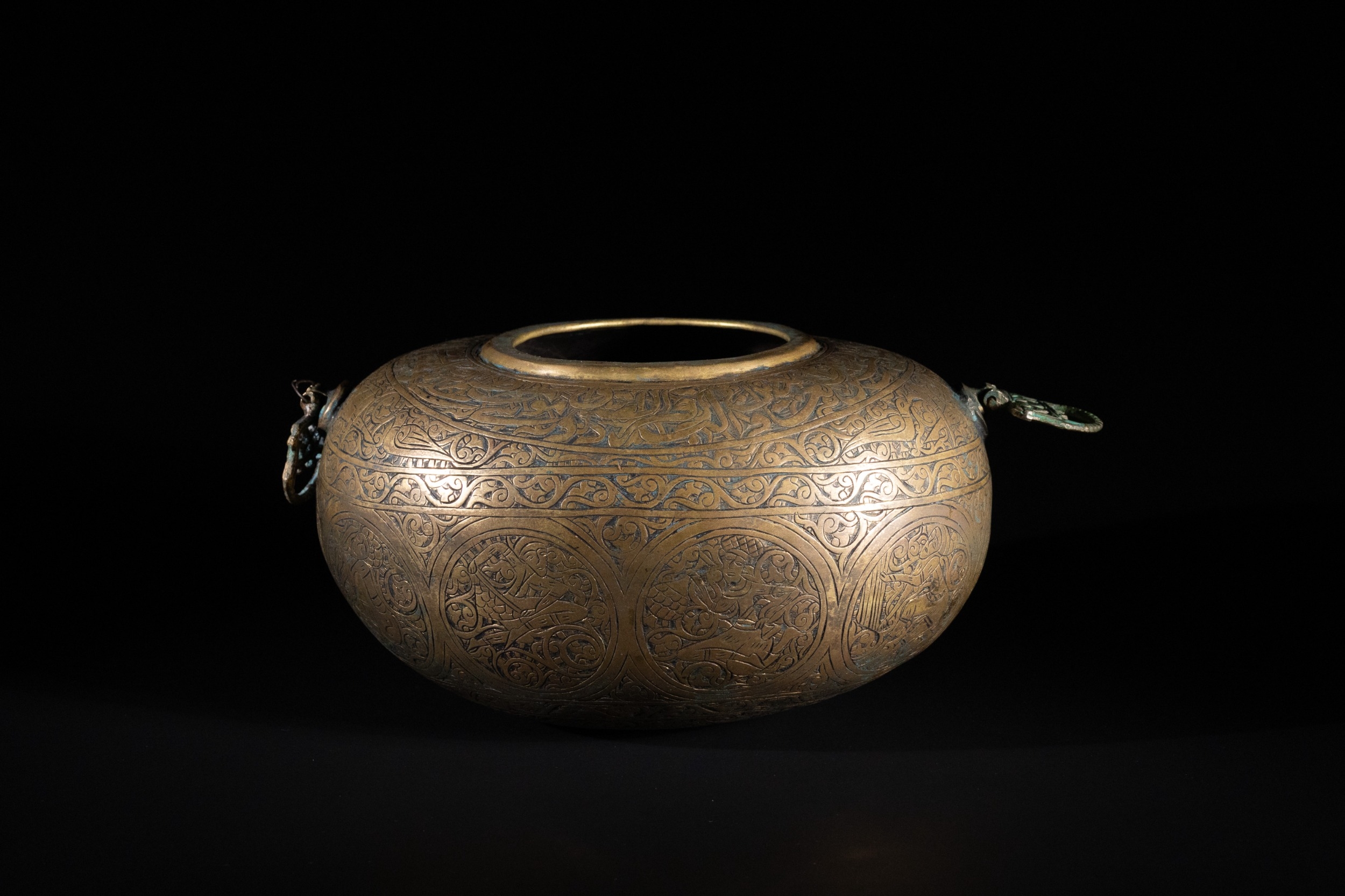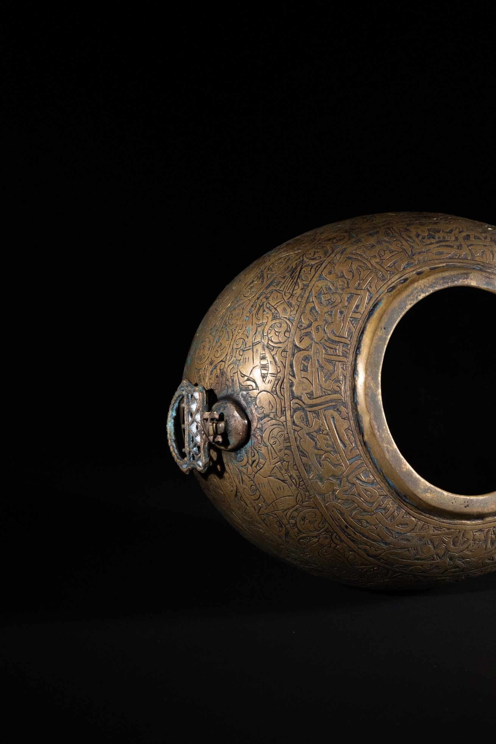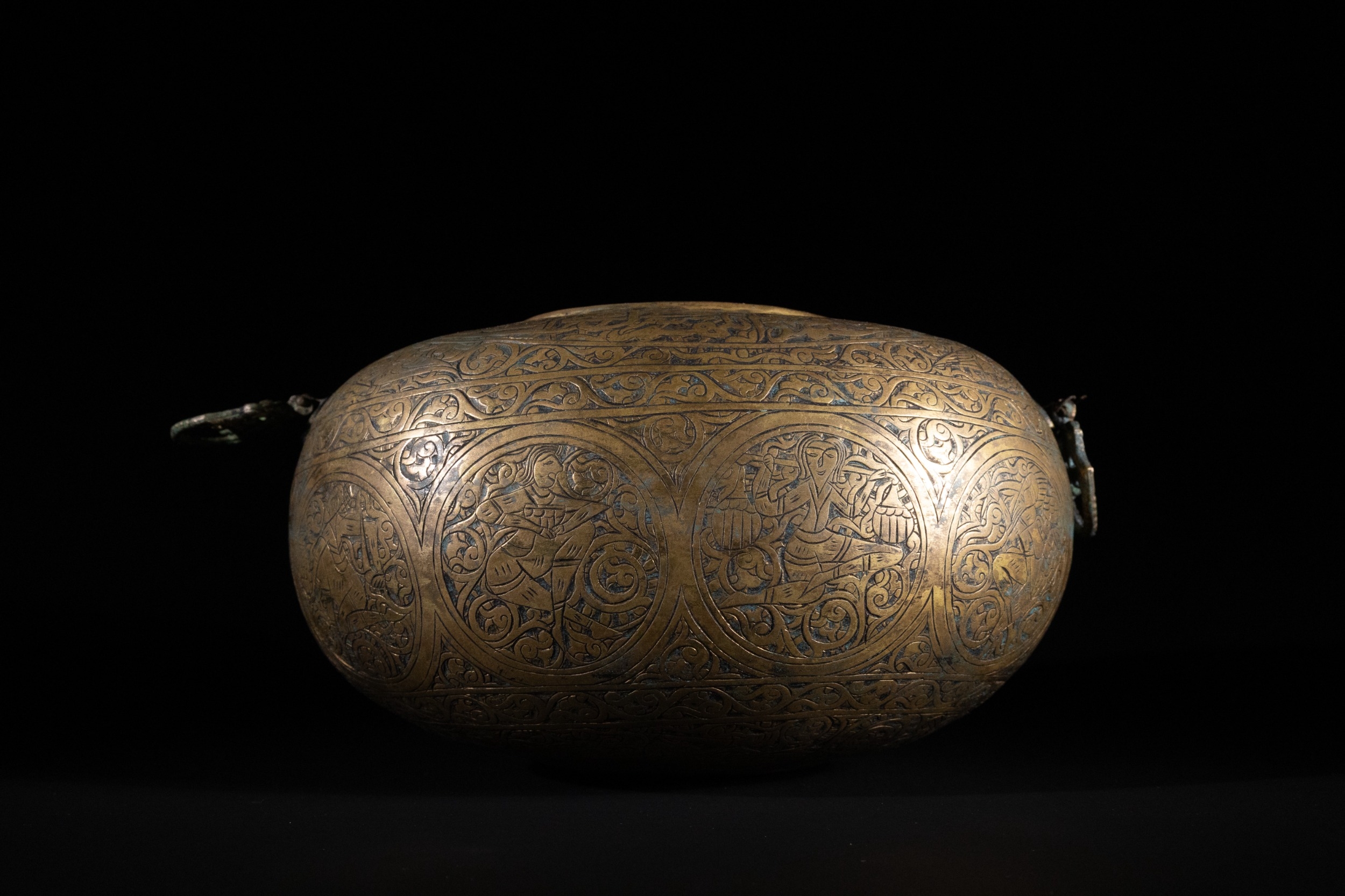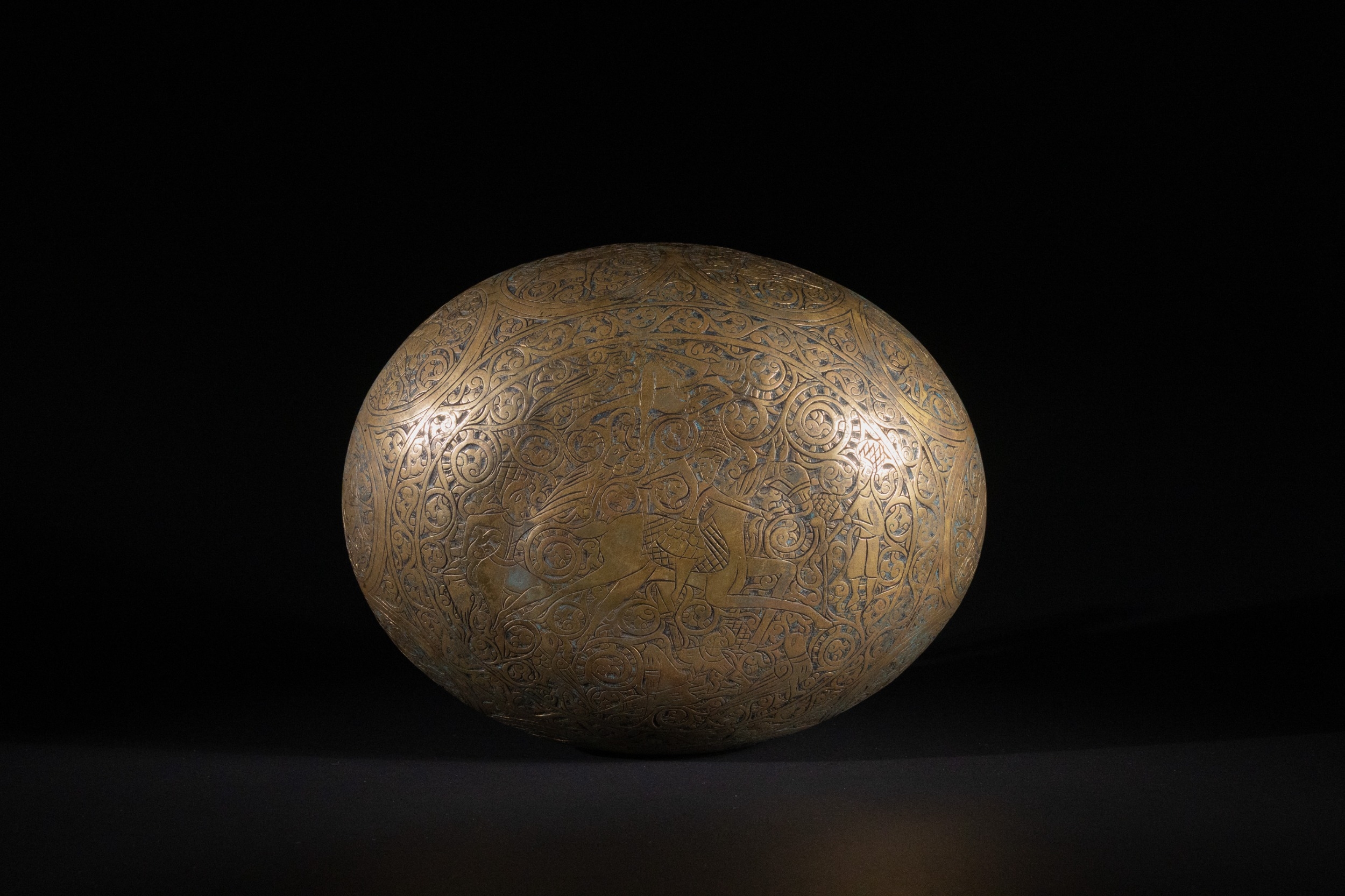 A Qajar Engraved Brass Kashkul Beggar's Bowl, 19th Century - A spherical brass or bronze vessel, identified as a Kashkul, dating to the 19th Century Qajar period in Persia. The item is extensively decorated in an Islamic style with deeply incised patterns. A band of calligraphic Arabic script, translating to "Perpetual glory and increasing prosperity" (العز الدائم والاقبال الزائد), encircles the neck. Below this, the body features intricate arabesque motifs and a series of large circular medallions containing stylized zoomorphic figures like birds or mythical creatures, set amidst dense foliate scrollwork. The vessel is fitted with two ornate loop handles.