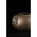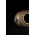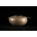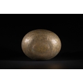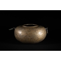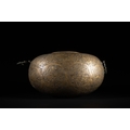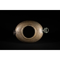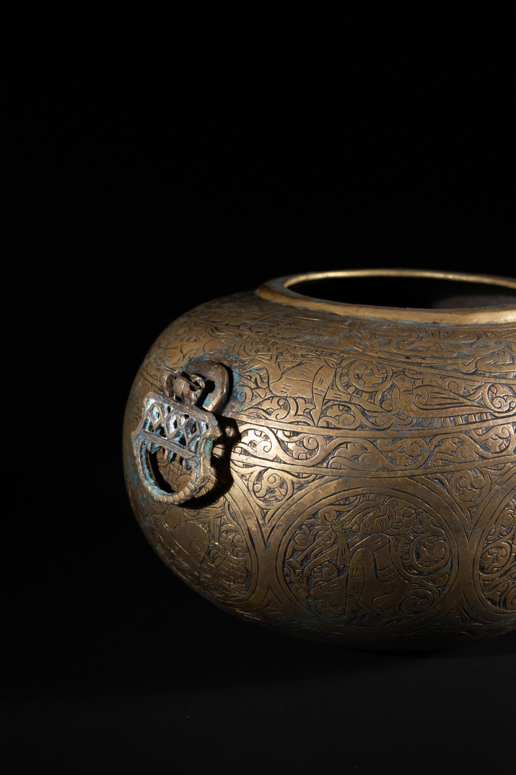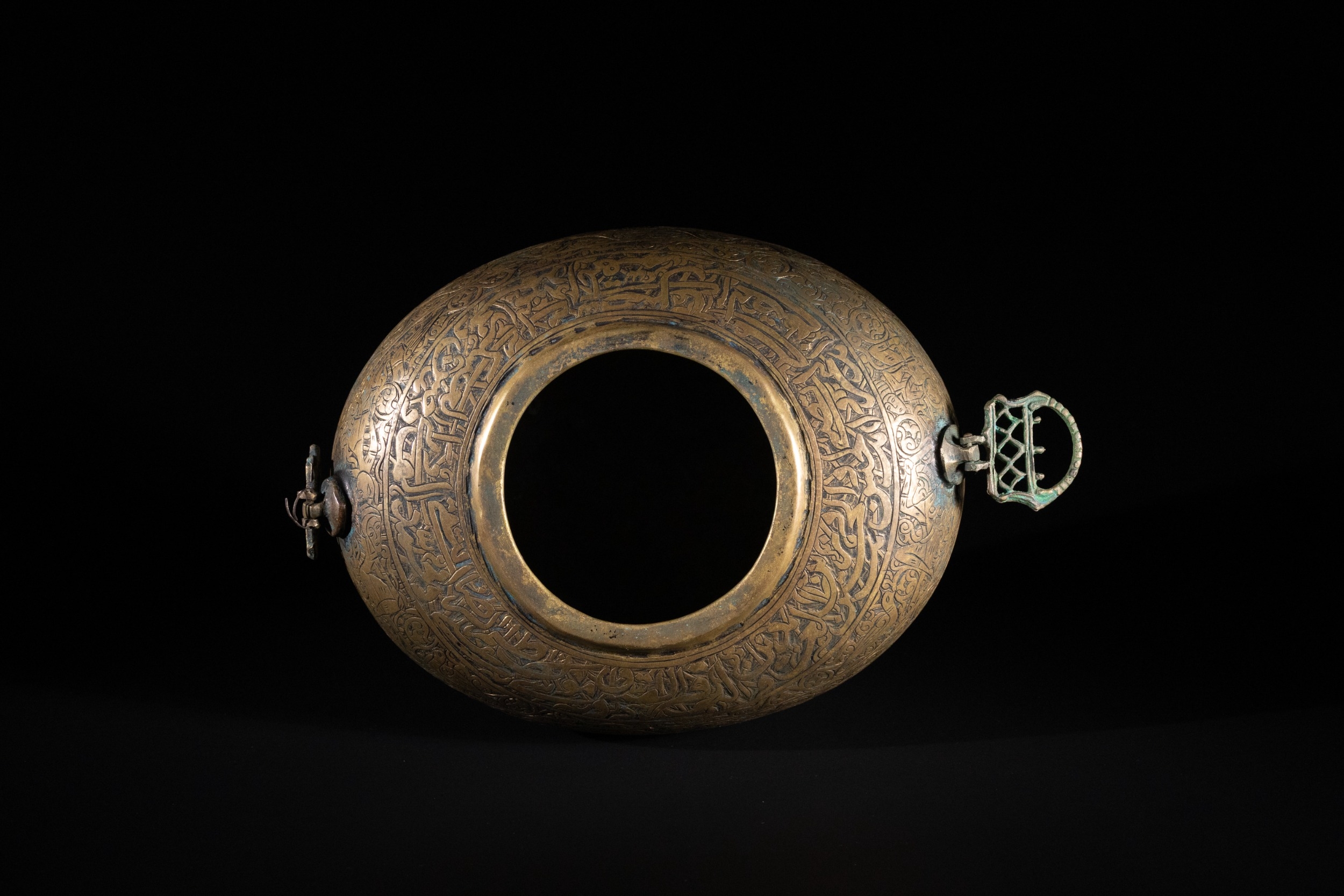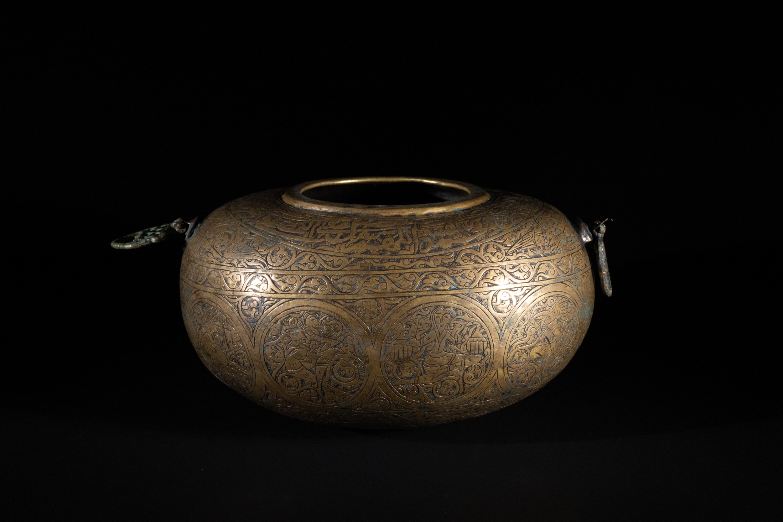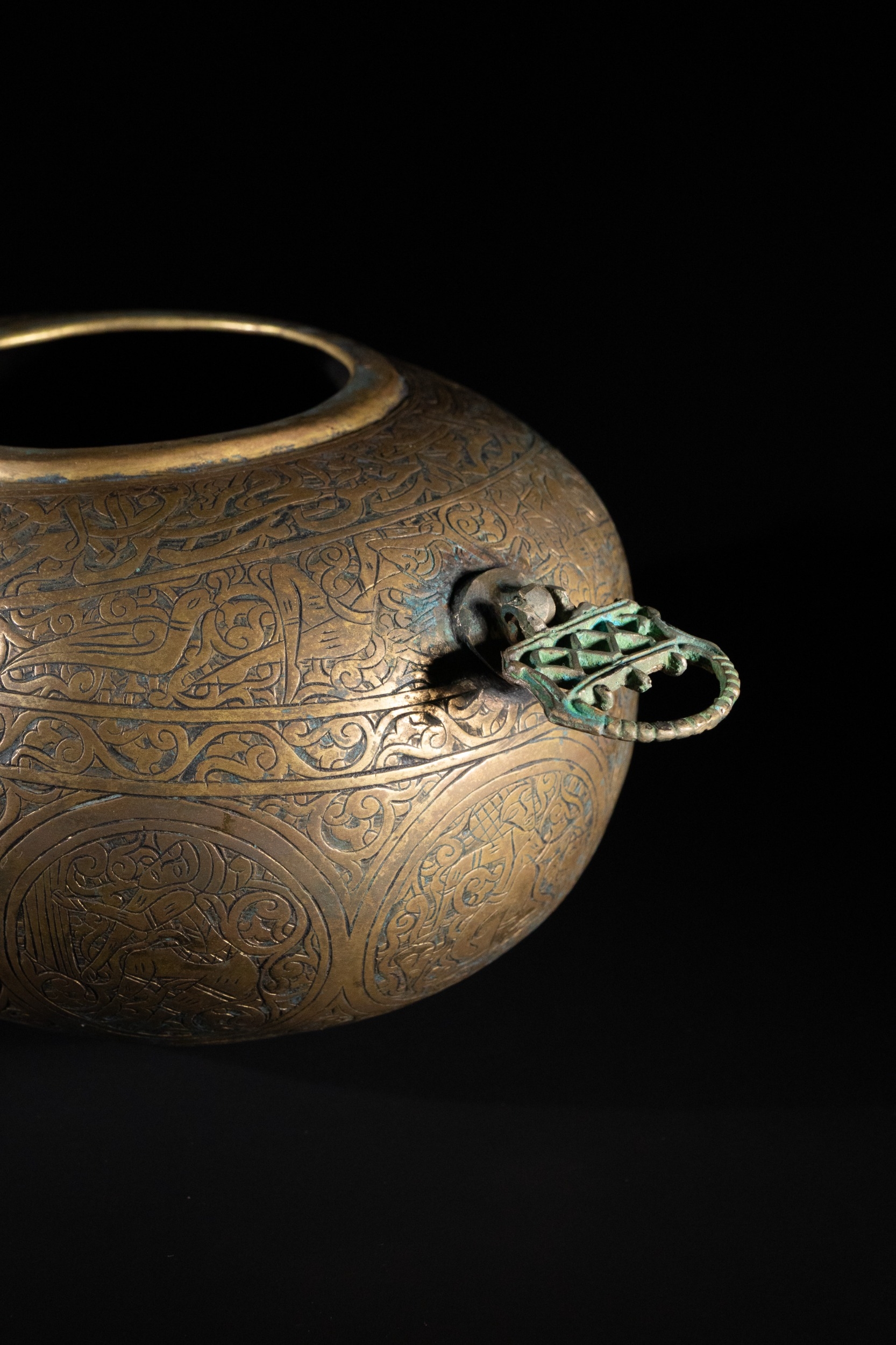 A Qajar Engraved Brass Kashkul Beggar's Bowl, 19th Century - A spherical brass or bronze vessel, identified as a Kashkul, dating to the 19th Century Qajar period in Persia. The item is extensively decorated in an Islamic style with deeply incised patterns. A band of calligraphic Arabic script, translating to "Perpetual glory and increasing prosperity" (العز الدائم والاقبال الزائد), encircles the neck. Below this, the body features intricate arabesque motifs and a series of large circular medallions containing stylized zoomorphic figures like birds or mythical creatures, set amidst dense foliate scrollwork. The vessel is fitted with two ornate loop handles.
