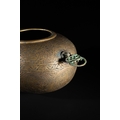 The item exhibits an aged, dark patina with prominent green verdigris on its two ornate loop handles. Condition appears consistent with a genuine antique, showing expected surface wear and oxidation commensurate with age and use. No significant damage or repairs are noted.