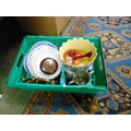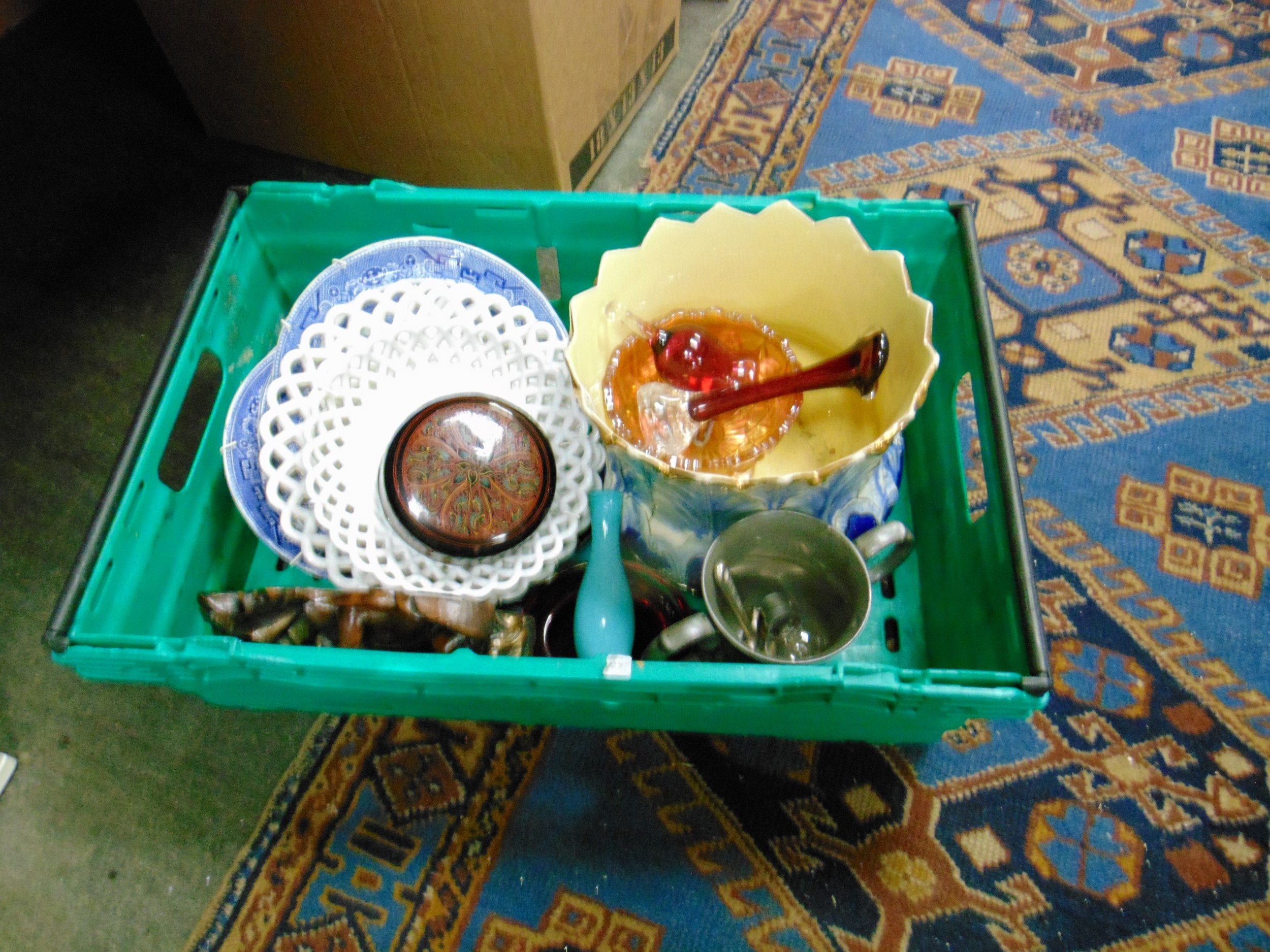 Pottery jardiniere, coloured glass, etc.