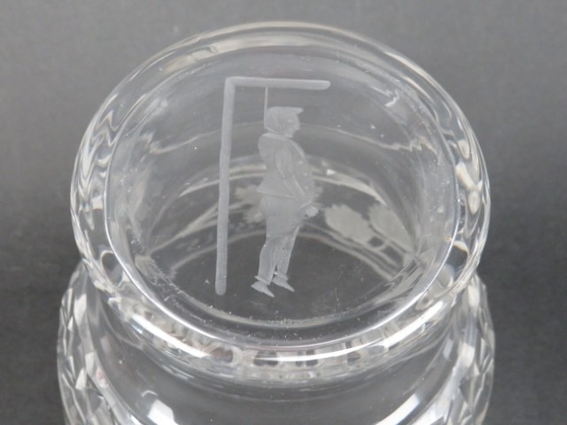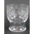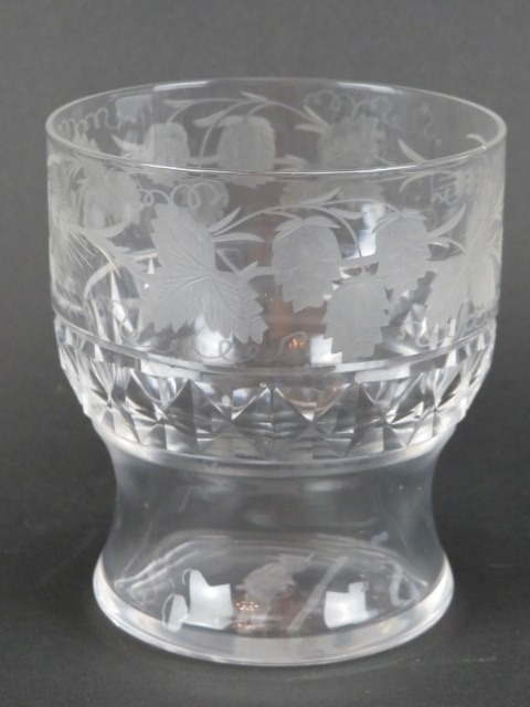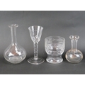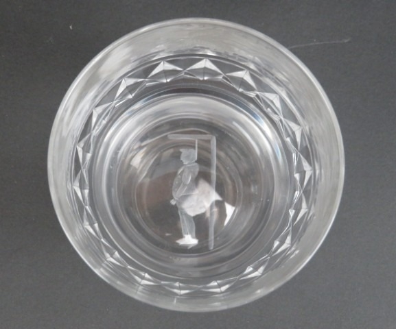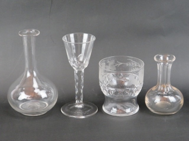 An engraved glass ‘Last Drop’ hangman tumbler, a faceted wine glass and two glass measures, 19th/early 20th century. (4 items) 17.3 cm tallest height.