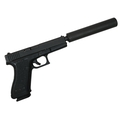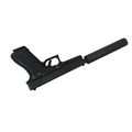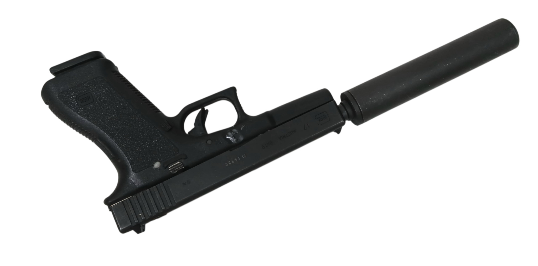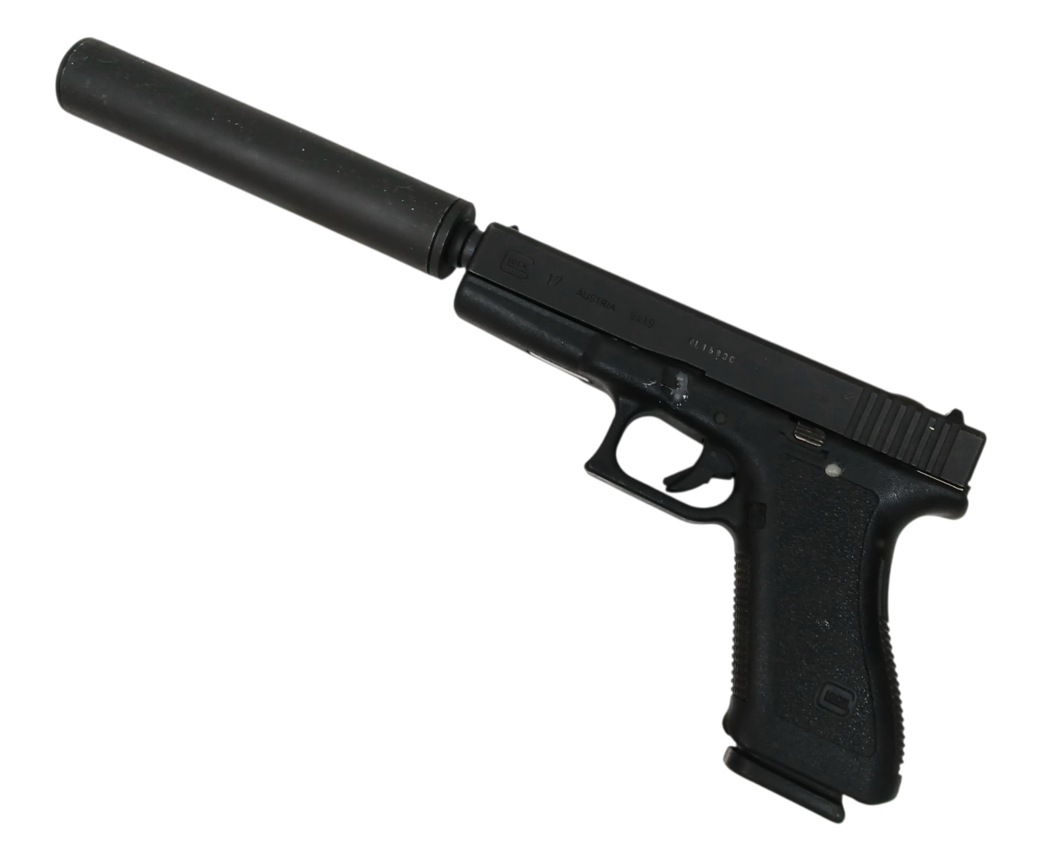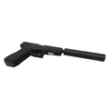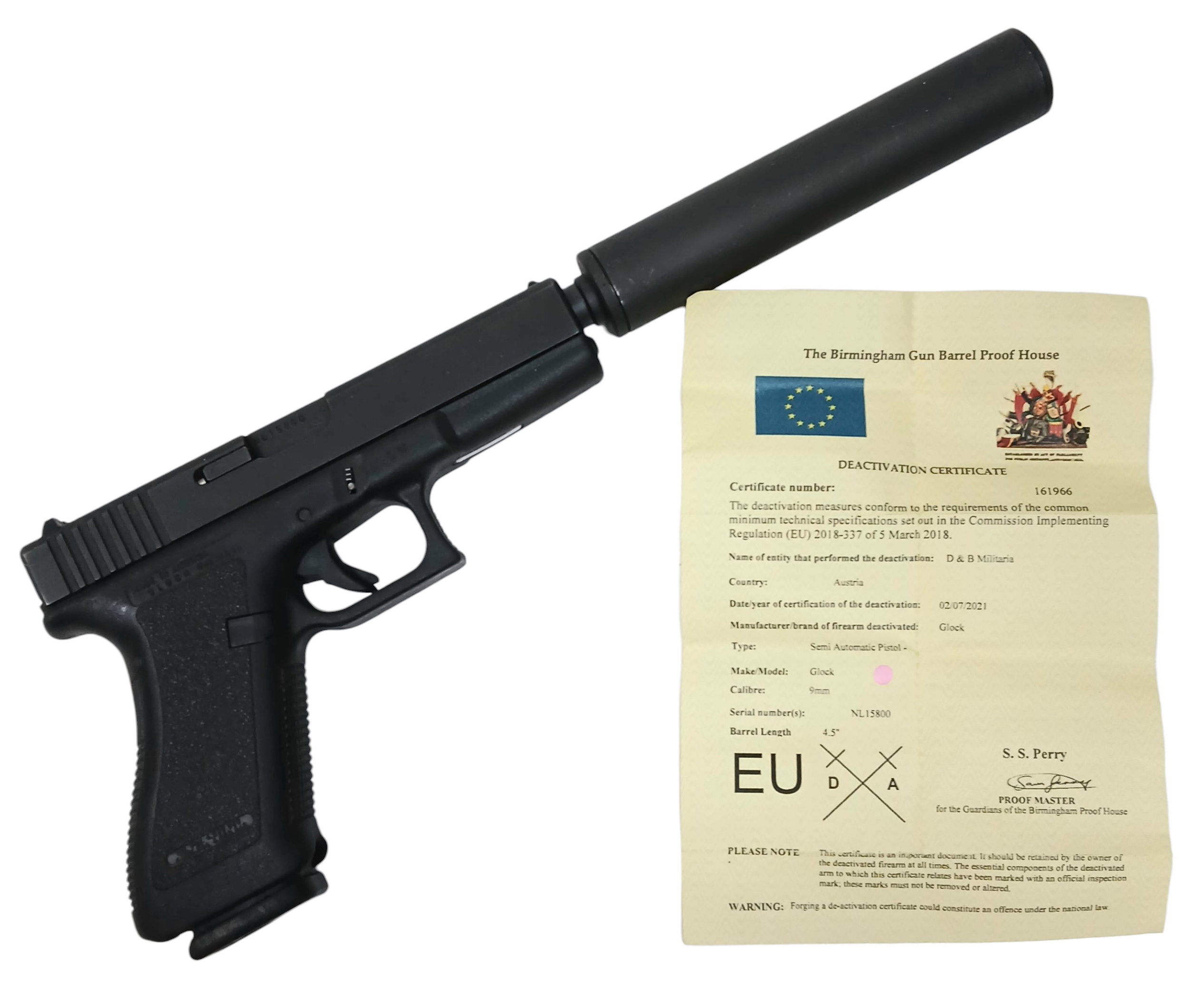 A Deactivated Austrian Glock 17 Semi Automatic Pistol with Silencer. 9mm calibre with a 4.5 inch barrel. Silencer - 6 inches. Retractable magazine and silencer. Comes with an EU deactivation certificate. EU/UK sales only - Not Holland.
