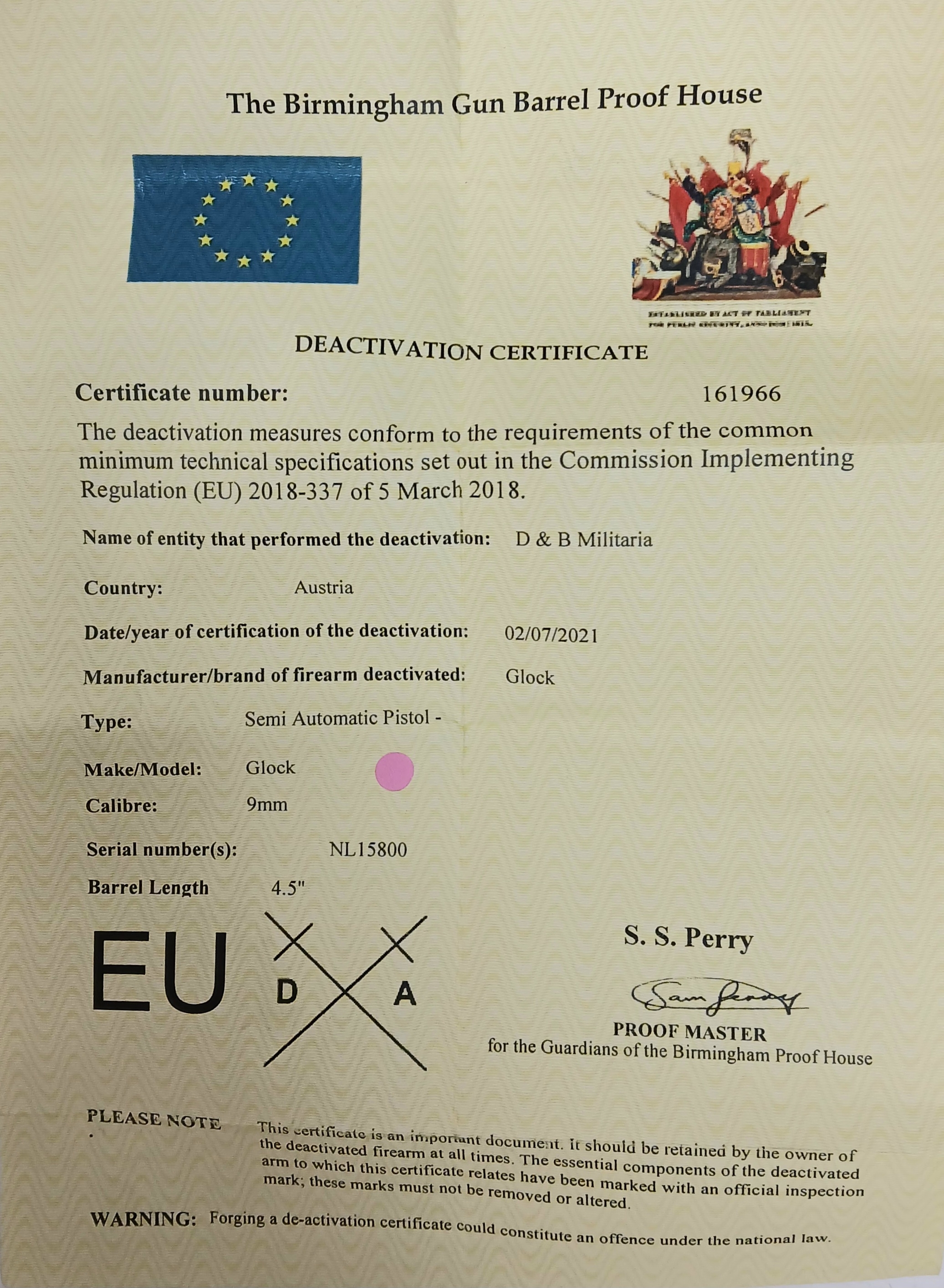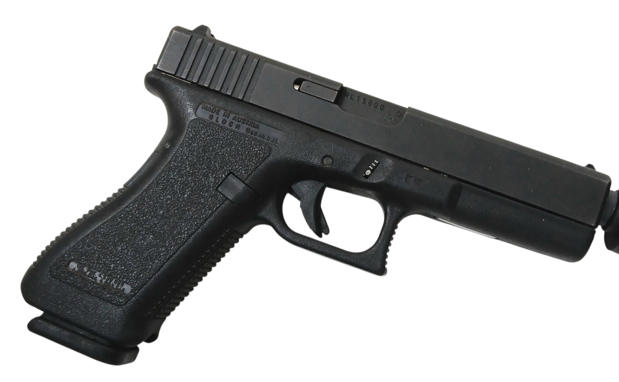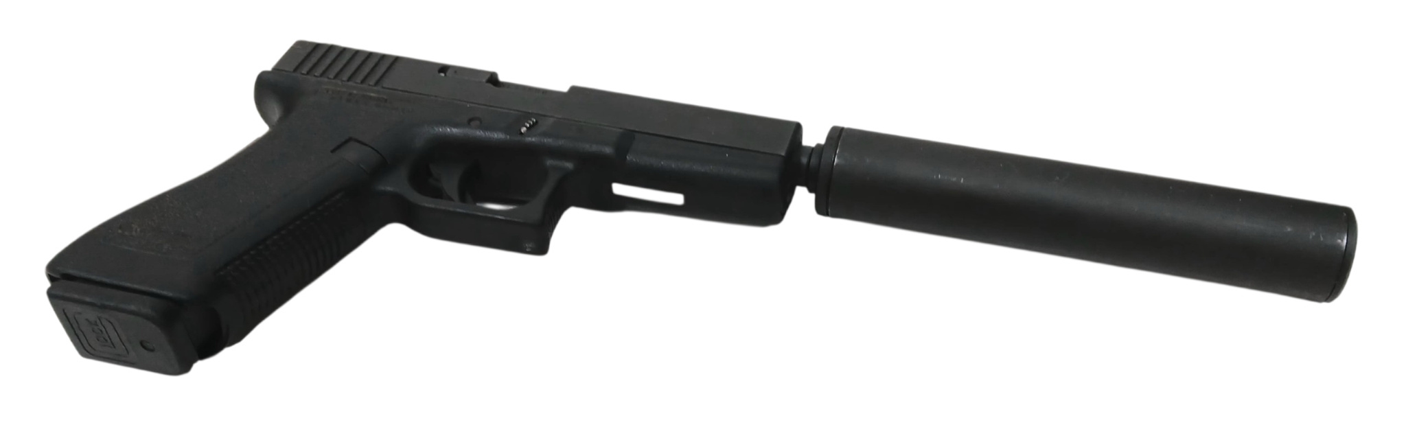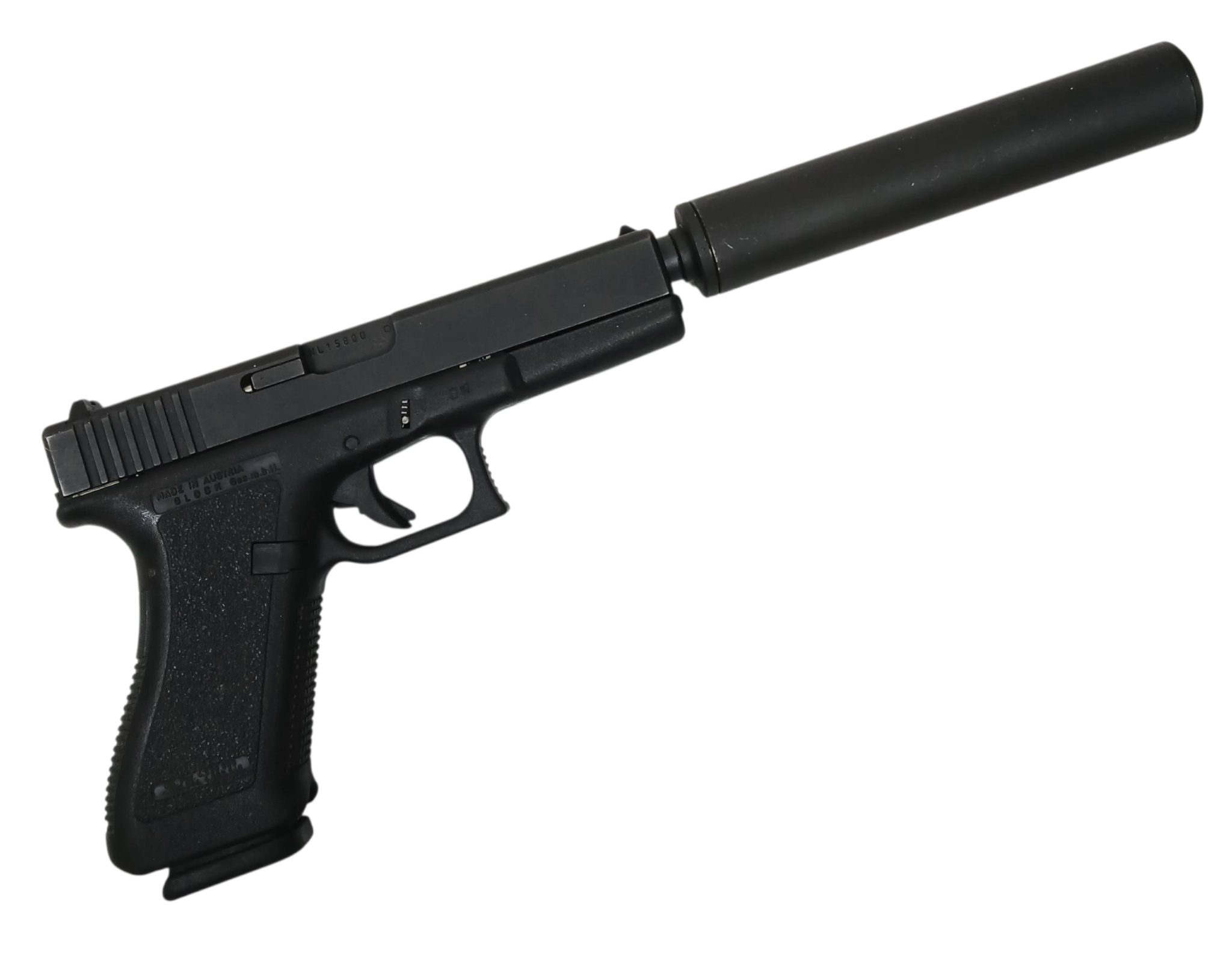A Deactivated Austrian Glock 17 Semi Automatic Pistol with Silencer. 9mm calibre with a 4.5 inch barrel. Silencer - 6 inches. Retractable magazine and silencer. Comes with an EU deactivation certificate. EU/UK sales only - Not Holland.