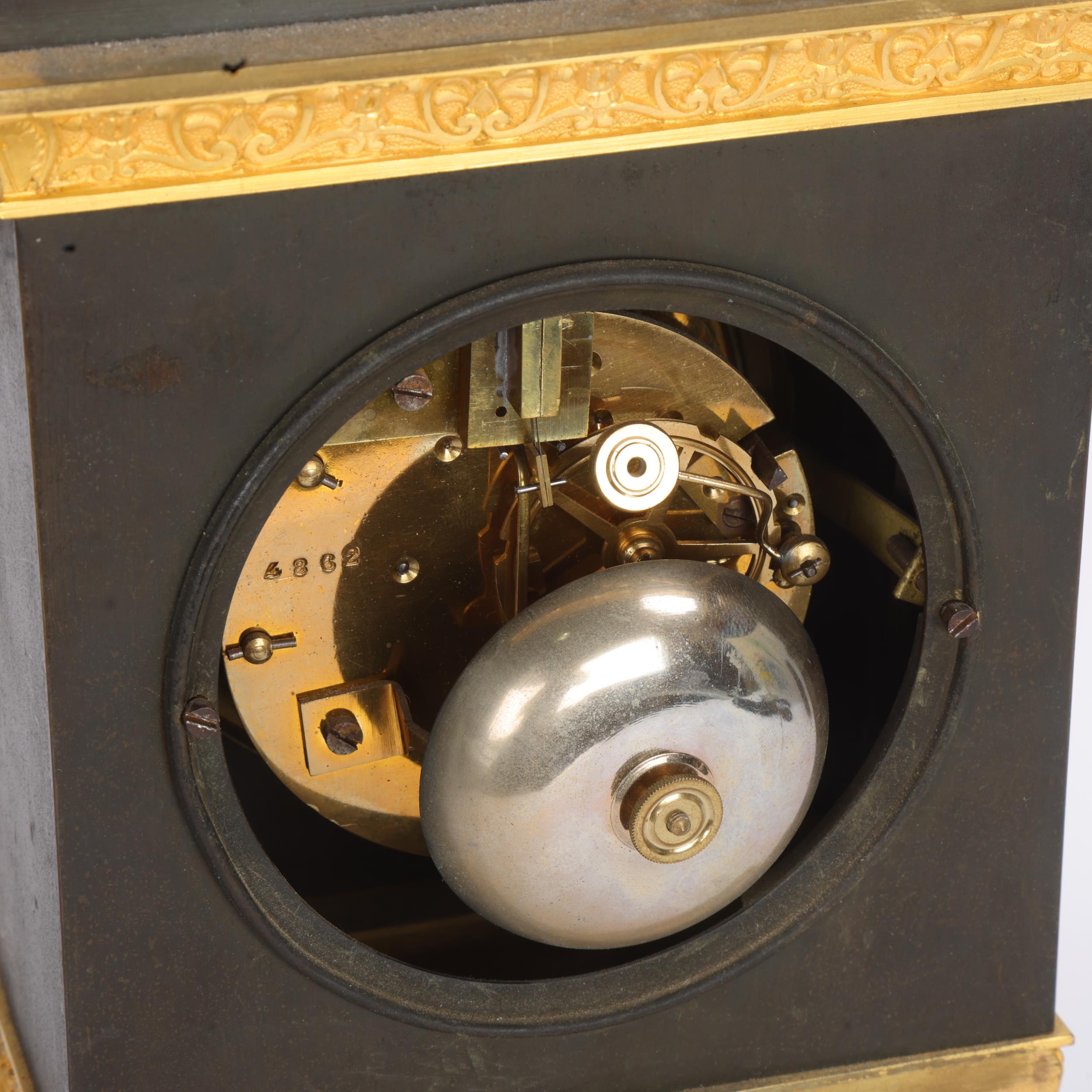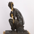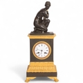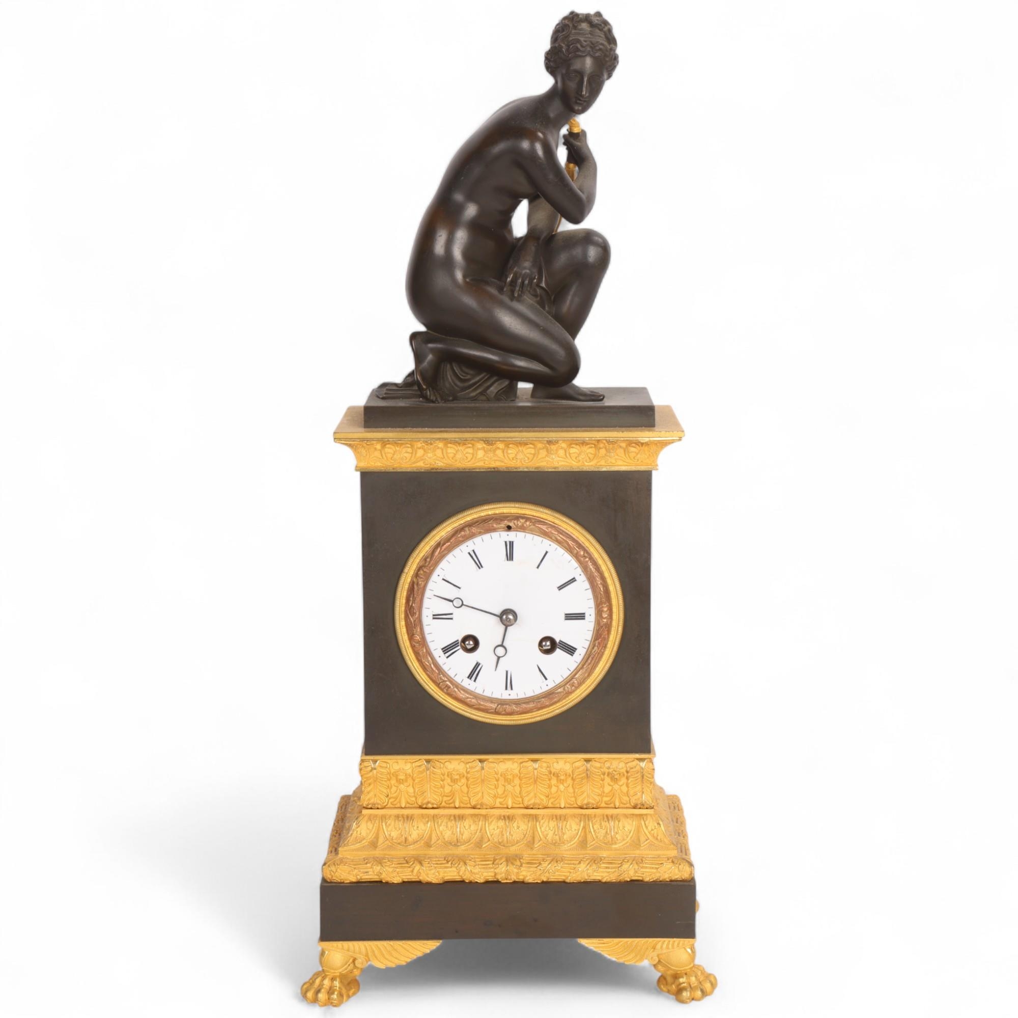 19th century French Empire bronze and ormolu mantel clock, surmounted by crouching Venus, 8-day striking movement with enamel dial, height 46cm