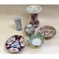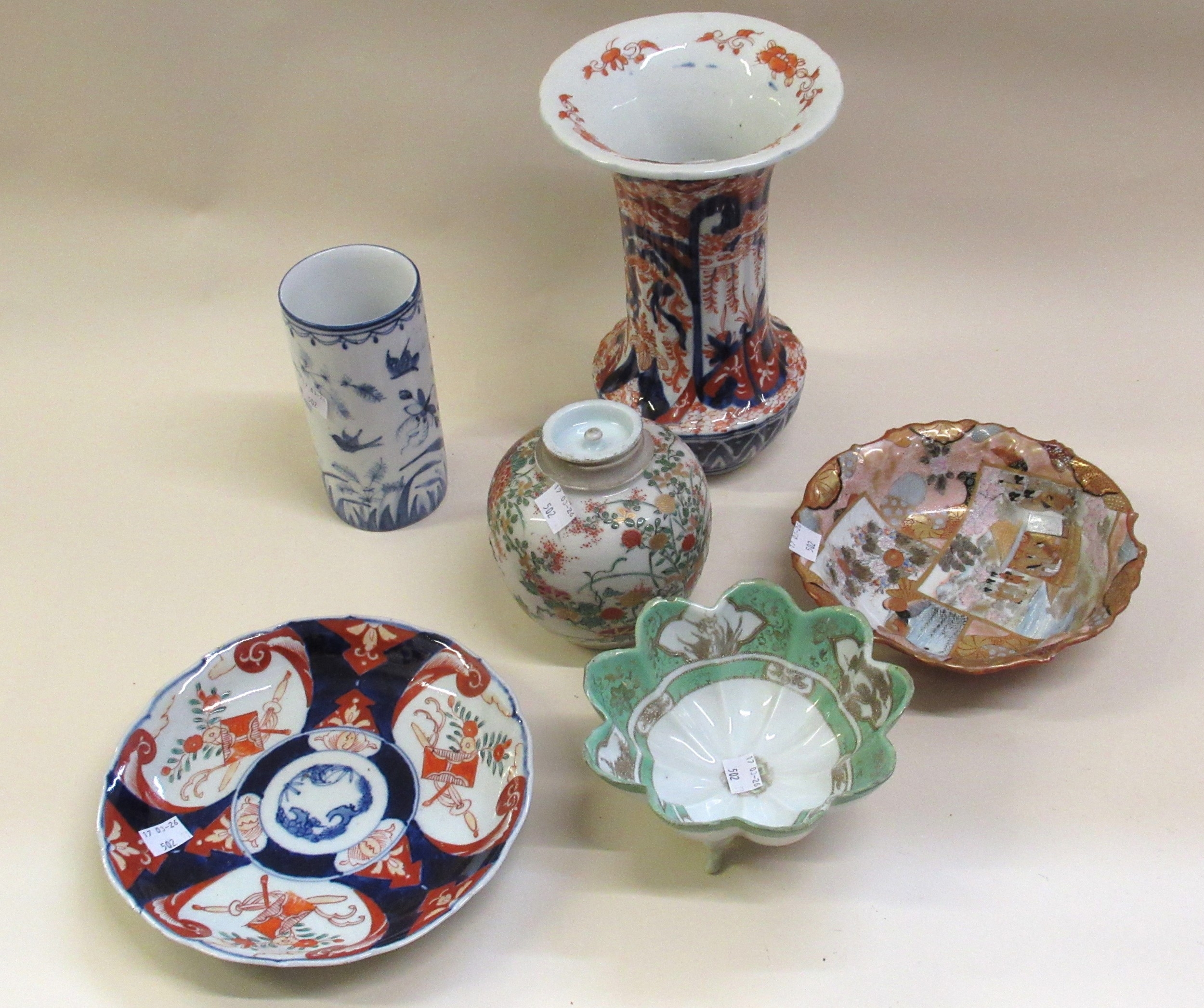Japanese Imari vase, similar plate, ginger jar, cylindrical vase and two small bowls