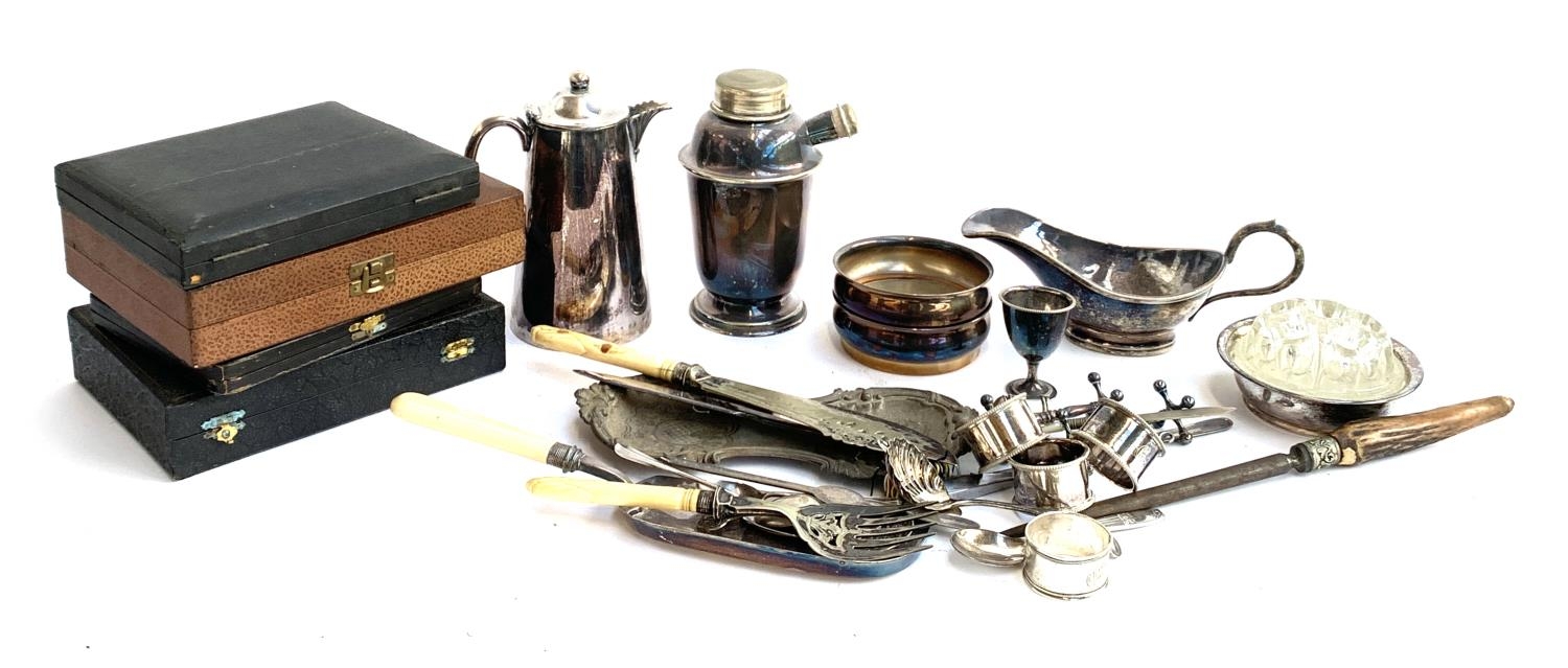 A mixed lot of plated items to include cocktail shaker; a pair of wine coasters; coffee pot; gravy boat; lobster picks, and various cased sets etc