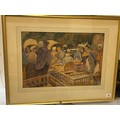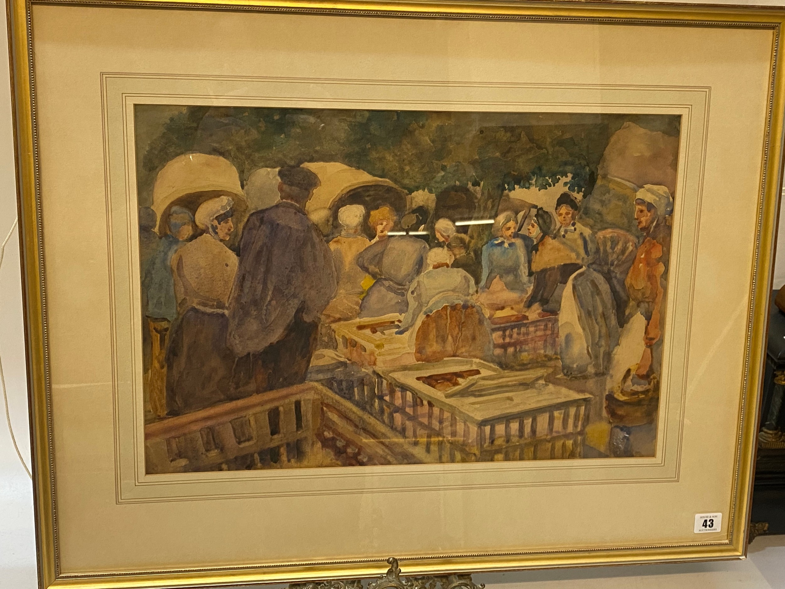 A watercolour - Market scene with wooden crates and figures, mounted, framed and glazed - 14in. x 21in.