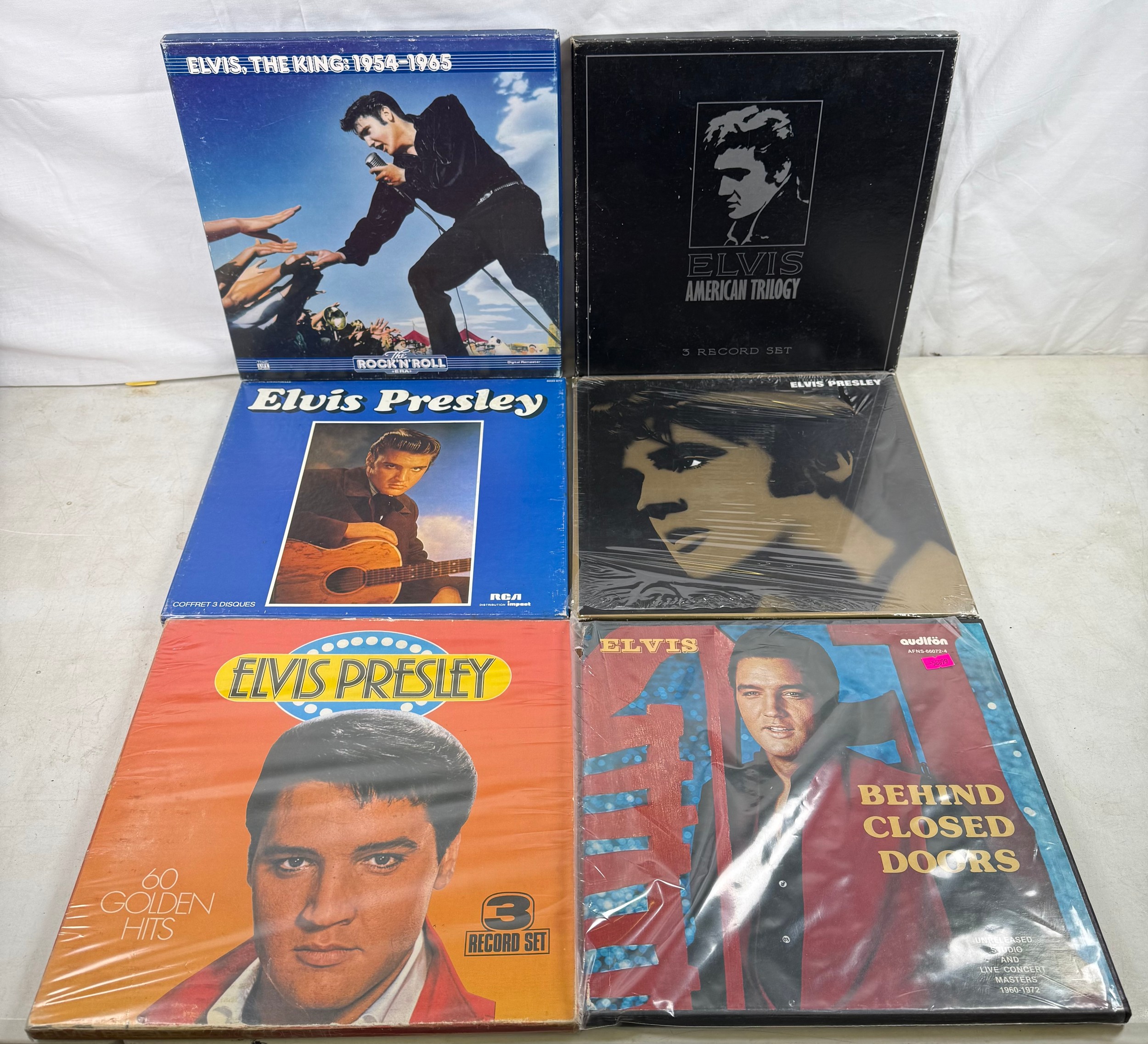 Selection of Elvis Presley record sets to include Behind Closed Doors AFNS-66072-4, 60 Golden Hits Stereo LP 9013/3, Elvis Presley PL 42298, 6993 070, American Trilogy DR1124 and Elvis, The King: 1954-1965