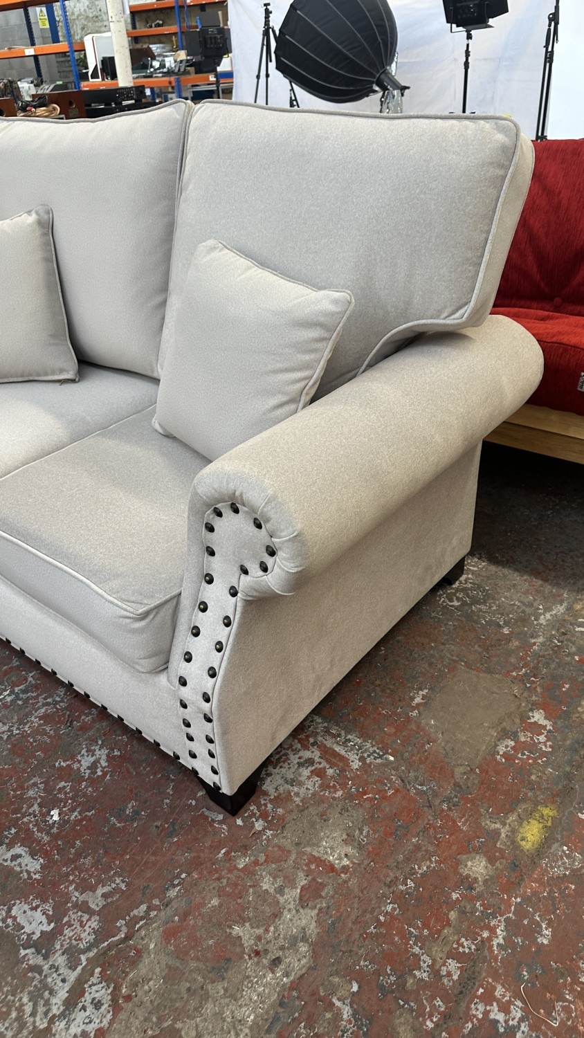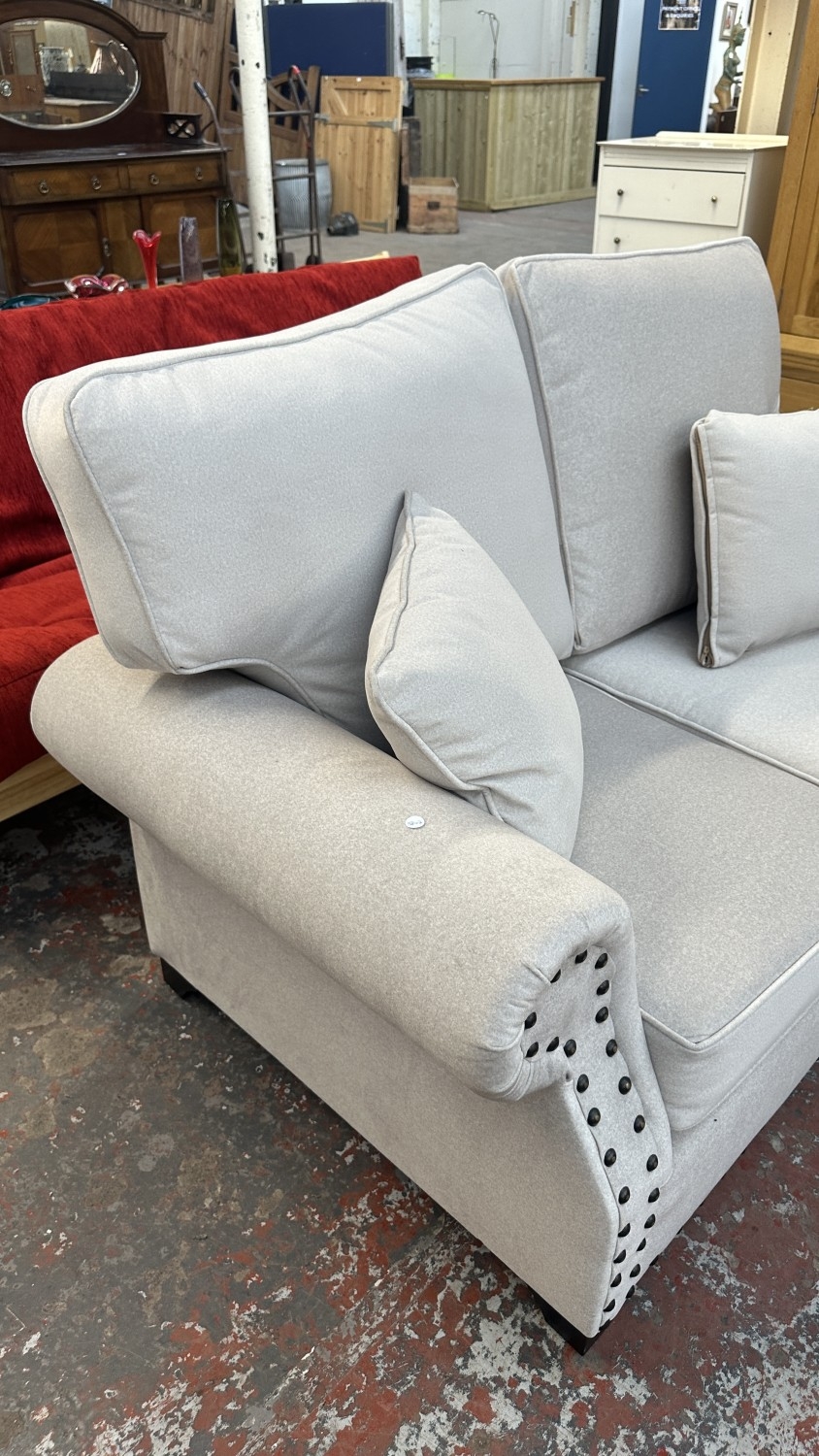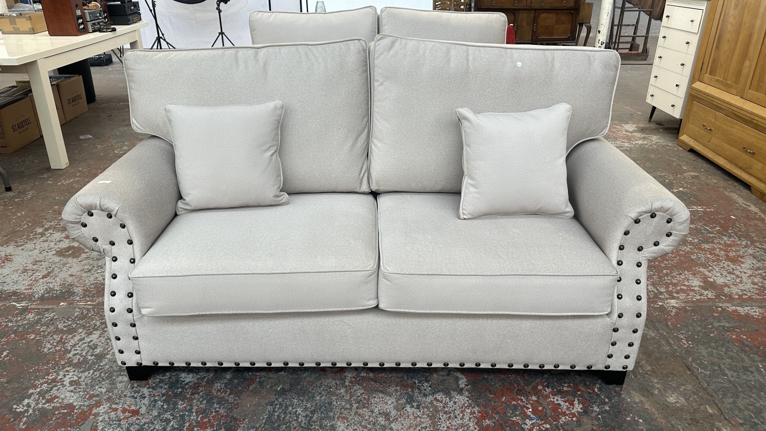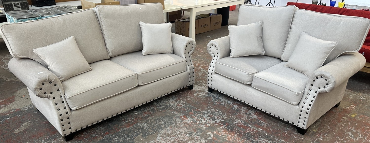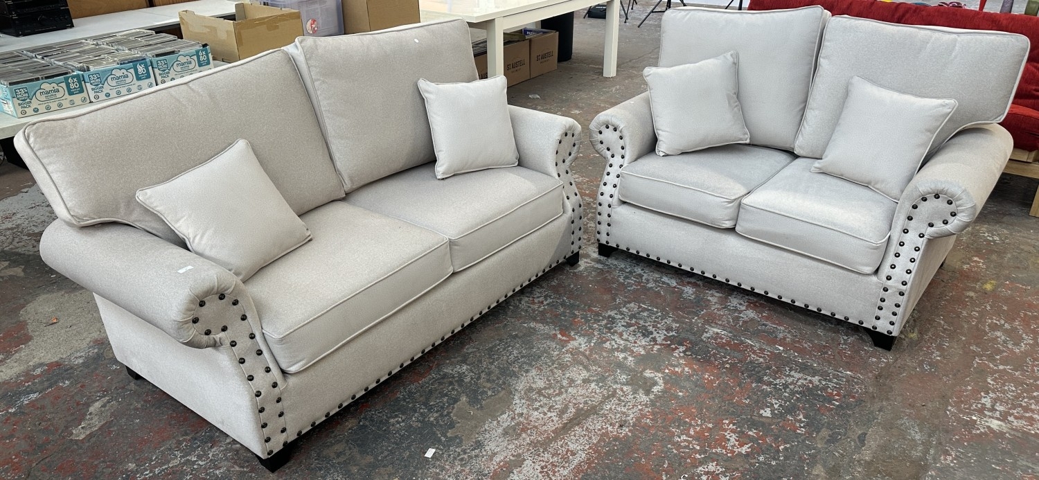 A modern grey fabric upholstered and metal studded two piece lounge suite comprising two seater sofa - approx. 78cm high excluding cushions x 152cm wide x 89cm deep and three seater sofa - approx. 78cm high excluding cushions x 192cm wide x 89cm deep