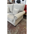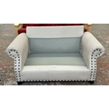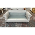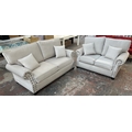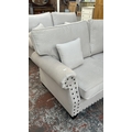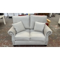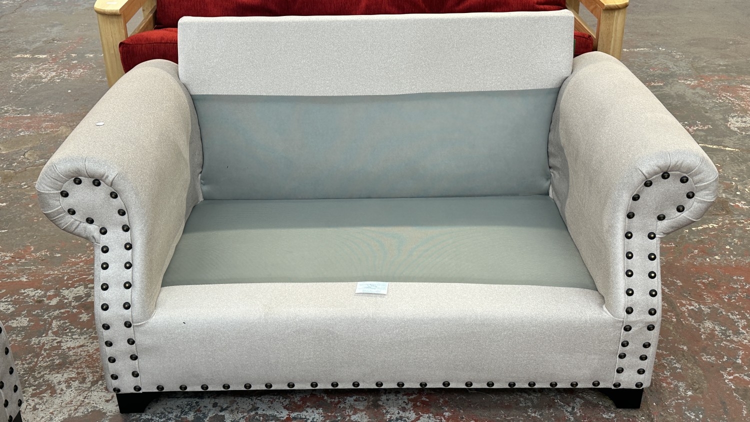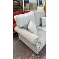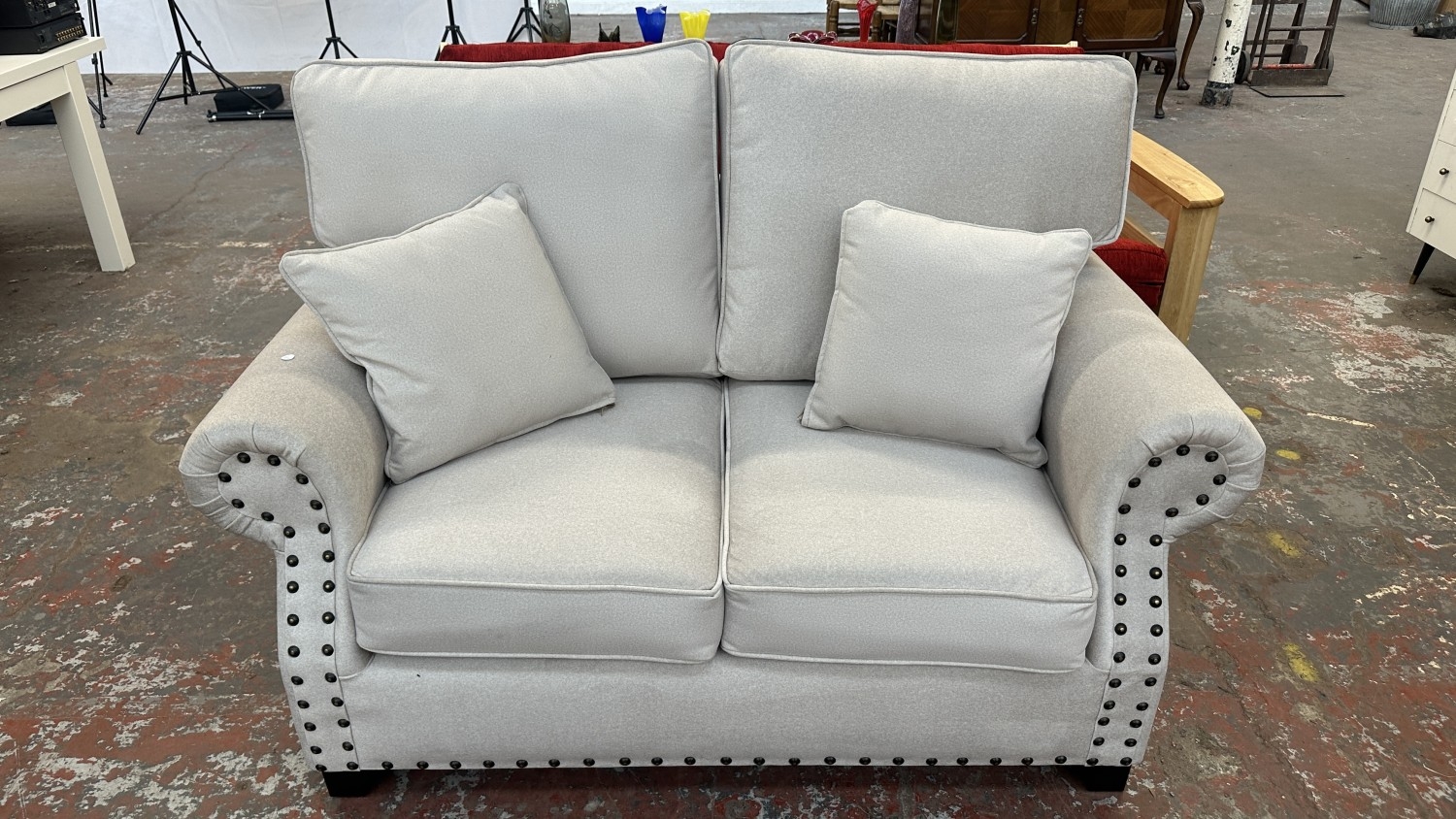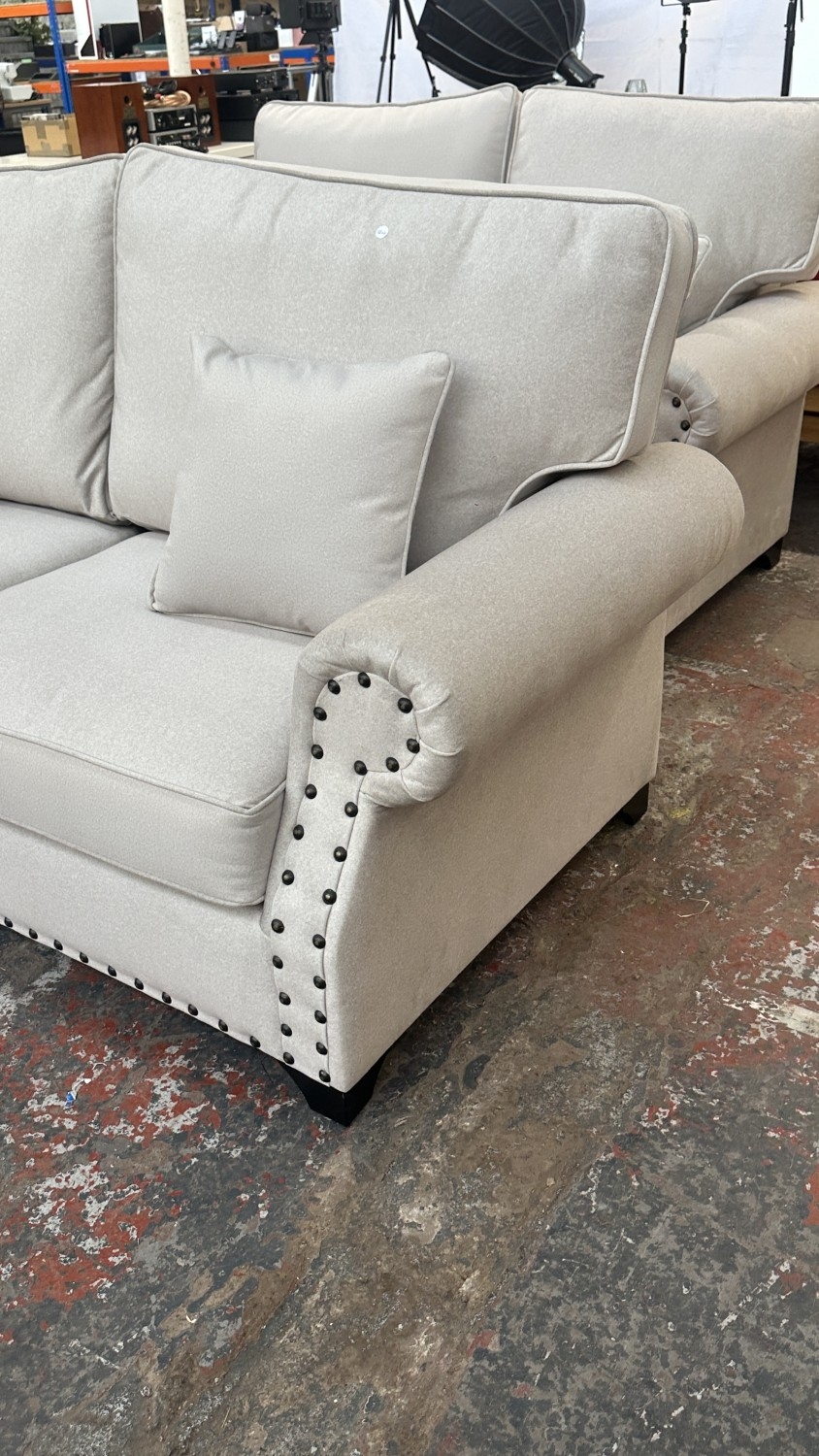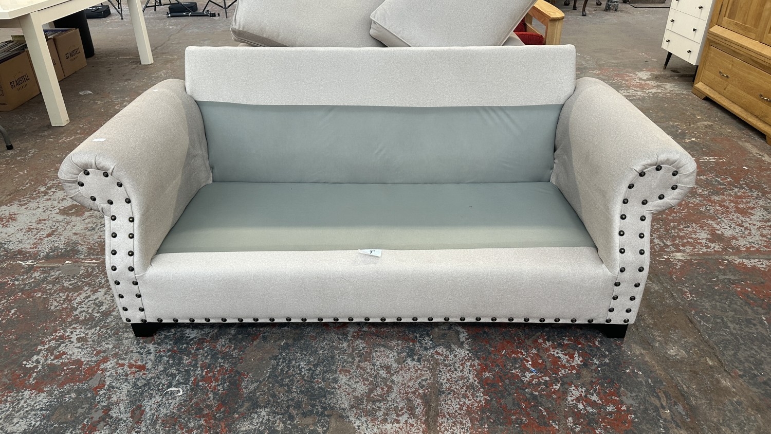 A modern grey fabric upholstered and metal studded two piece lounge suite comprising two seater sofa - approx. 78cm high excluding cushions x 152cm wide x 89cm deep and three seater sofa - approx. 78cm high excluding cushions x 192cm wide x 89cm deep