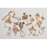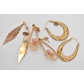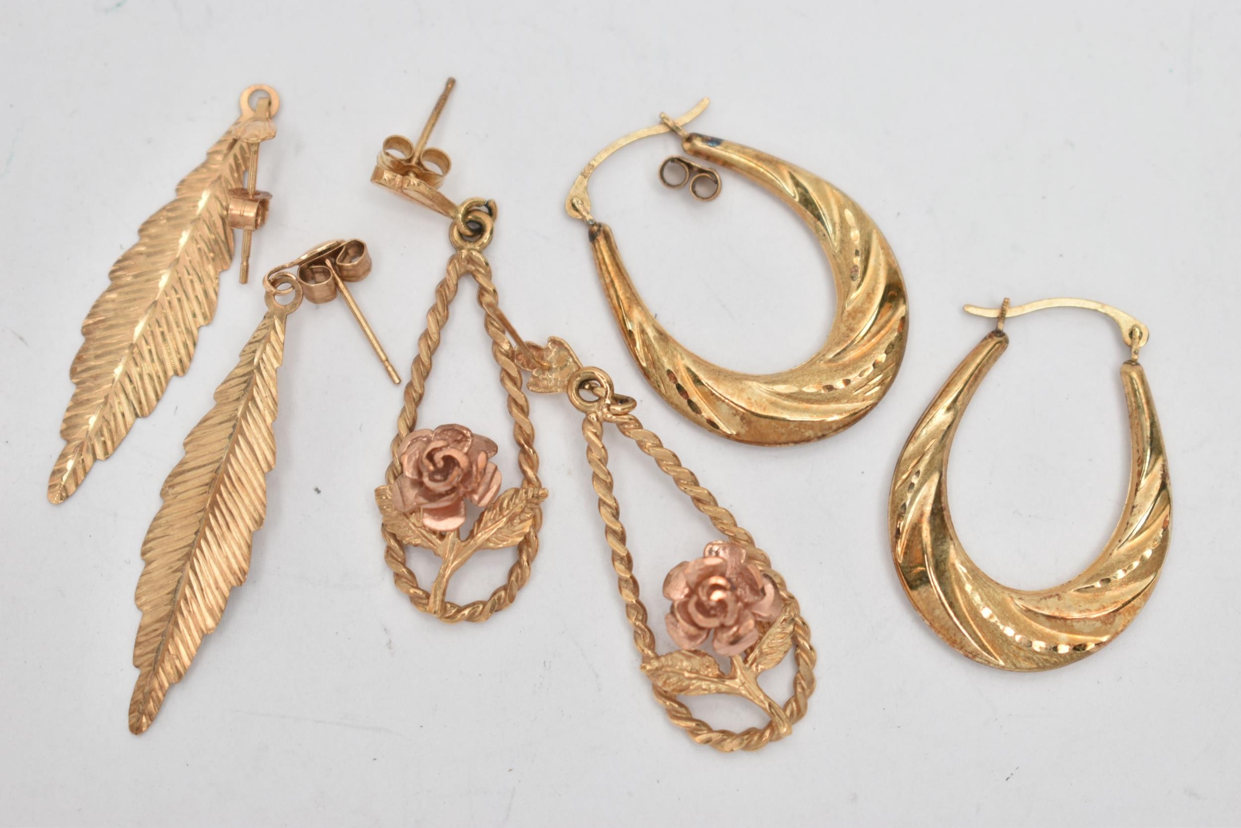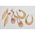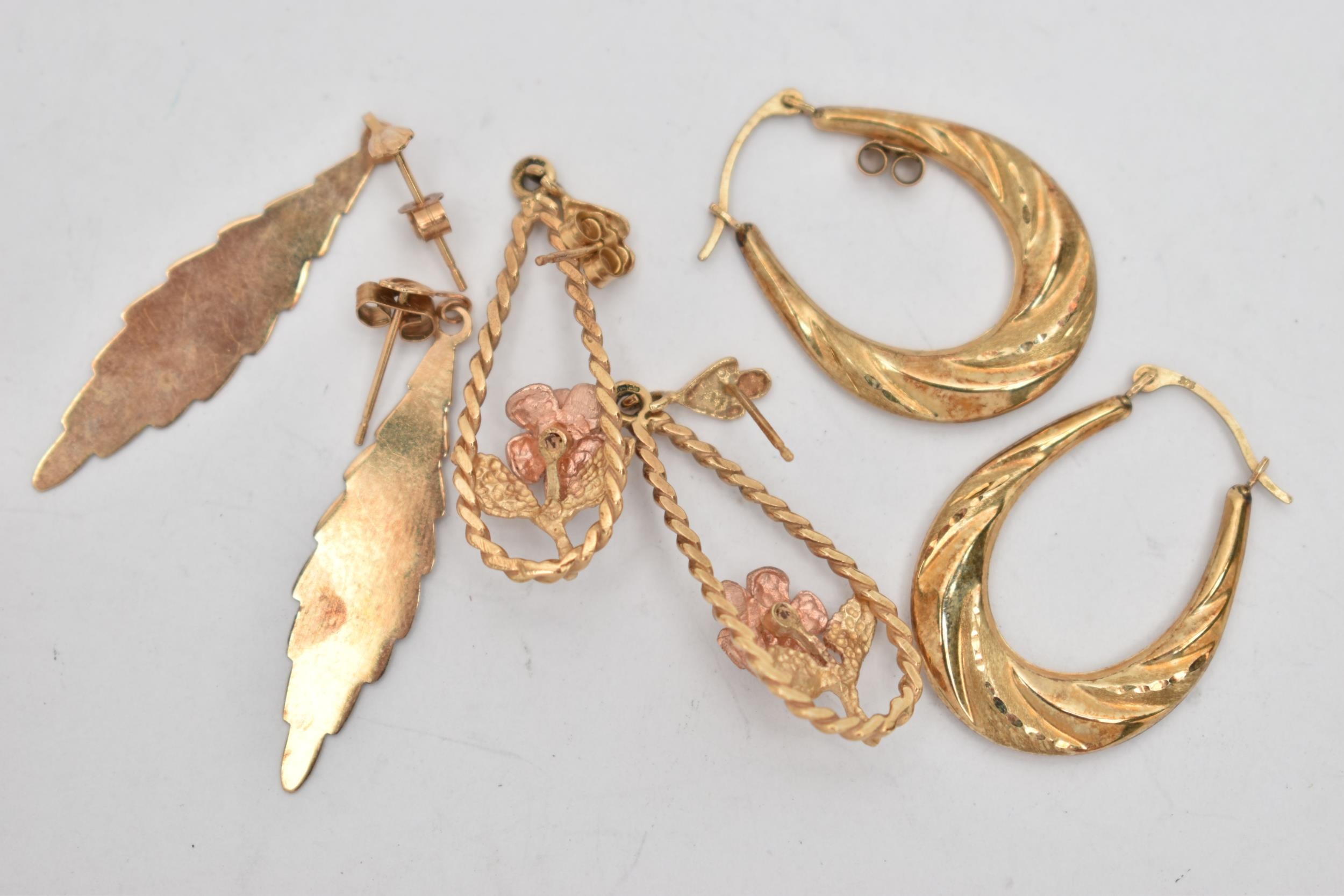 THREE PAIRS OF EARRINGS, to include a pair of 9ct gold drop earrings, designed as a drop shape enclosing a flower, with 9ct hallmark, a pair of leaf drop earrings, earring backs stamped 9ct, a pair of hoop earrings, stamped 375, lengths 27mm to 39mm, approximate total weight 5 grams