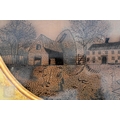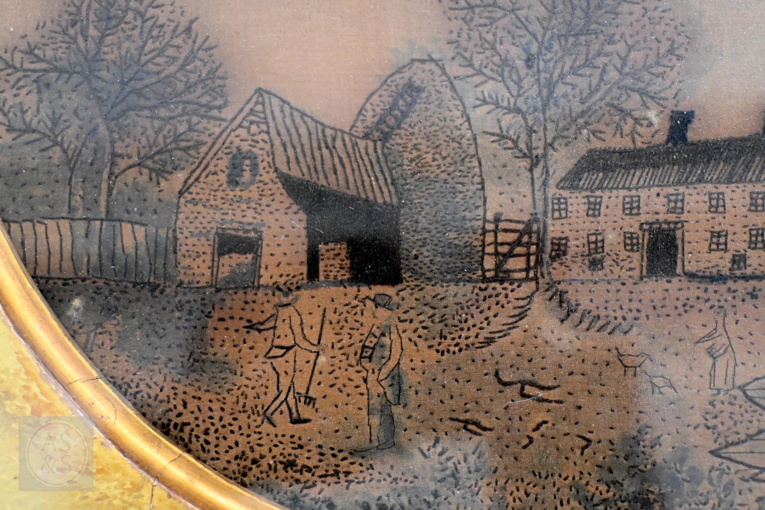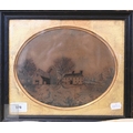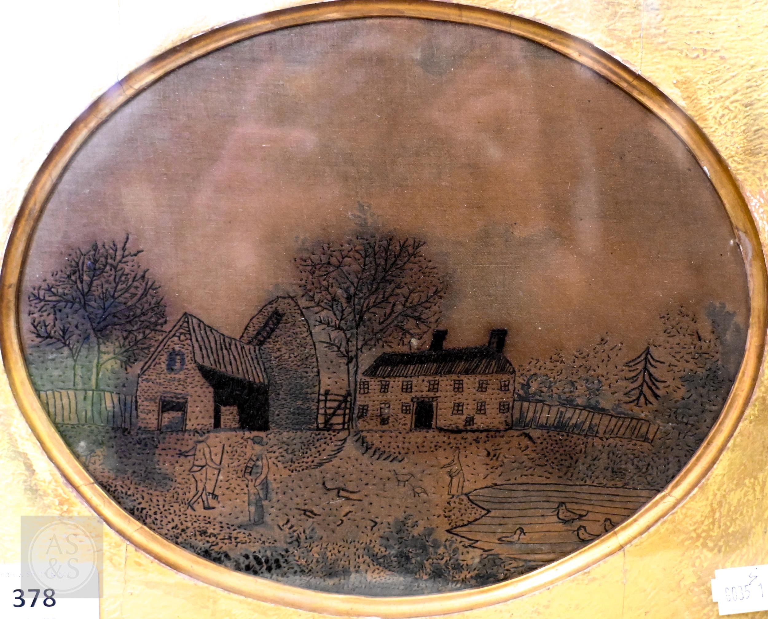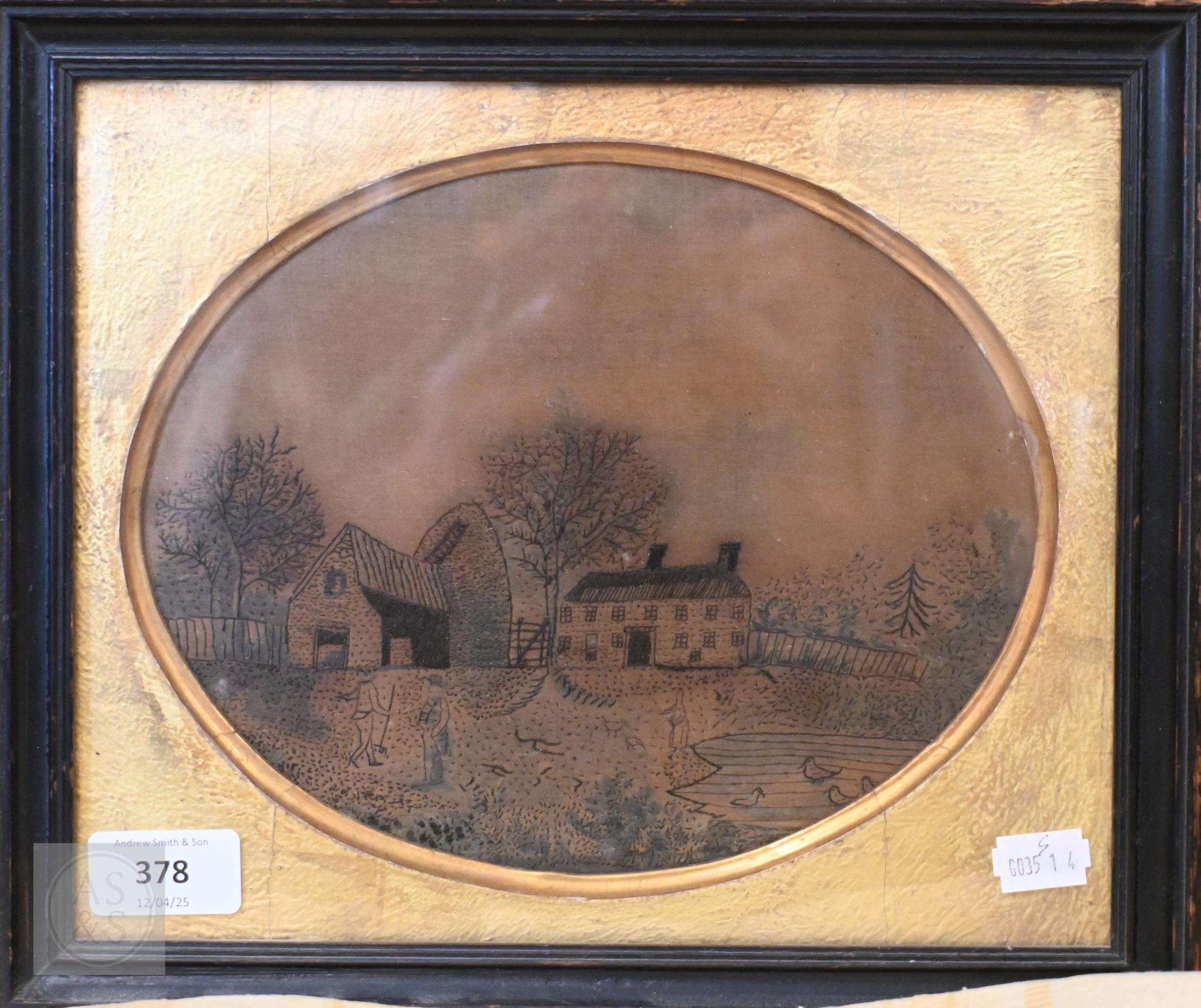An antique 'folk art' embroidery on silk of a farmstead, 17.5 x 22.5 cm, mounted framed and glazed