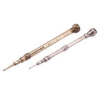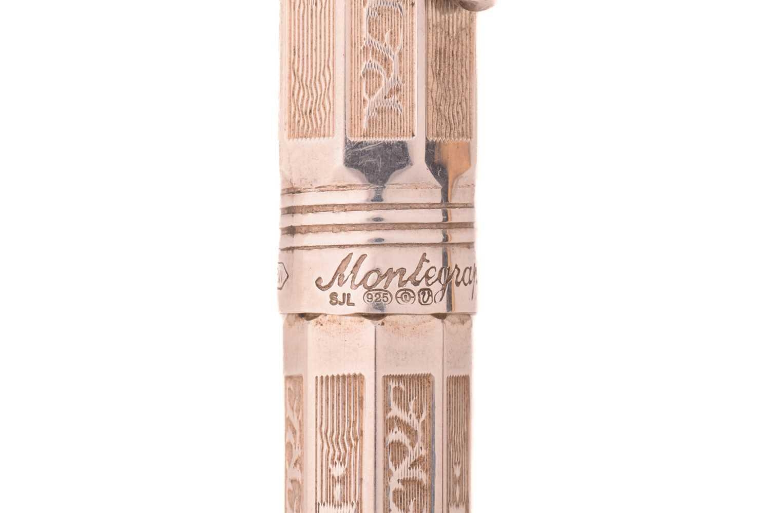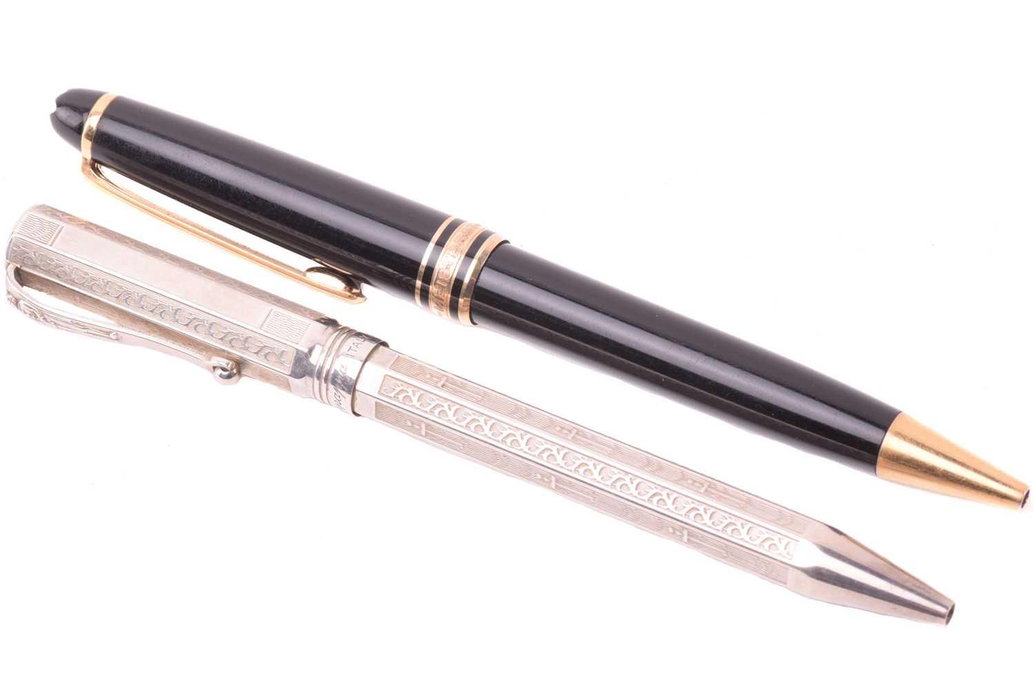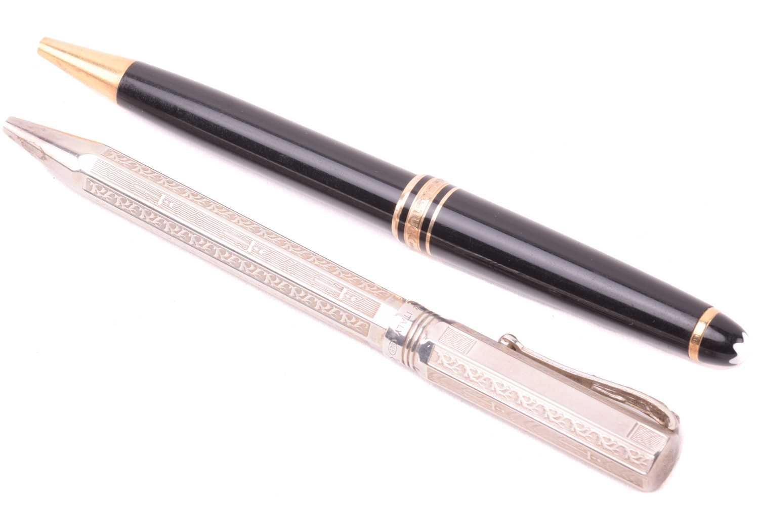 A silver Montegrappa ballpoint pen with engraved decoration, with Italian and English control marks, marked 925, together with a Montblanc Meisterstuck ballpoint pen. (2)