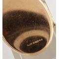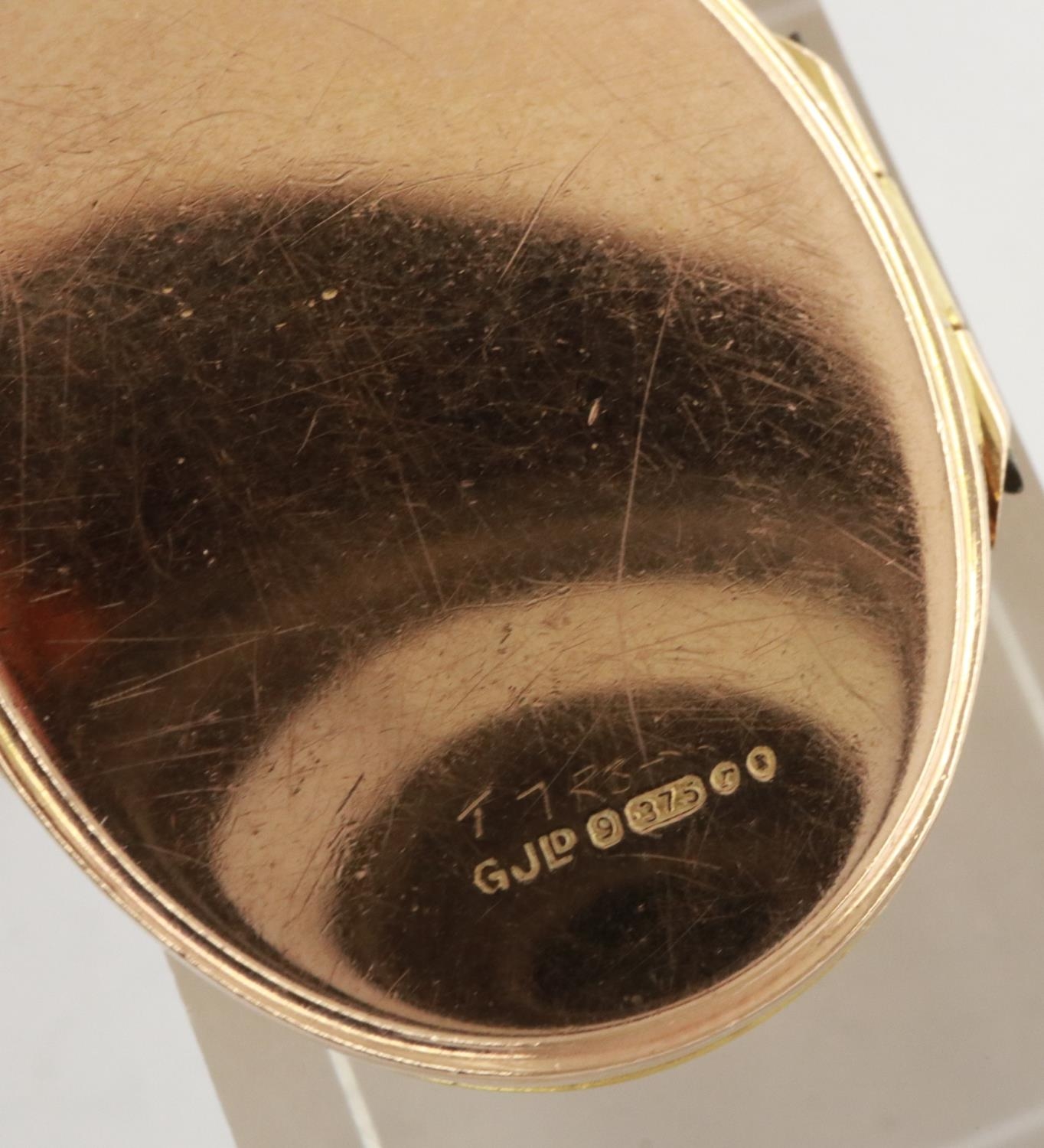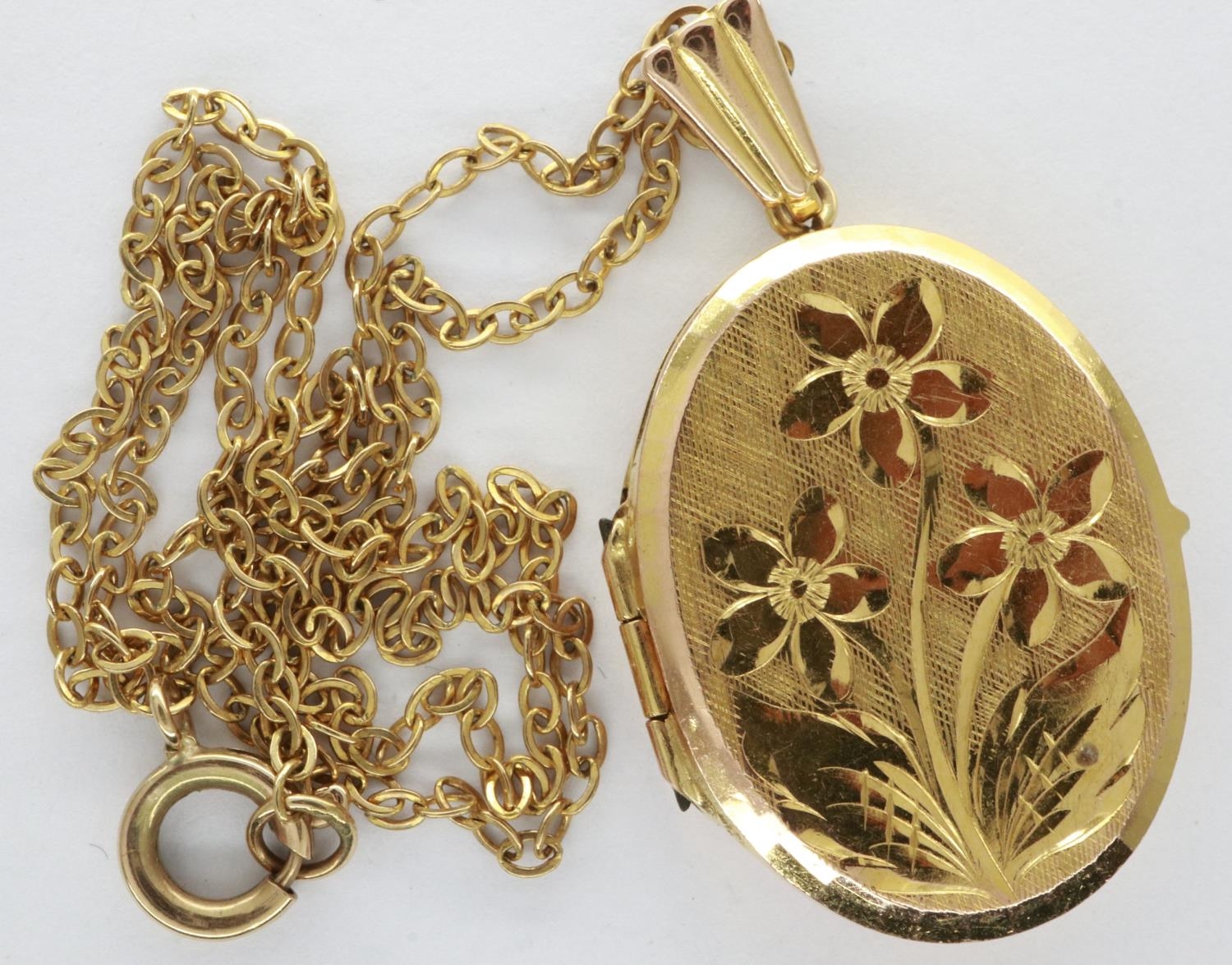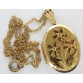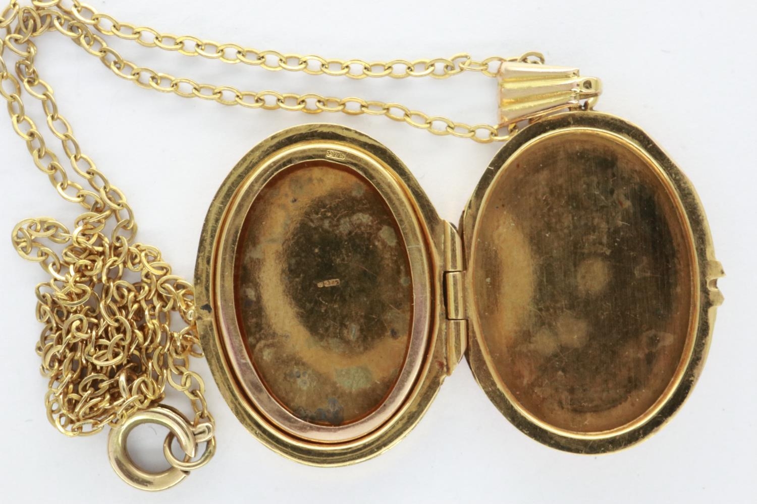 9ct gold oval locket on a 9ct gold chain, chain L: 40 cm, 6.3g. Light scratches to back, no dents to cover, force required to close the locket, once closed latch holds securely. Hinge slightly misshapen, when closed the bottom of the locket is partially open. P&P Group 1 (£14+VAT for the first lot and £1+VAT for subsequent lots)