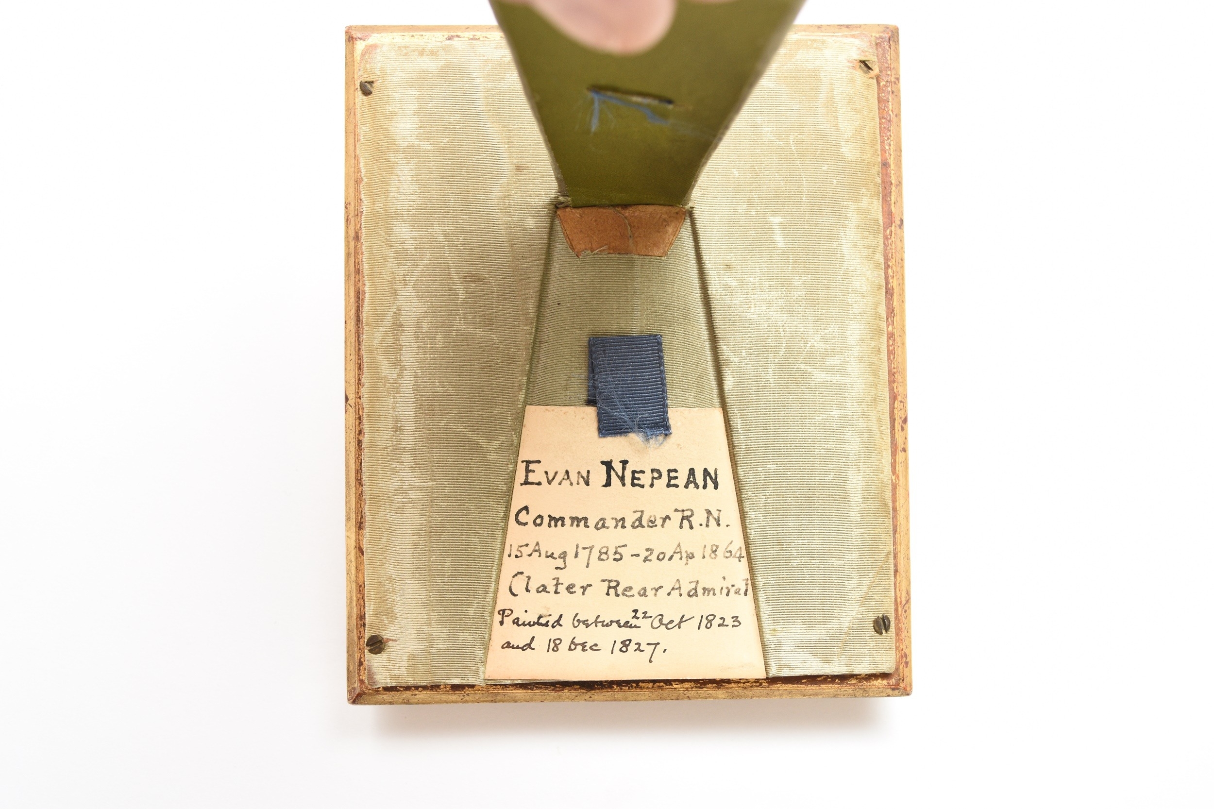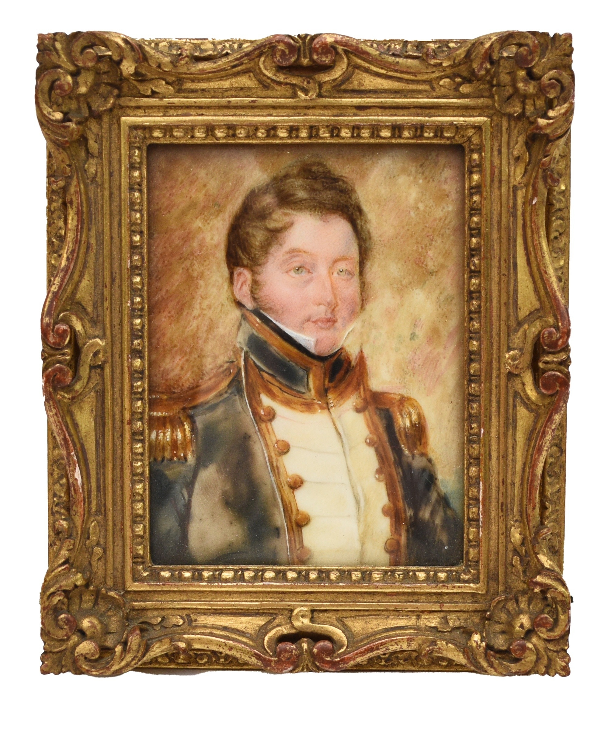British School (19th Century) Portrait Miniature of Evan Nepean, in Royal Navy uniform, watercolour on ivory, 8 x 6 cm, frame 12 x 10 cm Handwritten label to verso 'Evan Nepean commander R.N. 15 Augt 1785 - 20 Ap 1864 (later Rear Admiral) painted between 22 Oct 1823 and 18 Dec 1827' Note: Evan Nepean was the second son of Lieutenant-General Nicholas Nepean and nephew of the First Baronet, Sir Evan Nepean, First Secretary and then Commisioner of the Admiralty. He entered the Navy in 1798. In 1815 he became a Lieutenant and in 1823, a Commander. In 1841 he became a Captain and retired from service in 1862 as a Rear Admiral. Between 1839 and 1841 he was commander of H.M.S.Comus, an eighteen gun sloop on the West India station where he was principally employed in affording protection to British trade during the revoloutionary unrest in New Grenada. In 1844 he sold a large and significant collection of mainly pottery pieces, from Isla Sacrificios, off the Coast of Vera Cruz in West Mexico, to the British Museum. Ivory Exemption certificate number: XA4GBSEU